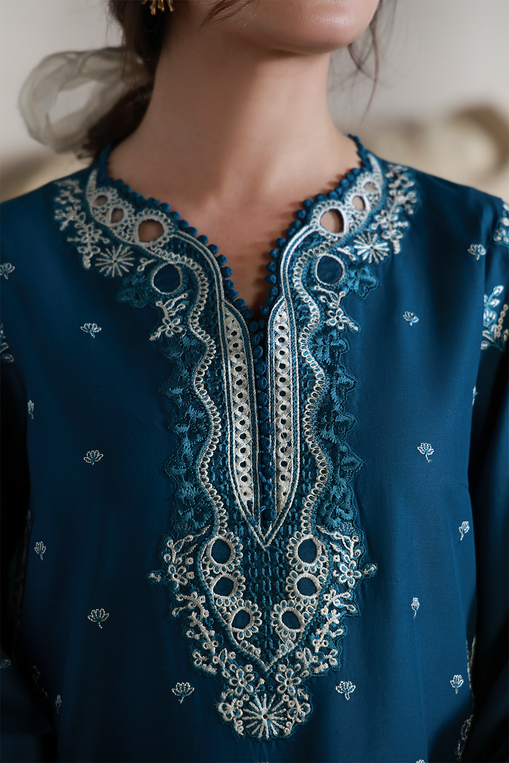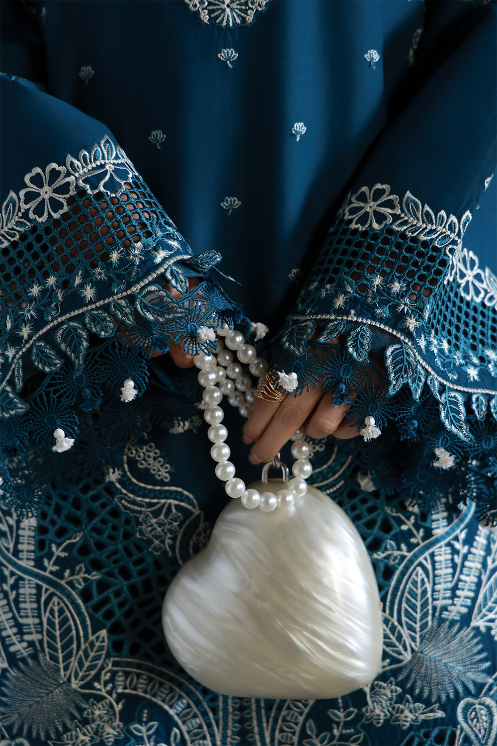 Summary: Step into elegance with the Aabyaan 'Inaya' Pakistani Lawn Suit, gracefully modeled by the stunning Sajal Aly. This exquisite Teal ensemble is crafted from premium Festive Luxury Lawn, making it a breathable yet opulent choice for the Spring/Summer season. The shirt showcases sophisticated laser embroidery and intricate schiffli cutwork on the front and sleeves, blending modern craftsmanship with traditional ethnic wear. Paired with a delicate, embroidered Chiffon dupatta and matching dyed trousers, this outfit exudes grace. Ideal for Eid celebrations, summer weddings, or evening soirees, this Pakistani dress is the quintessence of Party Wear. Shop online to own this chic, laser-cut masterpiece today.