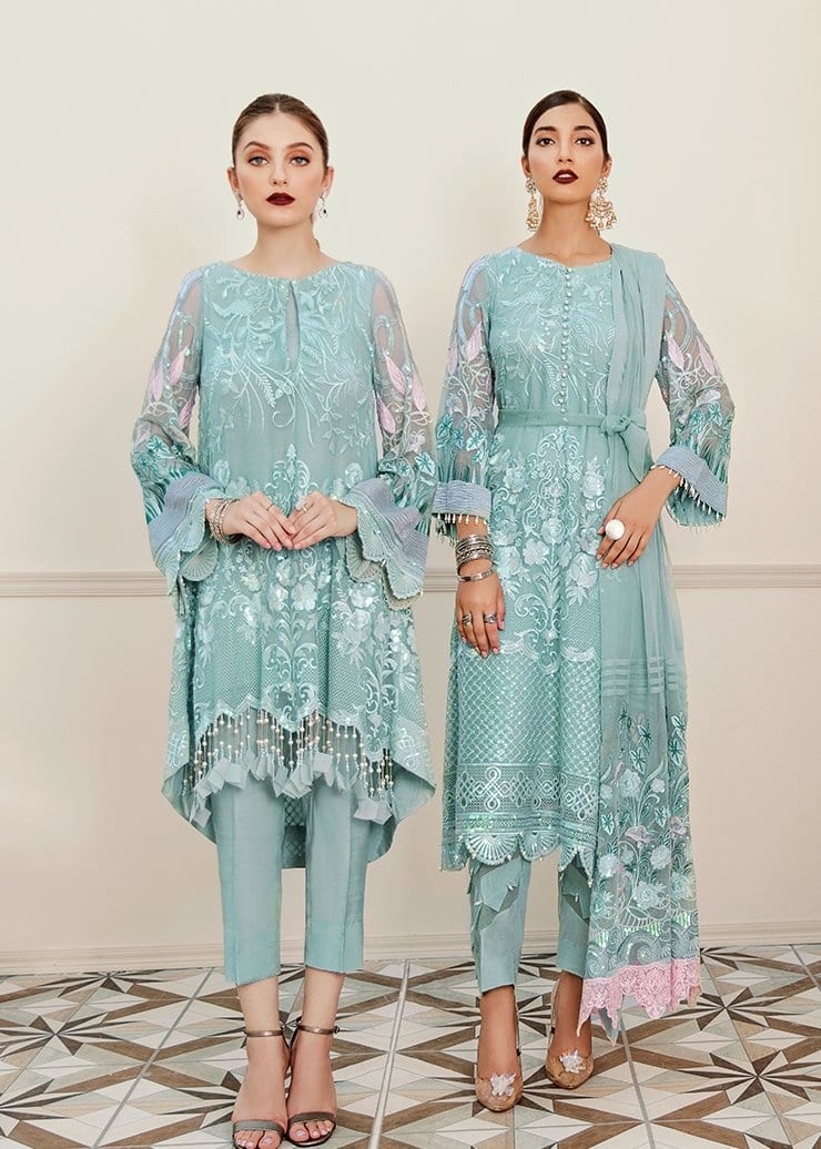 Fabric: Embroidered Shirt Front 1.25 meter on chiffon Embroidered Shirt Back 1.25 meter on chiffon Embroidered Sleeves 0.75 meter on chiffon Embroidered Front and back border 2.5-meter organza Embroidered Front and back border 2.5-meter organza Embroidered Dupatta 3 yard embroidery chiffon Embroidered Dupatta patch 2.5 yard embroidery organza Trouser 2.5-yard raw silk |