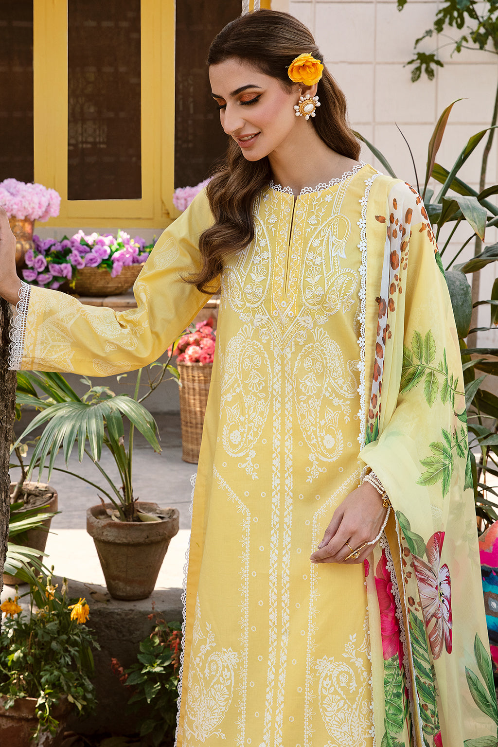 Yellow honey lawn design in paste printing, inspired by floral and paisley motifs. Meraki comes with embroidered neckline and borders along with a digitally printed floral dupatta on silk and block-printed trousers.