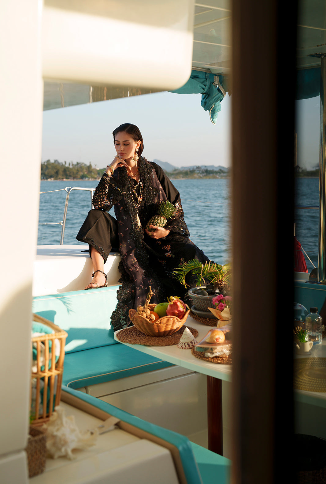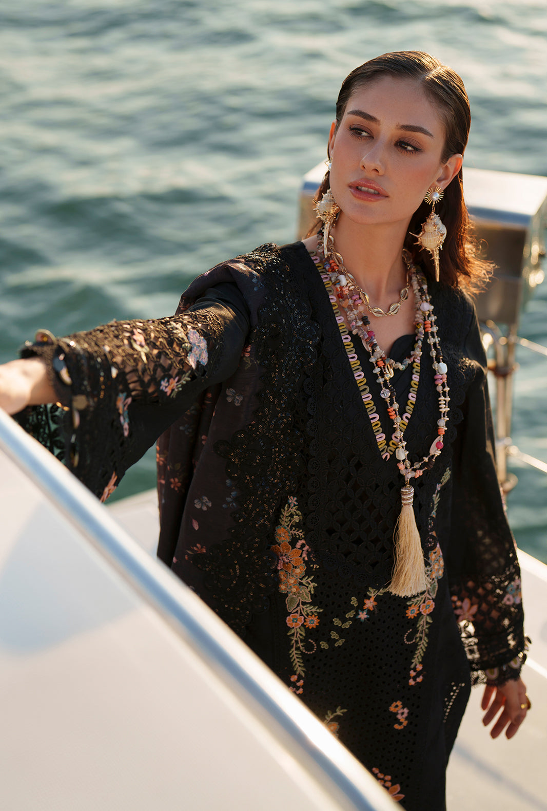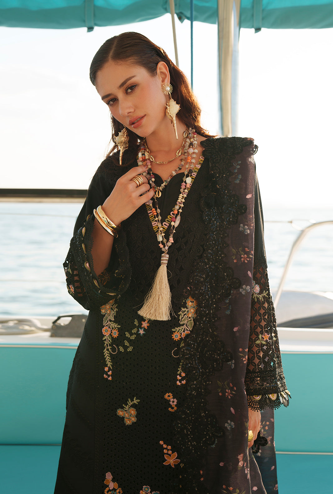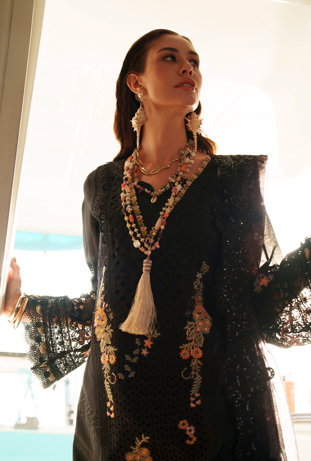 Summary: Step into sophistication with the AJR Evara Luxury Lawn 'Riela' ensemble, a stunning **black** Pakistani suit designed for the modern woman. This unstitched dress features a premium **Lawn** kameez adorned with intricate Chikankari embroidery, offering breathability and style for the **Spring/Summer** season. The shirt is elevated with delicate organza detailing on the neckline and sleeves, adding a touch of sheer luxury. Paired with a printed and embroidered dupatta that drapes beautifully, this outfit captures the essence of festive elegance. The monochromatic black base, enriched with subtle floral accents, makes it an impeccable choice for evening gatherings and **Party Wear**. Whether you are attending a formal dinner or a summer celebration, this Pakistani lawn dress promises a look of timeless grace. Shop this ethnic masterpiece to complete your festive wardrobe.