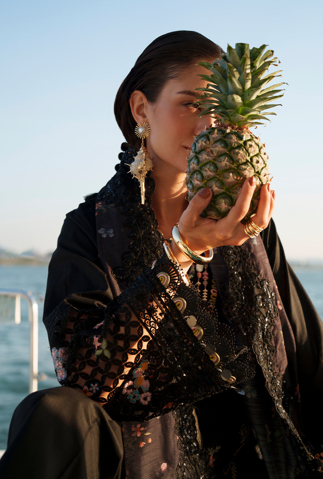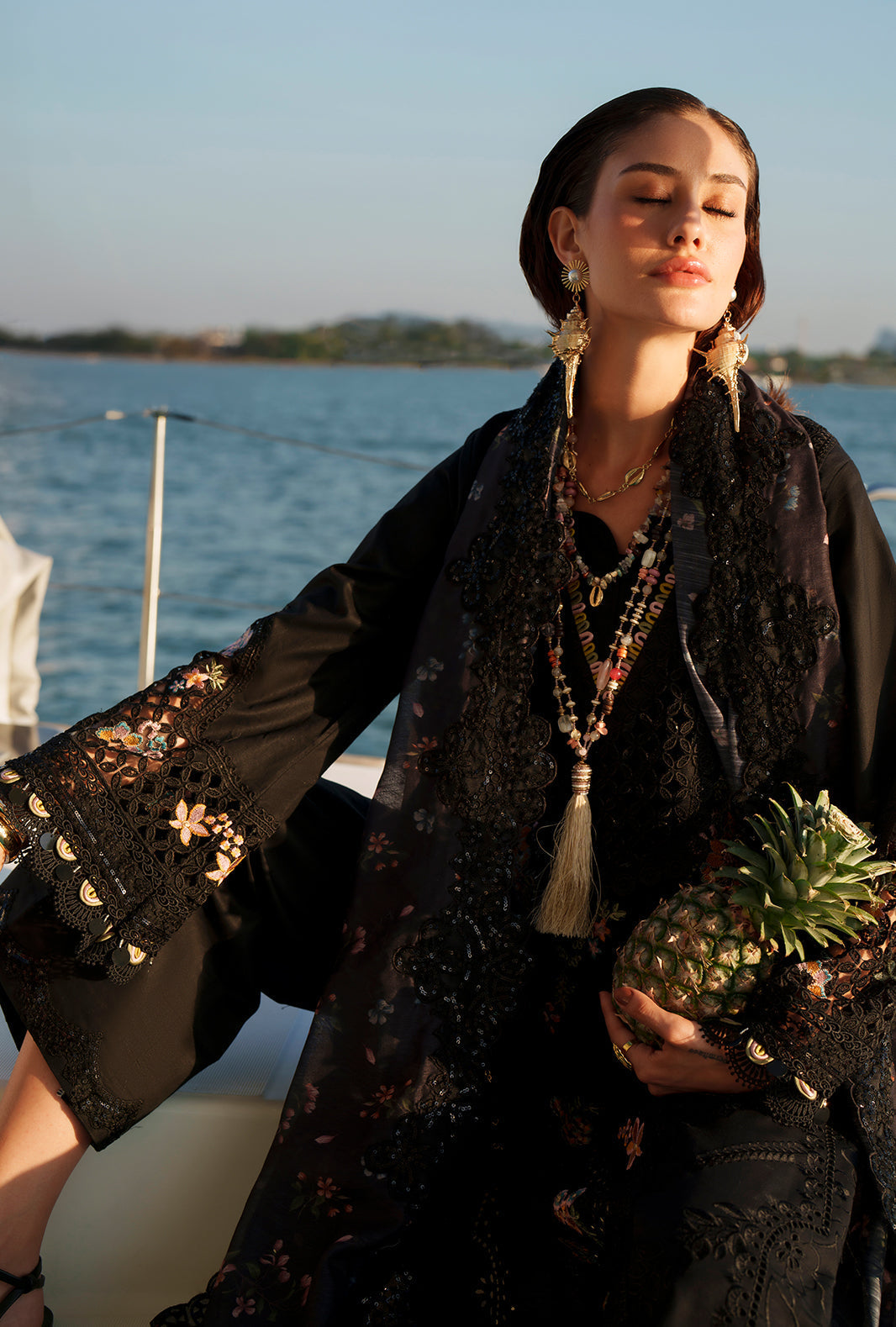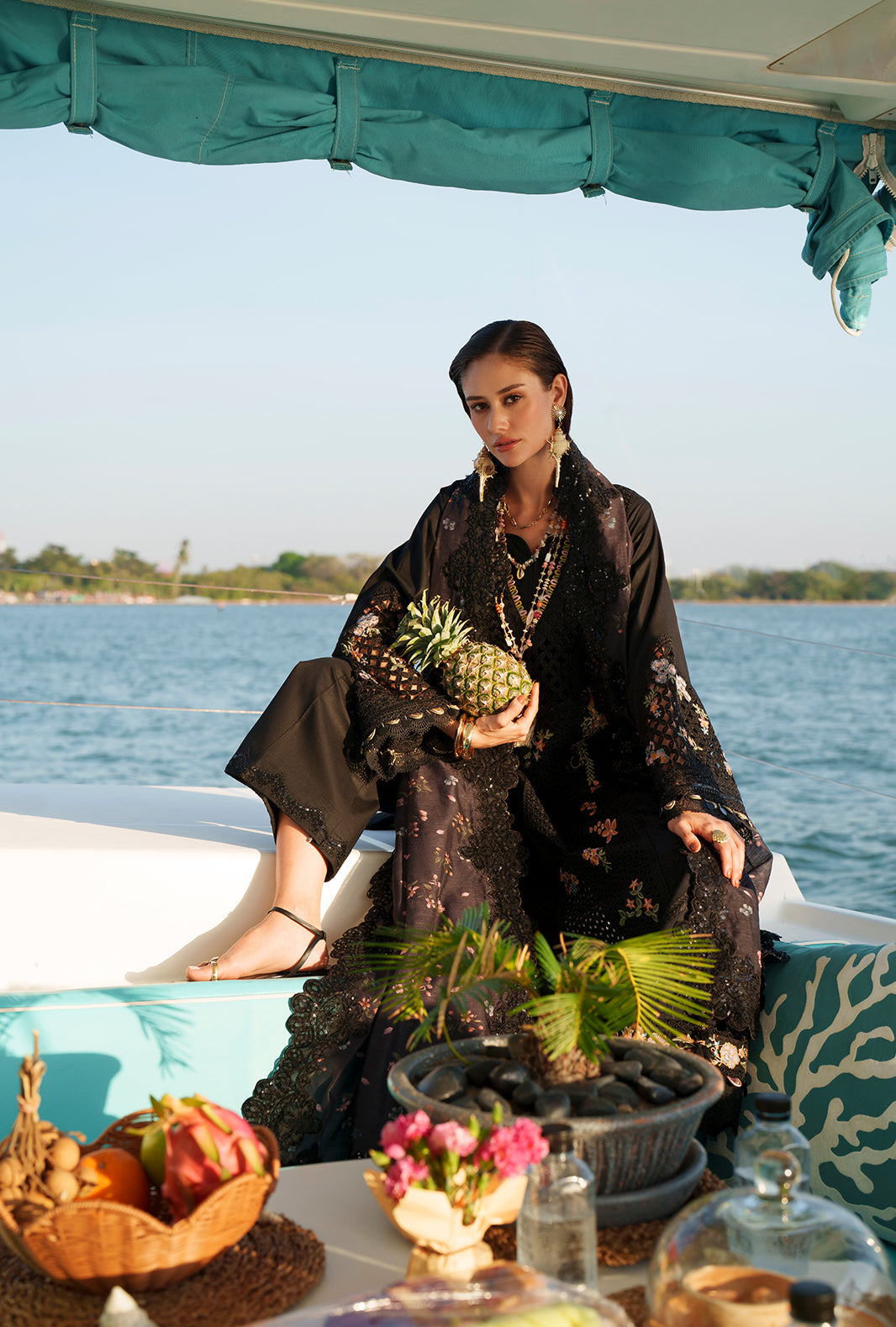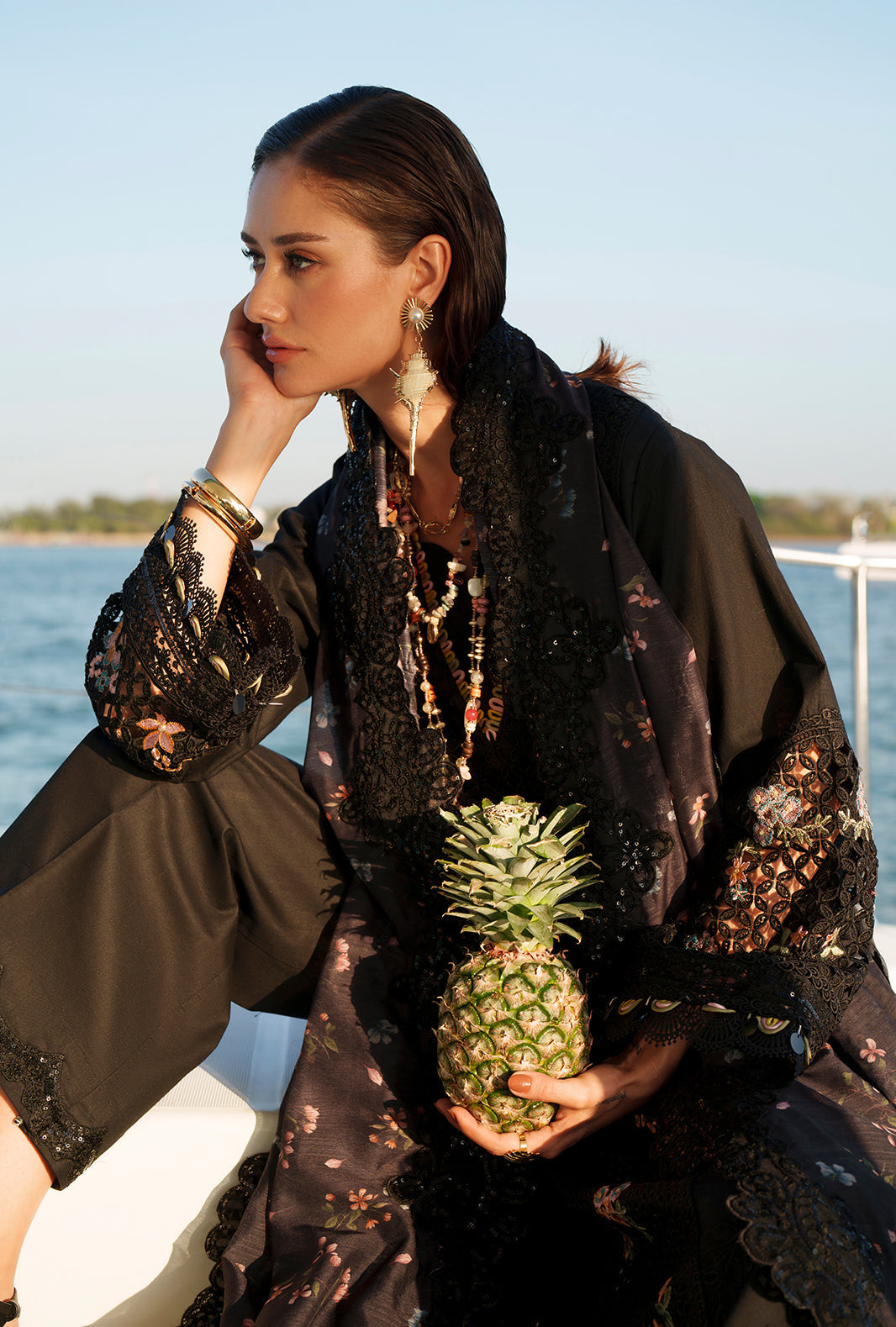 Summary: Step into sophistication with the AJR Evara Luxury Lawn 'Riela' ensemble, a stunning **black** Pakistani suit designed for the modern woman. This unstitched dress features a premium **Lawn** kameez adorned with intricate Chikankari embroidery, offering breathability and style for the **Spring/Summer** season. The shirt is elevated with delicate organza detailing on the neckline and sleeves, adding a touch of sheer luxury. Paired with a printed and embroidered dupatta that drapes beautifully, this outfit captures the essence of festive elegance. The monochromatic black base, enriched with subtle floral accents, makes it an impeccable choice for evening gatherings and **Party Wear**. Whether you are attending a formal dinner or a summer celebration, this Pakistani lawn dress promises a look of timeless grace. Shop this ethnic masterpiece to complete your festive wardrobe.