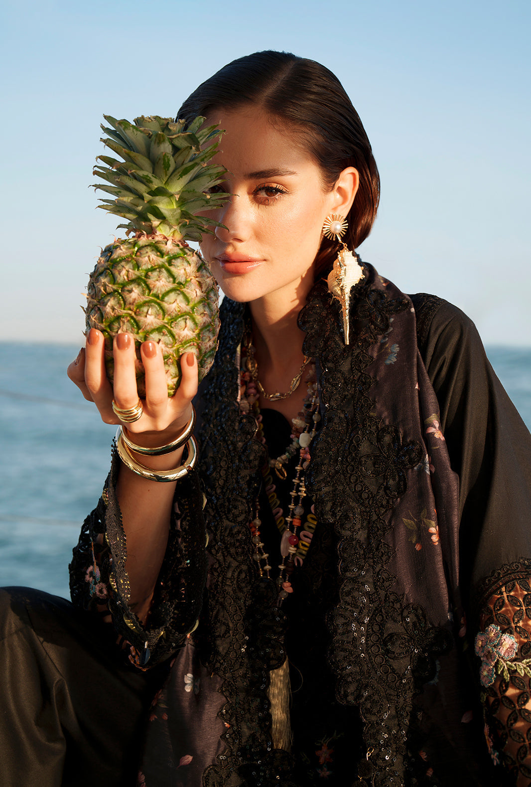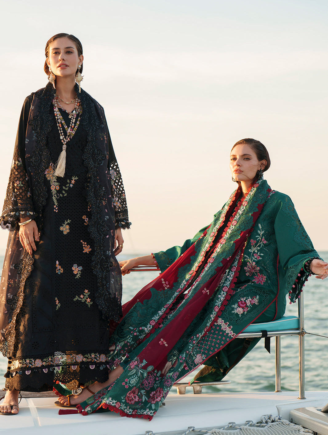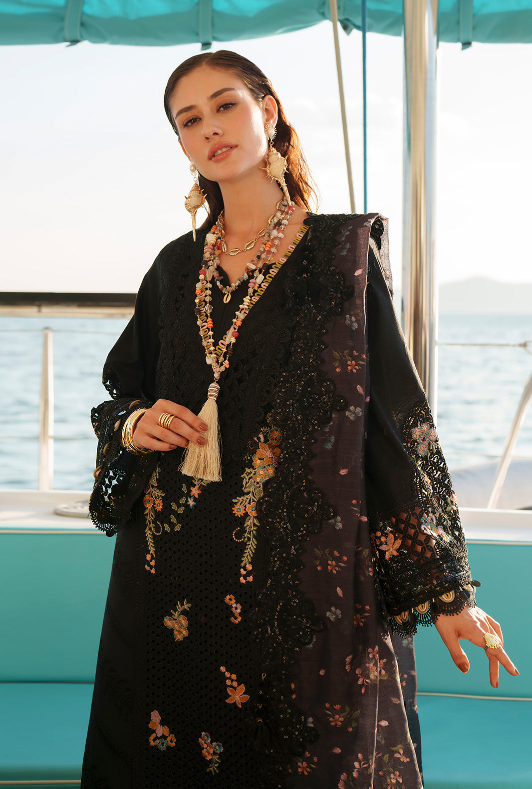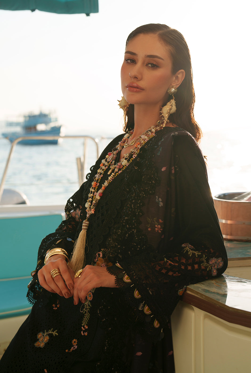 Summary: Step into sophistication with the AJR Evara Luxury Lawn 'Riela' ensemble, a stunning **black** Pakistani suit designed for the modern woman. This unstitched dress features a premium **Lawn** kameez adorned with intricate Chikankari embroidery, offering breathability and style for the **Spring/Summer** season. The shirt is elevated with delicate organza detailing on the neckline and sleeves, adding a touch of sheer luxury. Paired with a printed and embroidered dupatta that drapes beautifully, this outfit captures the essence of festive elegance. The monochromatic black base, enriched with subtle floral accents, makes it an impeccable choice for evening gatherings and **Party Wear**. Whether you are attending a formal dinner or a summer celebration, this Pakistani lawn dress promises a look of timeless grace. Shop this ethnic masterpiece to complete your festive wardrobe.