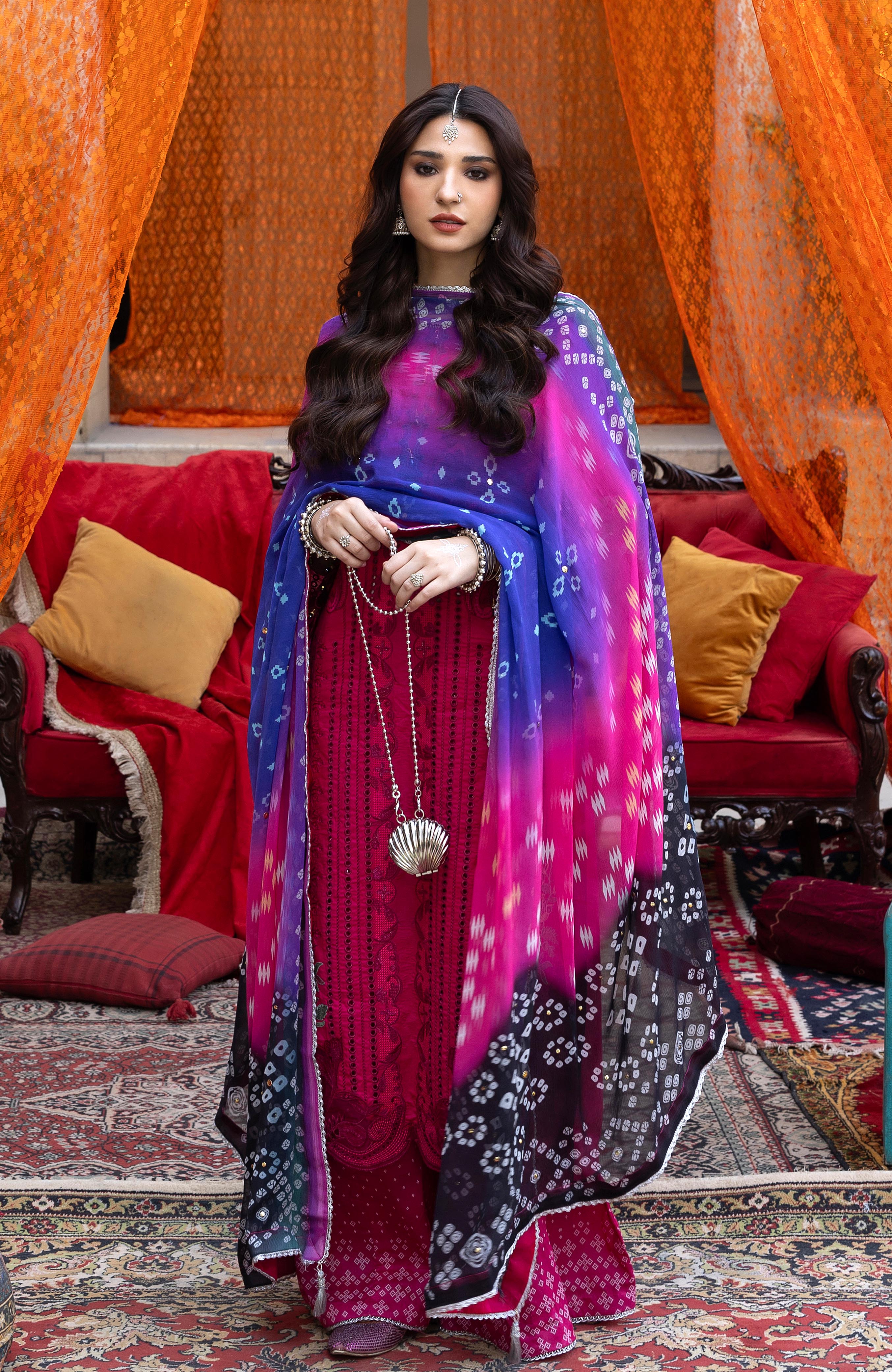 Summary: Step into sophistication with this vibrant Magenta Pakistani Suit from the Al Zohaib Bandhani Lawn collection. Crafted from breathable lawn fabric, this unstitched ethnic wear is a perfect choice for the Spring/Summer season. The kameez is a masterpiece of craftsmanship, featuring intricate Chikankari embroidery on the front, elegantly accented with shimmering sequin work. Luxurious organza bunches and a detailed daman border enhance its formal appeal. This Pakistani Lawn dress beautifully combines traditional artistry with modern style, making it ideal festive clothing for Eid celebrations, weddings, and parties.