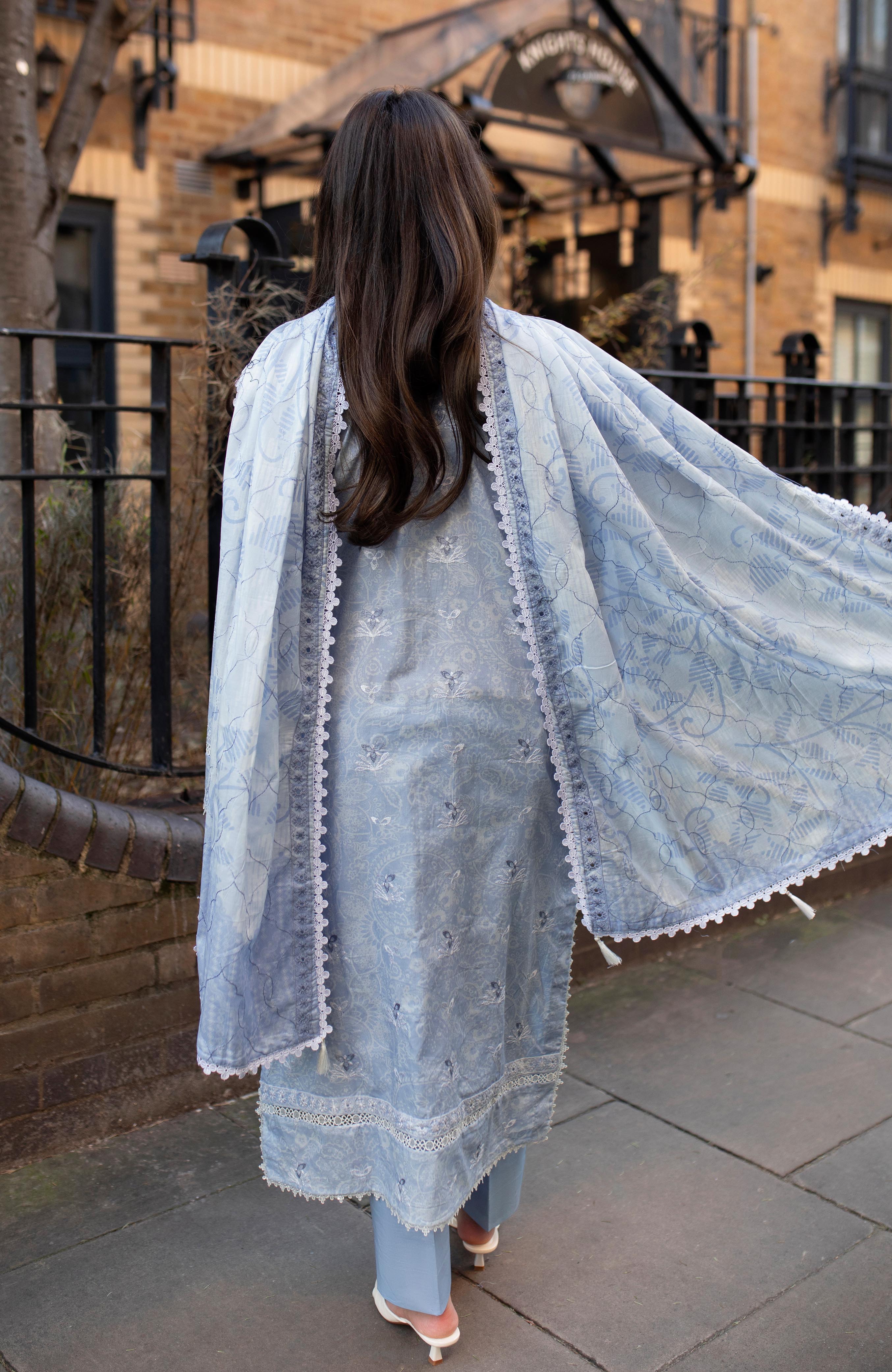 Summary: Embrace timeless elegance with this stunning blue Pakistani suit from the Al Zohaib Dhagakari Lawn collection. Crafted from premium lawn fabric, this unstitched dress is designed for comfort and style during the warm Spring/Summer months. The kameez is beautifully adorned with intricate digital prints and delicate embroidery across the front, back, and sleeves, creating a sophisticated look. This serene blue lawn dress is a versatile piece of ethnic wear, ideal for formal daytime events, social gatherings, or celebrating Eid in style. It offers a graceful silhouette perfect for creating a classic summer outfit.