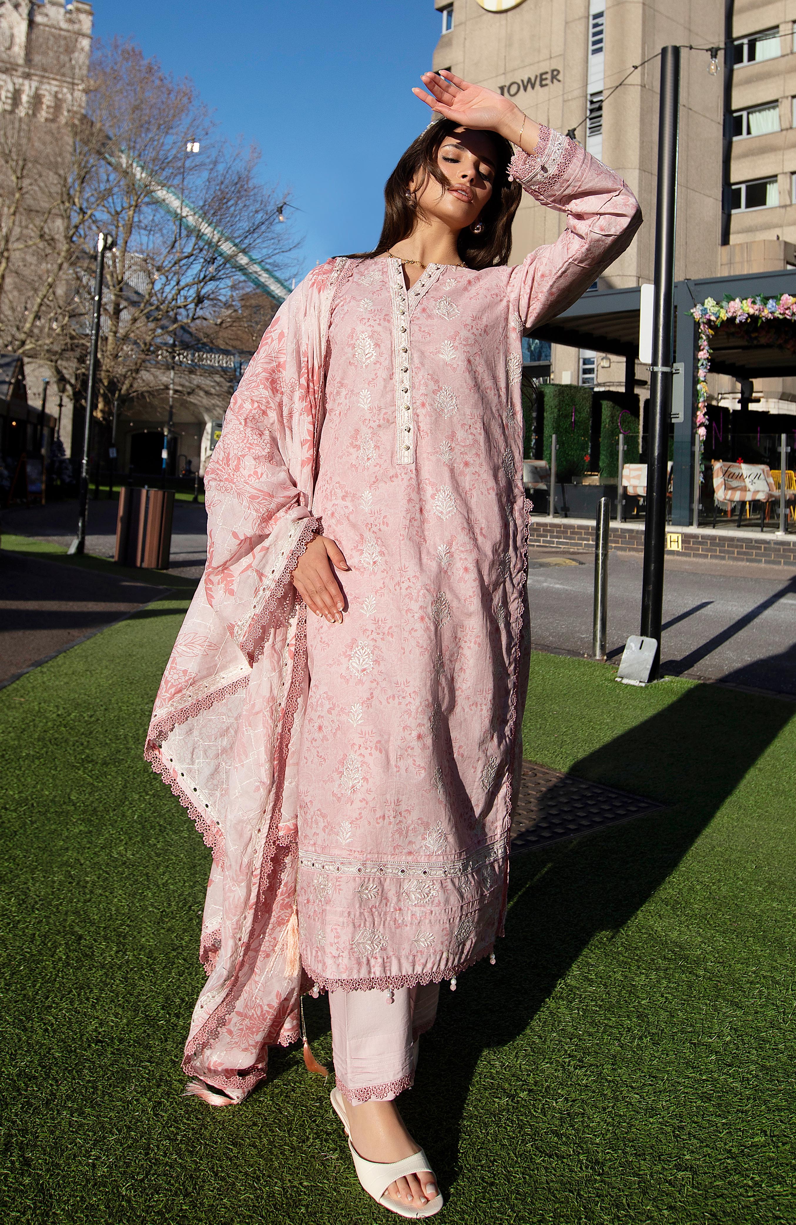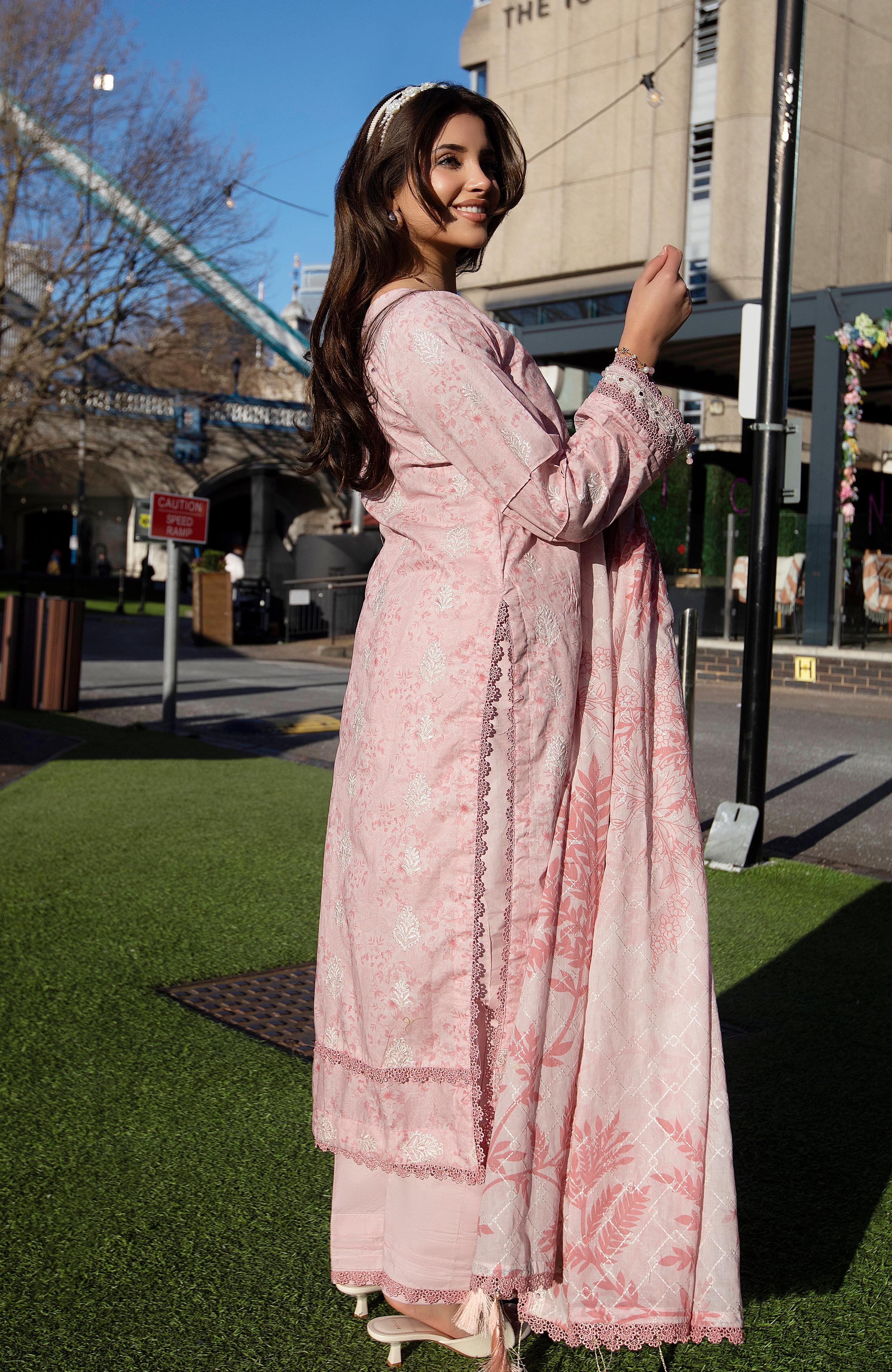 Summary: Embrace timeless elegance with this stunning pink Pakistani suit from the Al Zohaib Dhagakari Lawn collection. Crafted from premium lawn fabric, this unstitched outfit is perfect for the Spring/Summer season, offering breathability and comfort. The kameez features exquisite digital prints and delicate embroidery across the front, back, and sleeves, creating a sophisticated and graceful look. This beautiful ethnic wear ensemble is a versatile addition to any wardrobe, making it an ideal choice for formal daytime events, festive celebrations, or achieving a chic look for Eid.