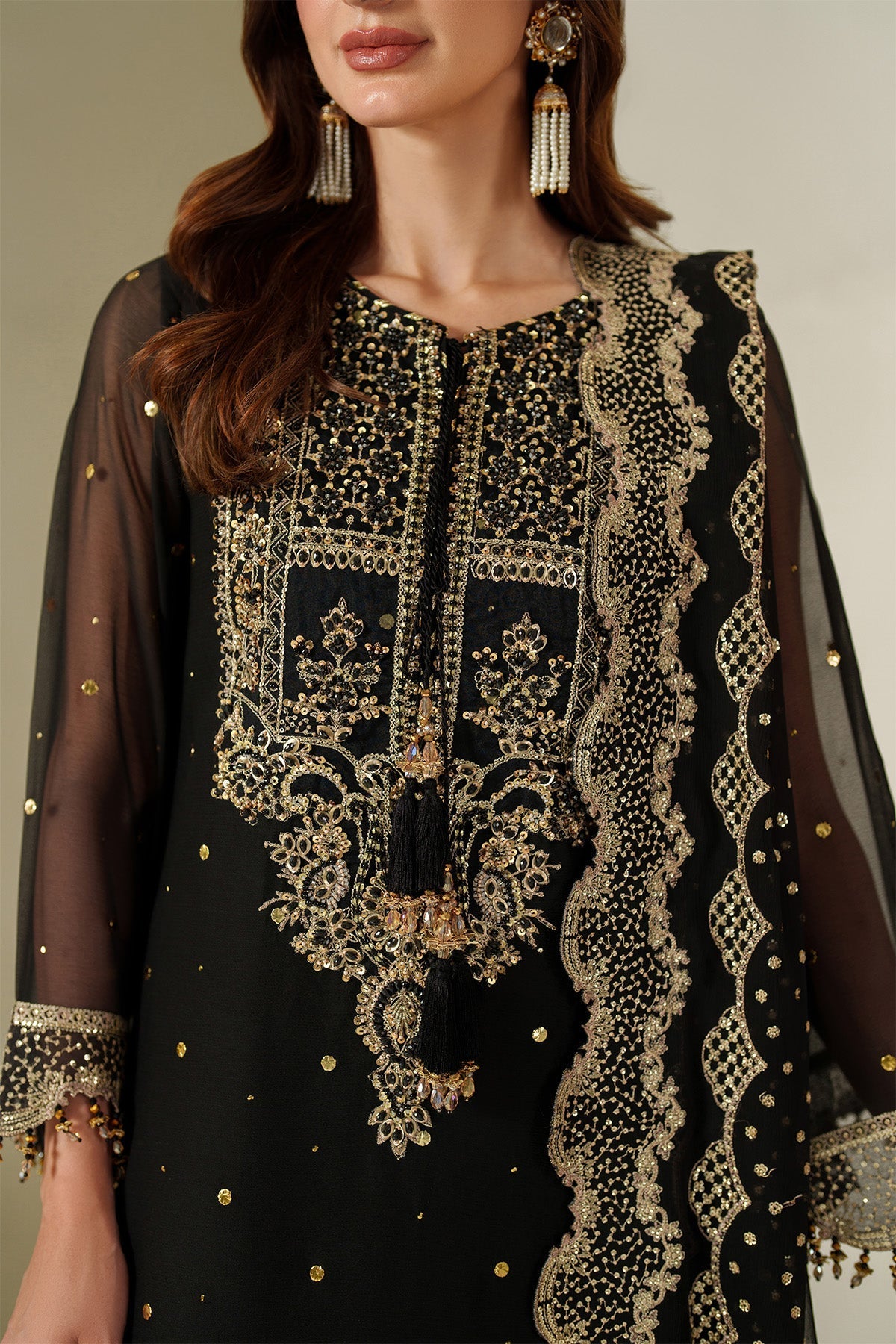 Summary: Embrace regal elegance with this stunning black Pakistani suit from Alizeh's formal collection. Crafted from luxurious chiffon, this ensemble is perfect for Spring/Summer weddings and evening events. The kameez is a masterpiece of handmade craftsmanship, featuring intricate Mukesh work and shimmering gold thread embroidery. A richly detailed organza patch on the neckline showcases geometric patterns with gold zari, sequins, and beadwork, adding a touch of grandeur. The delicate chiffon sleeves are adorned with scattered Mukesh detailing, making this formal ethnic wear a blend of tradition and modernity. It's an ideal choice for a sophisticated wedding guest look.