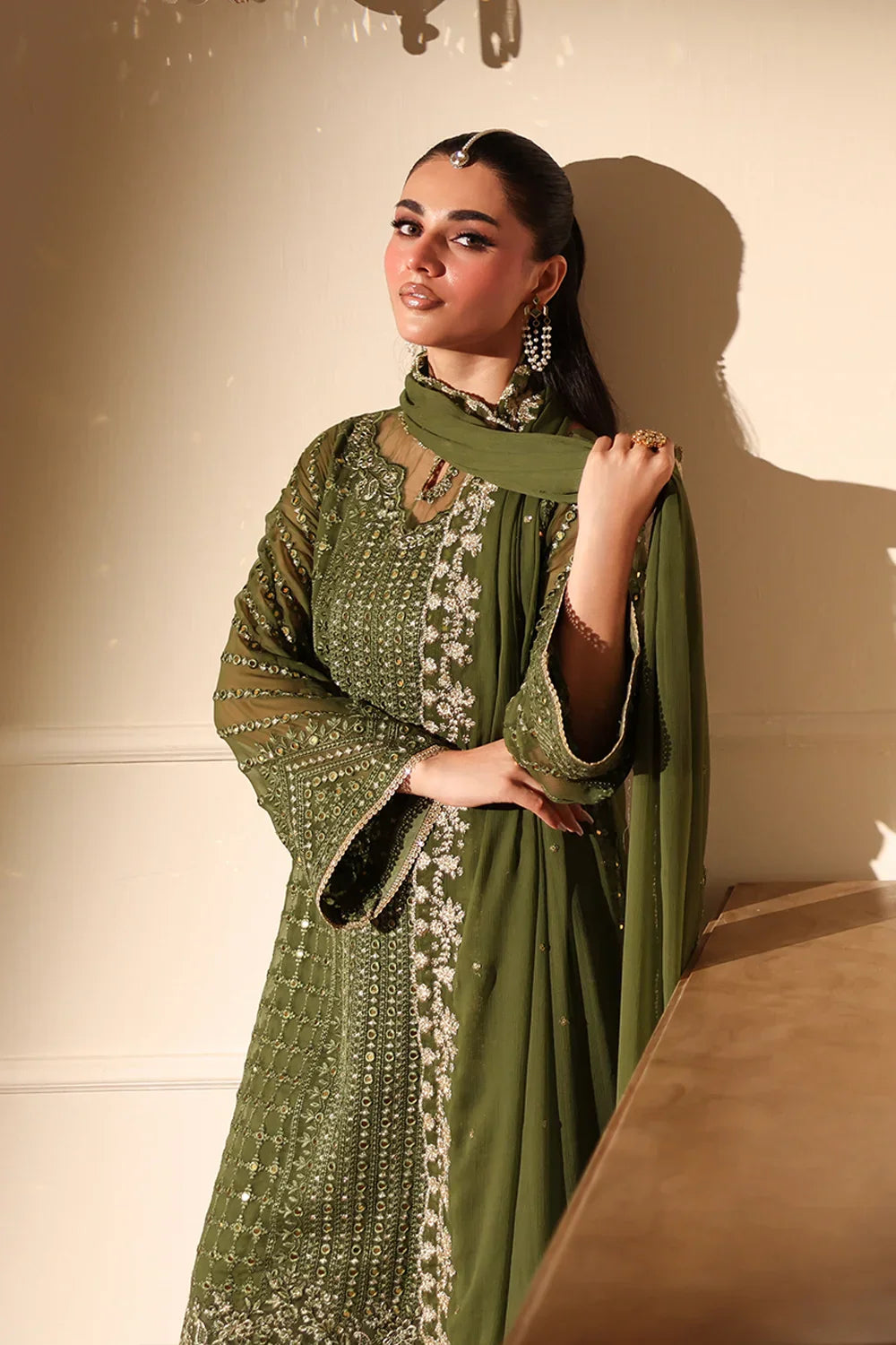 Summary: Embrace sophisticated elegance with this Olive green Pakistani suit from Azure's luxury collection. This stunning formal wear is crafted from delicate chiffon, a lightweight fabric ideal for Spring/Summer festivities. The kameez is adorned with intricate sequin embroidery on the front and sleeves, adding a subtle shimmer. The rich olive hue makes this Pakistani dress a perfect choice for Mehndi ceremonies or Eid celebrations. This ethnic wear blends traditional craftsmanship with modern style, making it a standout festive outfit for any formal occasion or wedding party.
