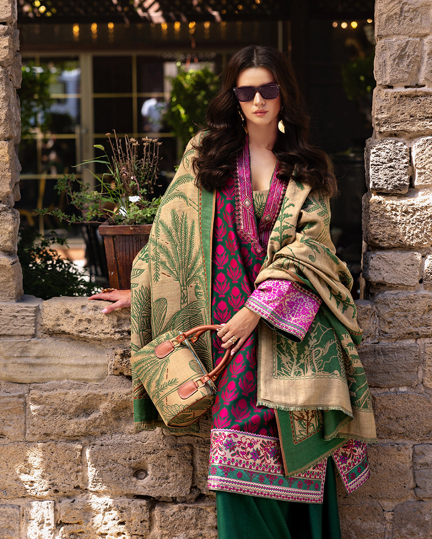 Summary: Embrace winter elegance with the Esmel 'Isolde' suit, a masterpiece from the Lueur D'Orient Winter collection. This unstitched Pakistani dress features a luxurious dark green shirt crafted from rich jacquard viscose, perfect for the colder seasons. The design is elevated with intricate silk embroidery on the neckline, daman, and sleeves, adding a touch of formal sophistication. Paired with a cozy woolen shawl, this ethnic wear ensemble exudes grace. Ideal for winter weddings, formal gatherings, and festive parties, this outfit is a statement of timeless style and cultural heritage.