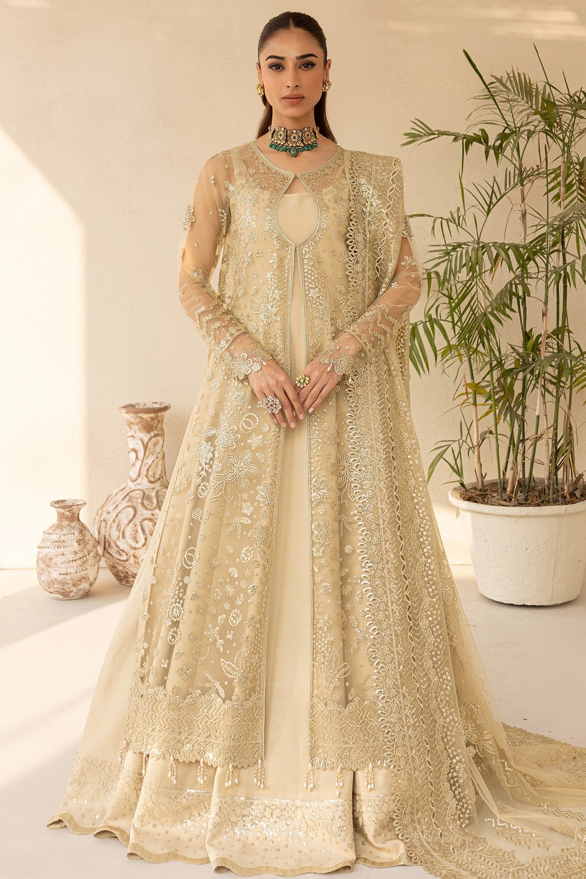 Summary: Embrace regal elegance with the Farasha 'Golden Aura' Pakistani suit. This exquisite formal wear is crafted from delicate cream-colored net, making it a light and airy choice for spring/summer festivities. The kameez features intricately embroidered front panels, back, and sleeves, creating a luxurious and dimensional look. The classic cream and gold combination makes this Pakistani dress a perfect statement piece for weddings, Nikah ceremonies, or grand Eid celebrations. As a standout piece of ethnic wear, this unstitched ensemble promises a bespoke fit. Shop this festive outfit for a look of timeless sophistication at your next grand event.