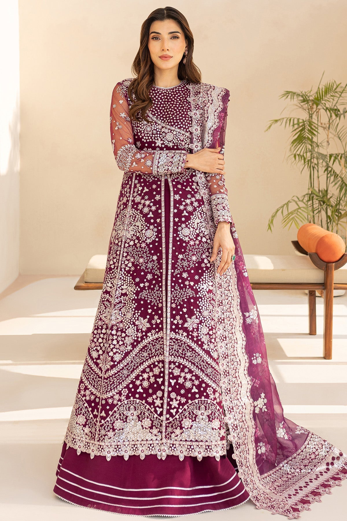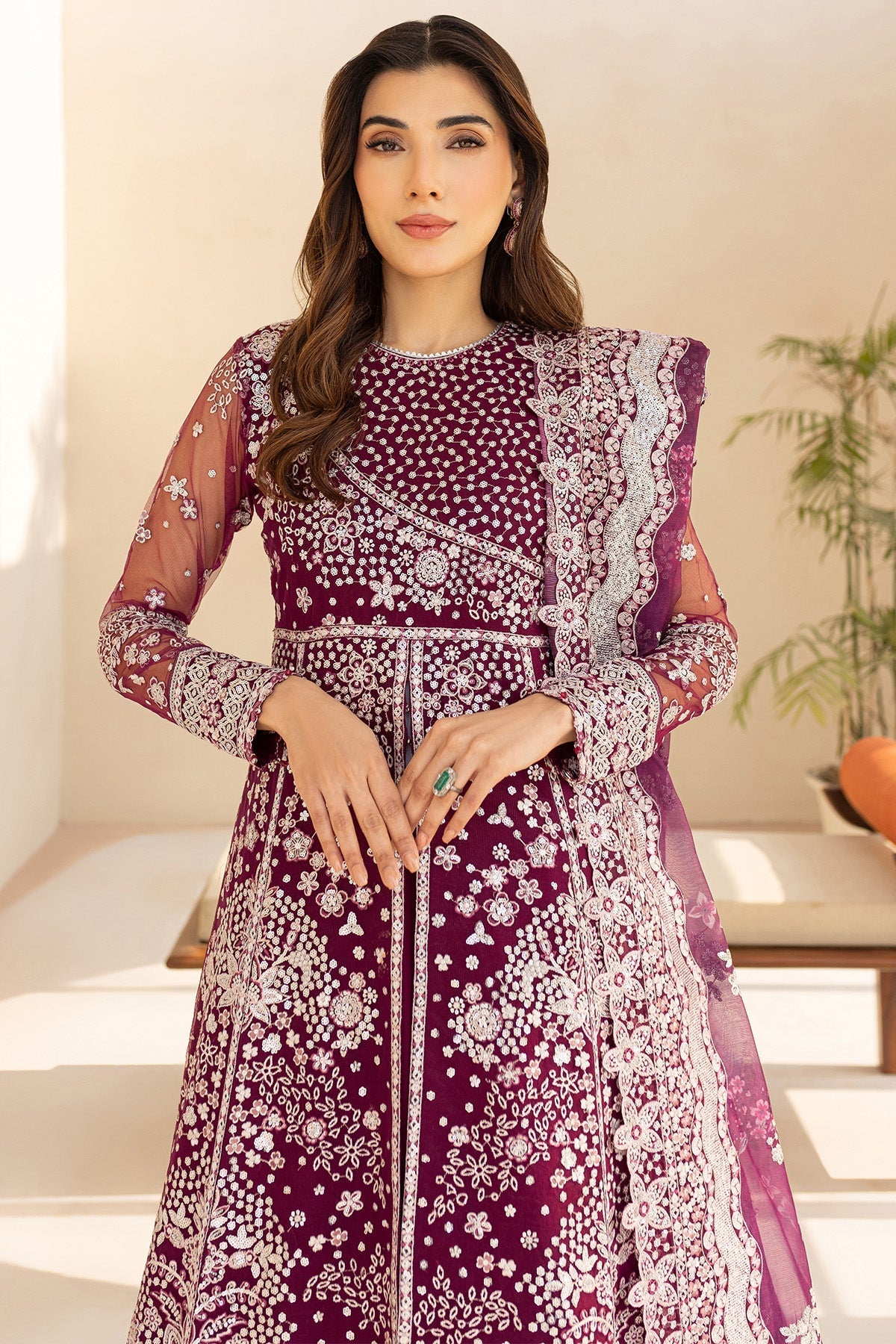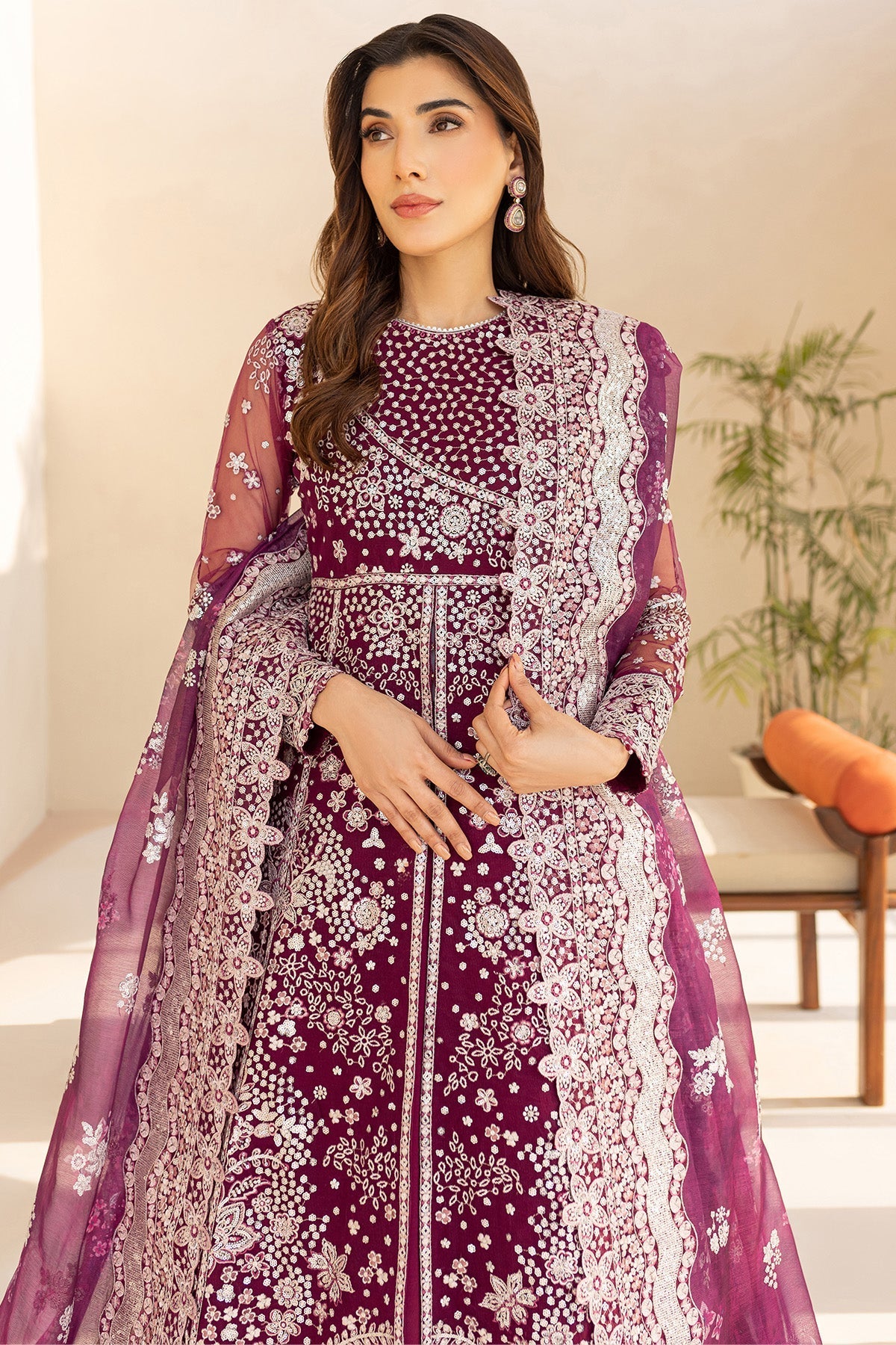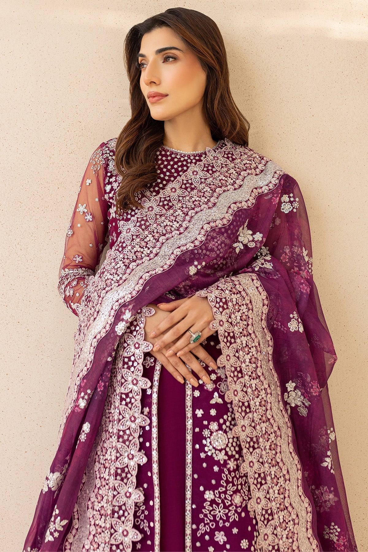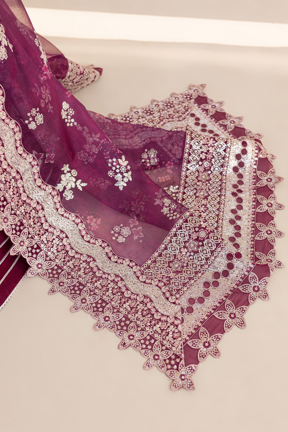 Summary: Step into sophistication with the 'Merlot Dust' luxury formal Pakistani suit. This magnificent purple ensemble is intricately crafted from fine embroidered net, offering a regal yet airy feel perfect for spring and summer festivities. The kameez is a masterpiece of design, featuring exquisite, heavy embroidery that flows from the bodice down through the panels. As a quintessential example of Pakistani wedding wear, its deep, enchanting hue and opulent detailing make it an impeccable choice for grand celebrations and formal events. This elegant ethnic outfit ensures a memorable presence, ideal for a wedding guest or any formal gathering.