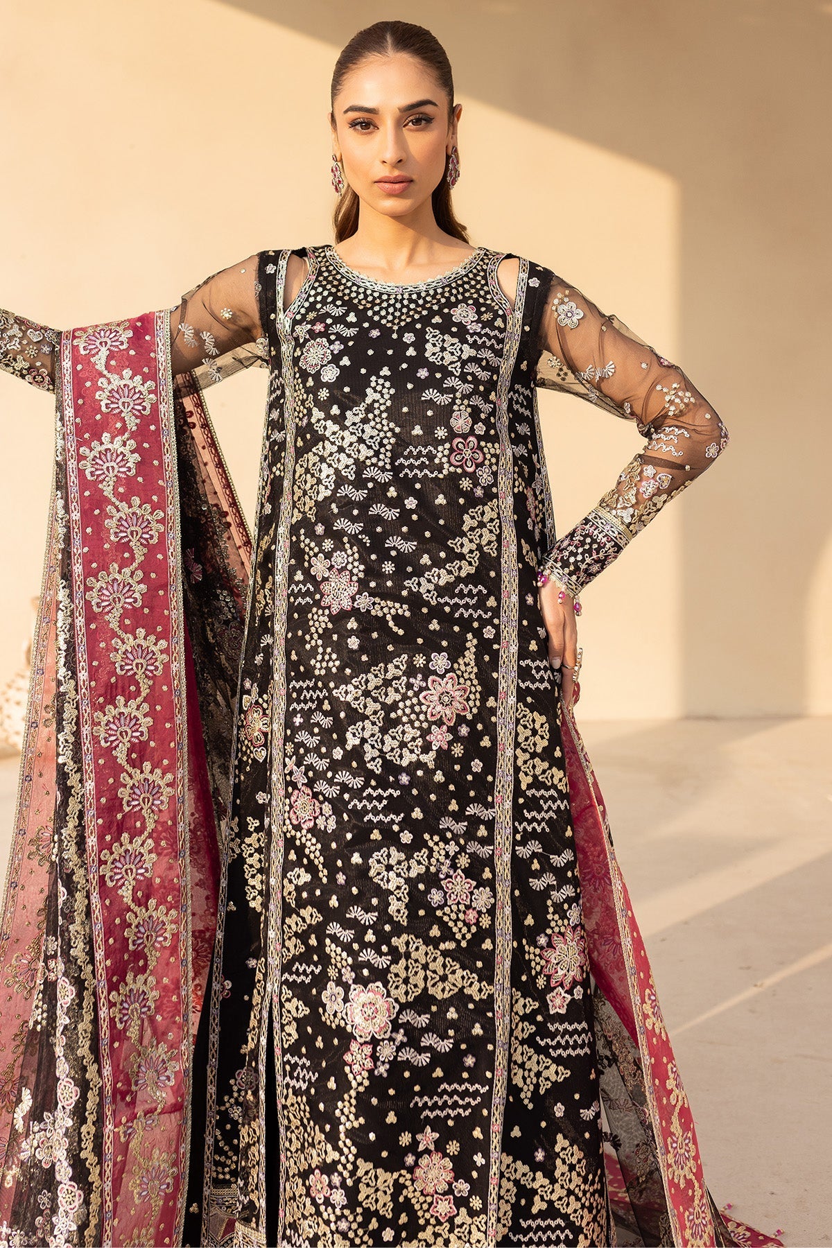 Summary: Embrace timeless elegance with the 'Stardust Noir' by Farasha, a stunning black Pakistani suit from their luxury formals collection. This exquisite outfit is crafted from delicate embroidered net, making it a breathable and glamorous choice for Spring/Summer festivities. The long kameez features intricate, dazzling embroidery on the front, back, and sheer sleeves. As a premier example of Pakistani formal wear, this black ensemble is perfect for evening functions, making it an ideal choice for a wedding guest outfit or any grand celebration. Step into the spotlight with this sophisticated ethnic wear.