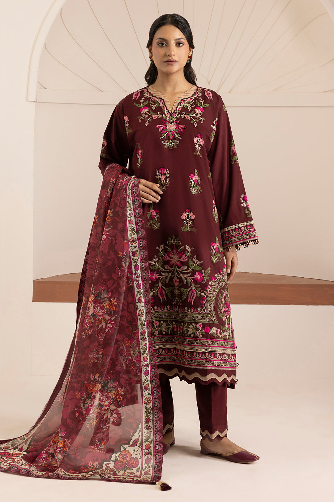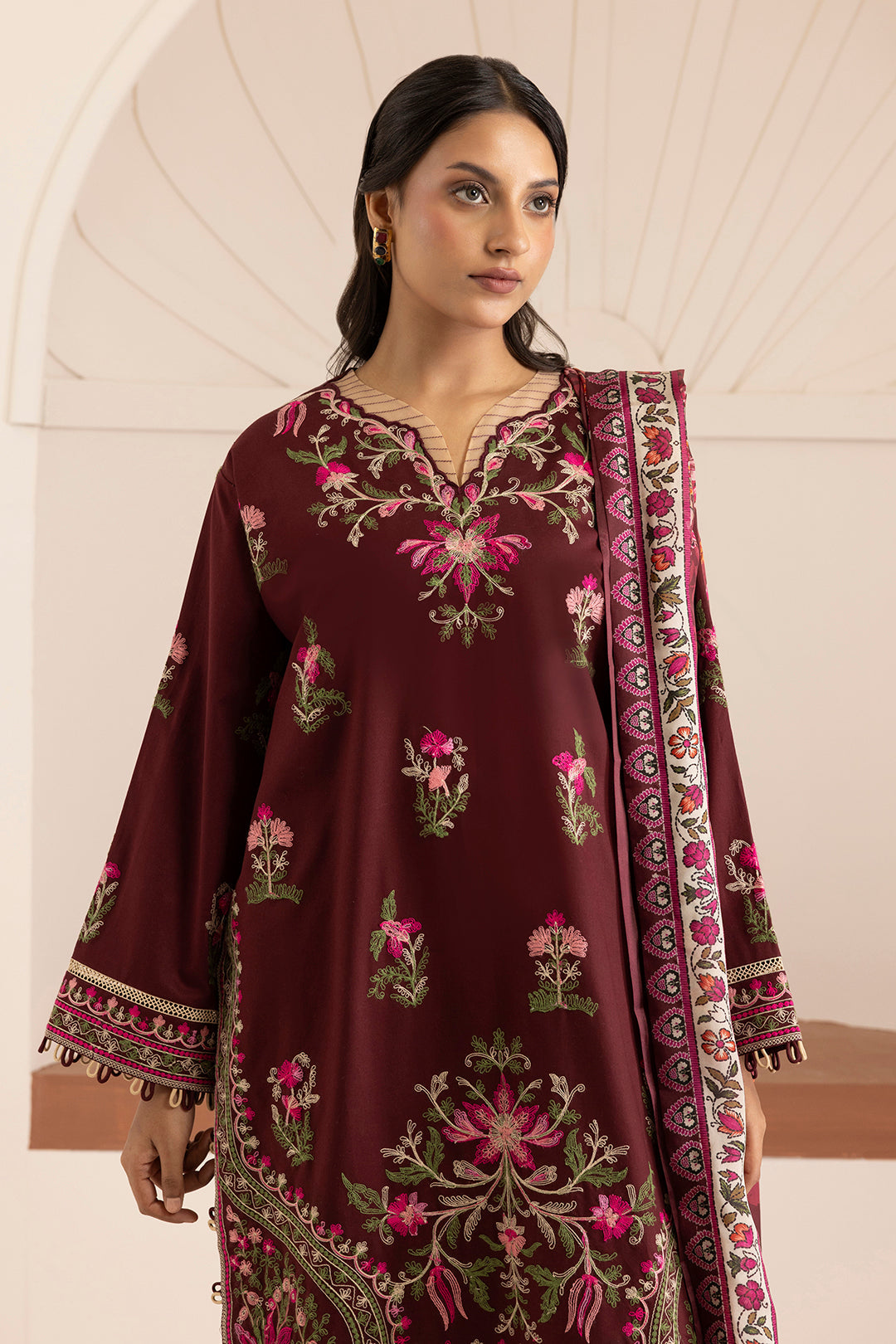 Summary: Embrace timeless elegance with this stunning maroon Pakistani suit from Zellbury. Crafted from luxurious Cotton Satin, this unstitched dress material is perfect for the Fall/Winter season, offering both comfort and a sophisticated sheen. The kameez features exquisite floral embroidery adorning the neckline and hem, creating a look of classic grace. This maroon formal wear is a versatile addition to any ethnic wardrobe, making it an ideal choice for formal dinners, festive gatherings, or as elegant wedding guest attire. Its rich color and detailed craftsmanship define it as premium Pakistani formal clothing.