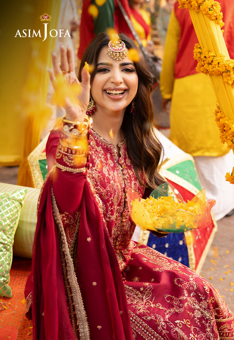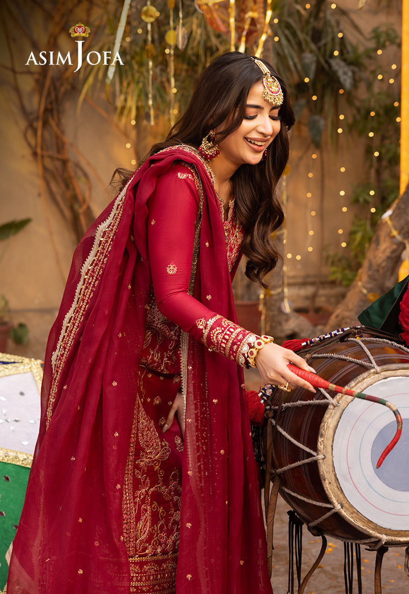 Enter a realm of ruby reverie with this red ensemble from “Asim Jofa” collection, A vision of elegance and allure. Like the depths of a precious gemstone, the rich red hue is adorned with the glimmering beauty of gold zariwork and the delicate charm of pink threadwork illuminated by the radiant sparkle of gold cupped sequins. The shirt is adorned with intricate acanthus motifs which tells tales of timeless beauty and grace like whispers of ancient legends. Paired with an embroidered dupatta, it's a journey into a world of enchantment and splendor where every stitch is a testament to the brilliance of craftsmanship and artistry.