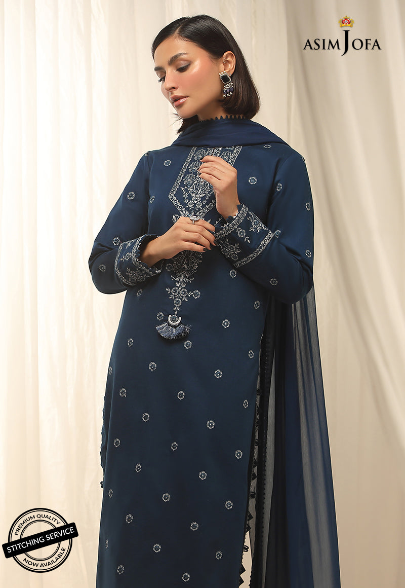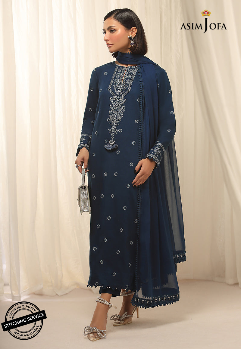 Redefine beauty in this sumptuous Prussian blue ensemble constructed from zari and machine embroidery. Complemented with matching pants and chiffon dupatta. Be the epitome of sophistication in this stunning outfit to style at formal events.