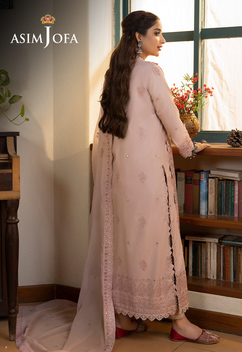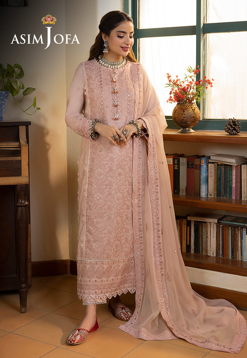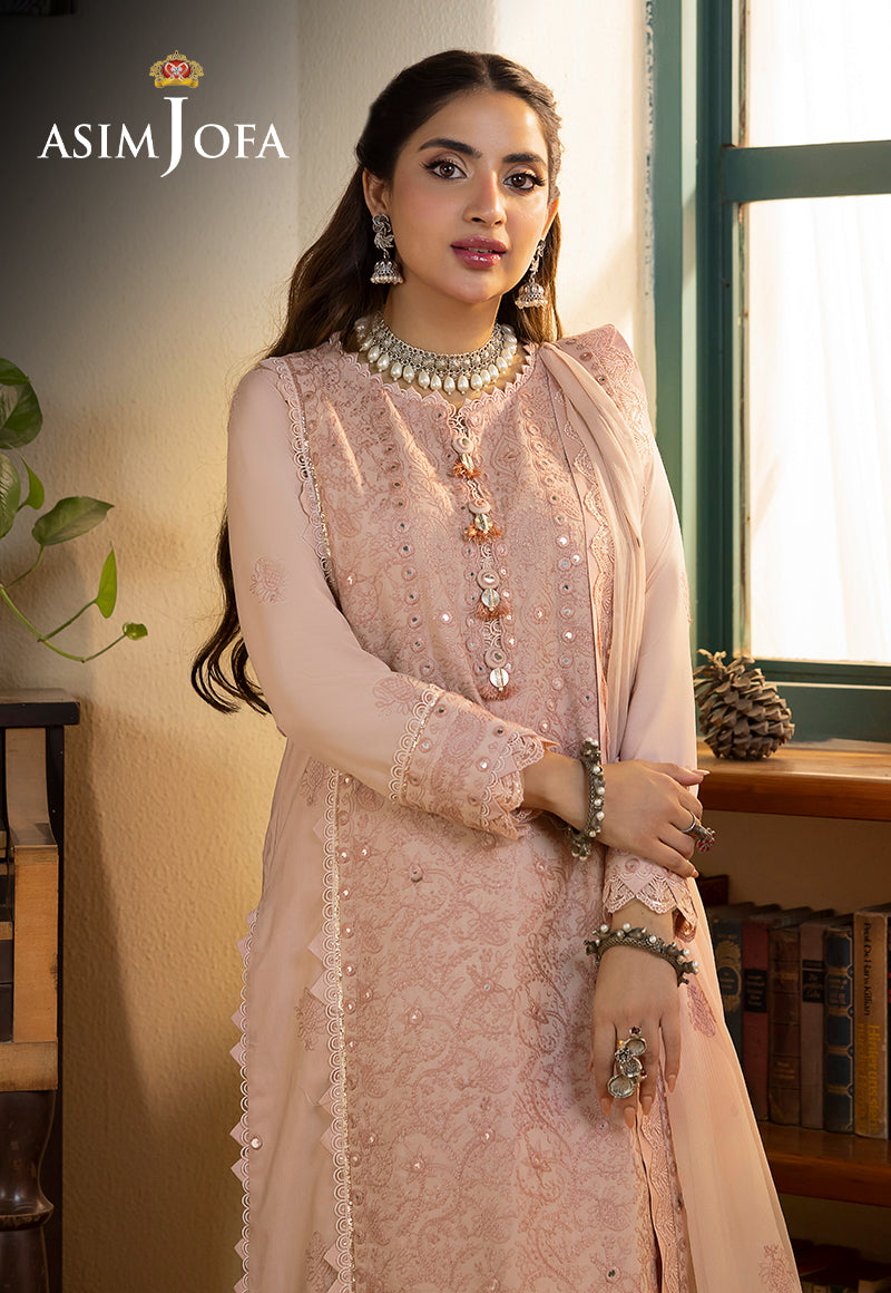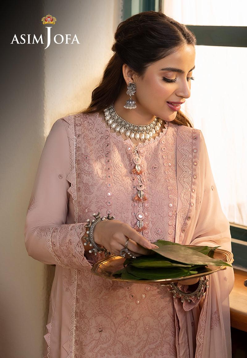 Fabric: Evoke the whispers of tradition with our ""Shadow Work"" collection, where tea pink hues become a canvas of elegance. Saboor Aly graces this ensemble, embodying the grace of threadwork that carve the shirt in intricate beauty. The Lockwood liberty embroidery is a homage to heritage, graces the shirt, while paisley elements twirl along the borders, like echoes from the past. Sequins twinkle like memories, adorning the dupatta's borders and the neckline and sleeves, creates an ensemble that's a fusion of tradition and style. Step into a world where threads carry the whispers of tea pink elegance. DESIGN DETAILS: Embroidered center panel on lawn silk 1.25 meter embroidered chan for back & right left side panels on lawn silk Pair of embroidered sleeves with border on lawn silk 30'' embroidered border for front daman on lawn silk 2.5 meter embroidered dupatta on chiffon 1.5 meter dyed lawn silk for trouser |