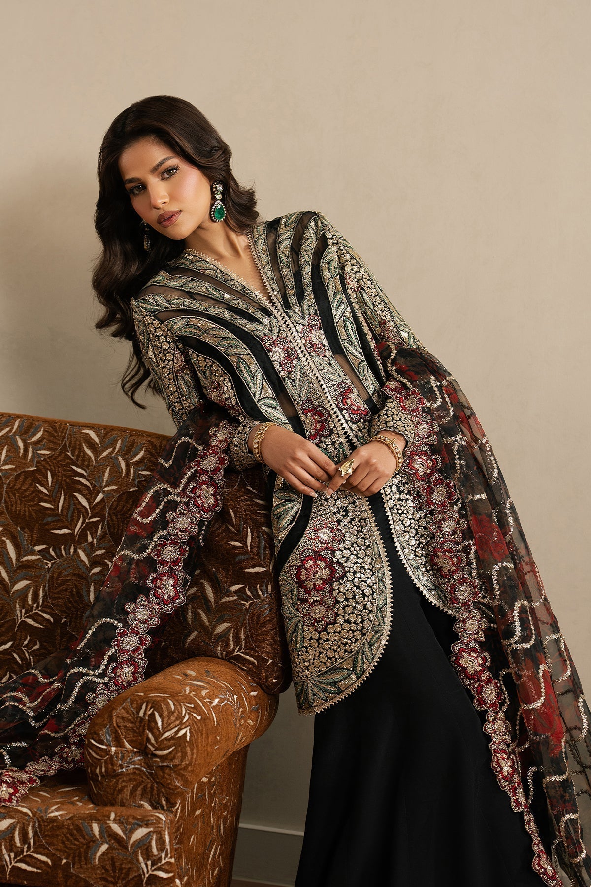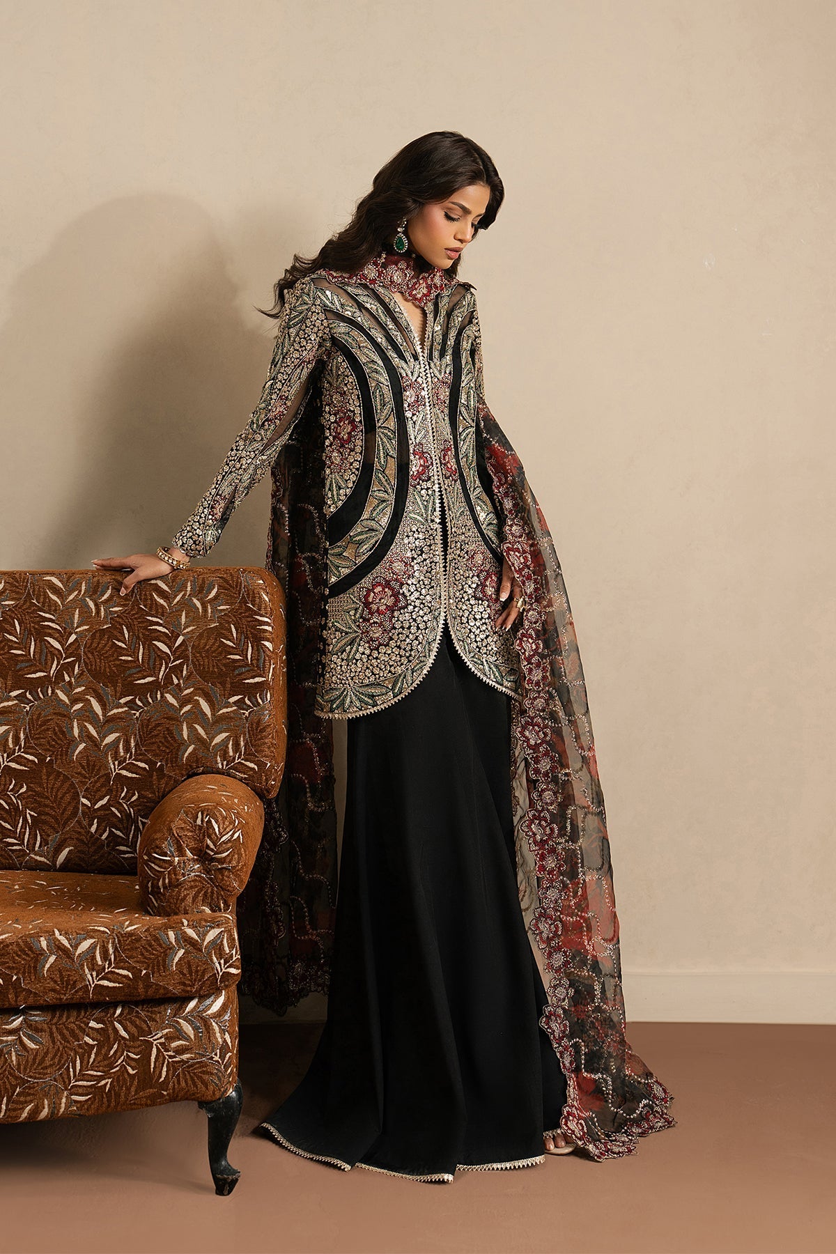 Summary: Elevate your evening wardrobe with the Ayzel 'Ehsaas' Pakistani Suit, a masterpiece of Festive Luxury Formals. This commanding ensemble features a premium Black Raw Silk kameez, intricately detailed with heavy embroidery on the front panels and sleeves, exuding sophisticated glamour. The look is completed with a digital printed and embroidered Organza dupatta that adds a layer of ethereal grace. Perfect as Formal Wear for wedding receptions or elite gatherings, this unstitched Silk dress material offers endless styling possibilities. A definitive statement in Ethnic Wear, this outfit captures the essence of modern Pakistani fashion. Shop online to embrace this timeless black elegance.