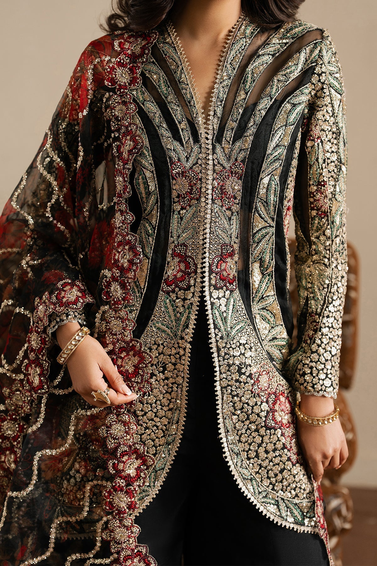 Fabric: Black Raw Silk Embroidered Front Panel Right 1 Pc Black Raw Silk Embroidered Front Panel Left 1 Pc Black Raw Silk Embroidered Back 0.98 M Black Raw Silk Embroidered Sleeves 2 Pcs Black Organza Embroidered Front Panel Patch Right 1 Pc Black Organza Embroidered Front Panel Patch Left 1 Pc Black Organza Embroidered Front Hem Patch (L+R) 2 Pcs Black Organza Embroidered Sleeves Patches A 2 Pcs Black Organza Embroidered Sleeves Patches B 2 Pcs Black Organza Embroidered Back Border 0.98 M Black Organza Embroidered Dupatta Pallu Border 2.60 M Printed Organza Digital Printed Embroidered Dupatta 2.60 M Black Raw Silk Dyed Trouser 2.28 M |