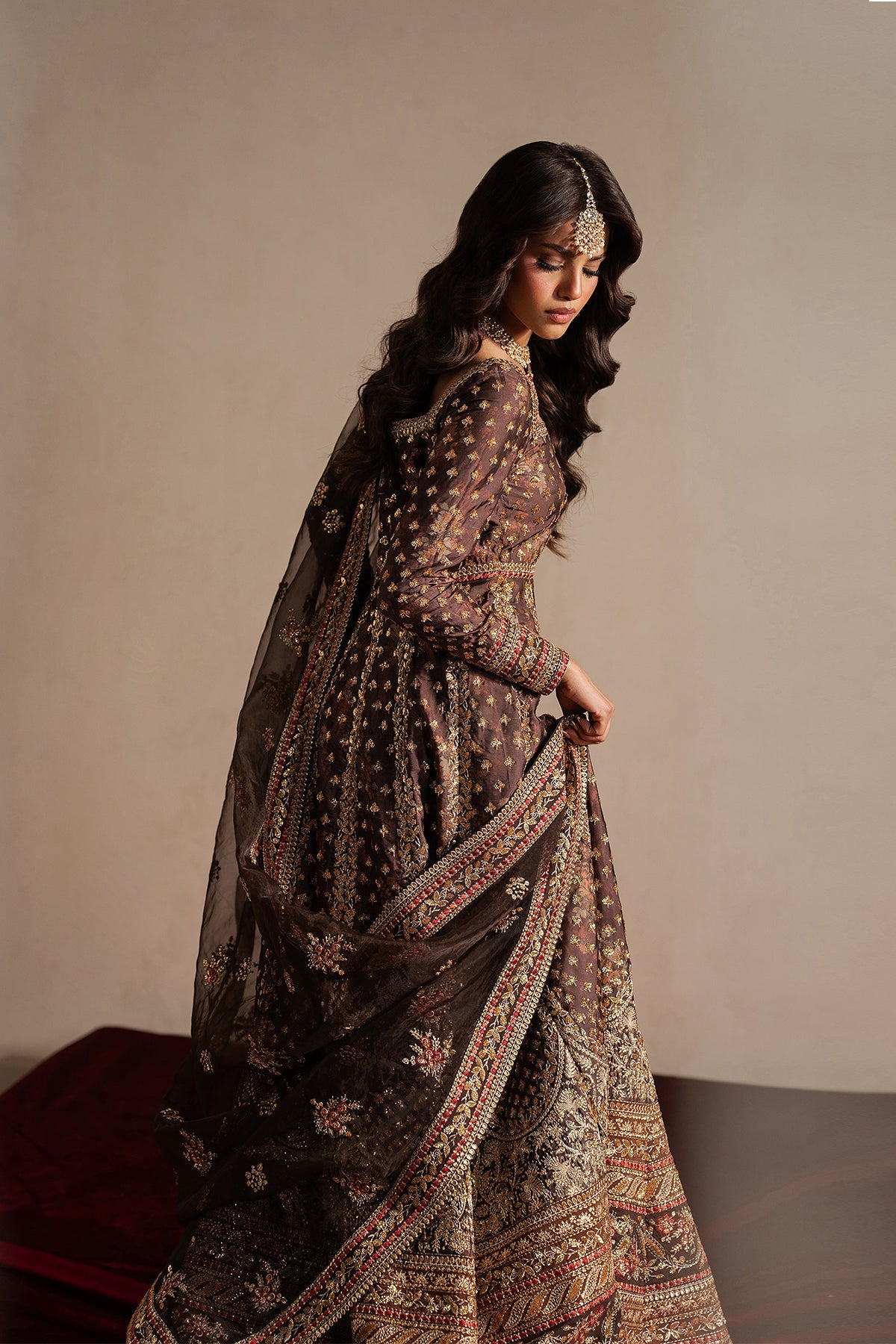 Summary: Step into regal elegance with this Dark Brown Pakistani Suit from the Ayzel Qurbat collection, a masterpiece of festive luxury formals. The main shirt is crafted from premium Shamose Silk, featuring a stunning digital print overlaid with intricate gold embroidery across the front body, back, and twelve flared panels that create a majestic floor-length silhouette. The ensemble is detailed with Raw Silk borders and paired with a sheer Dark Brown Organza embroidered dupatta, adding a touch of ethereal grace. This heavy formal dress is the epitome of Nazaakat, blending traditional craftsmanship with contemporary sophistication. Perfectly suited as wedding wear or a standout outfit for high-end evening parties, this unstitched dress material promises a bespoke fit. Elevate your ethnic wardrobe with this timeless brown festive creation.