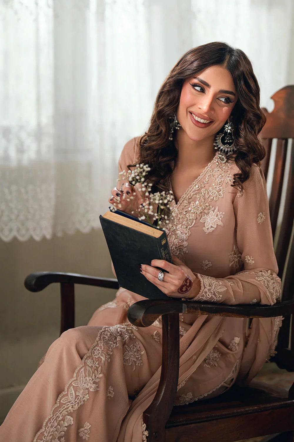 Summary: Embrace soft elegance with this 'Cosmic Blush' Pakistani Suit from Azure's festive collection. Crafted from exquisite tea-pink chiffon, its lightweight feel is perfect for Spring/Summer events. This formal wear masterpiece features a delicately hand-embellished neckline and shimmering sequins embroidery on the front and sleeves. The long, flowing silhouette exudes timeless grace, making it a standout piece of ethnic wear. Ideal for Eid, Nikah ceremonies, or as a sophisticated wedding guest outfit, this Pakistani dress offers effortless sophistication for any special occasion.