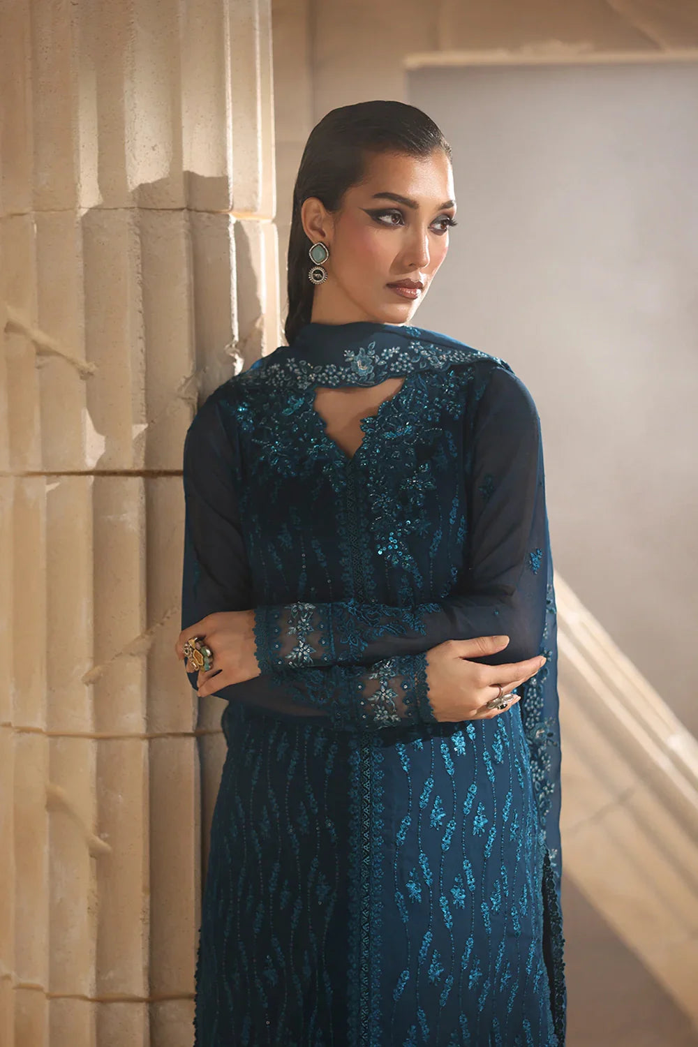 Summary: Embrace festive elegance with this stunning Teal Blue Pakistani suit from Azure's Luxe Collection. Crafted from luxurious chiffon, this formal wear piece is perfect for the Spring/Summer season. The kameez features a long, graceful silhouette (48"+) with intricate hand embellishments on the organza neckline and shimmering sequins embroidered all over the front, back, and sleeves. The serene teal hue makes this ethnic wear a sophisticated choice for evening parties, wedding functions, or Eid celebrations. This unstitched ensemble captures the essence of refined luxury, making it an ideal addition to your festive wardrobe.