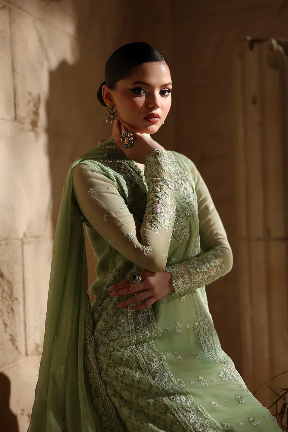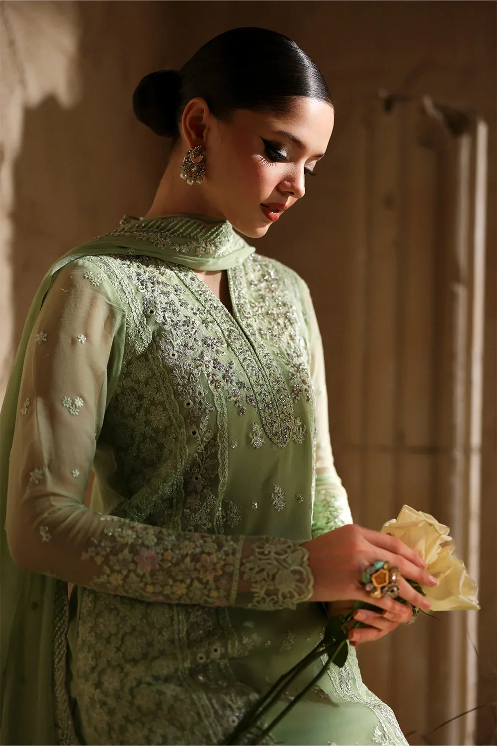 Summary: Step into elegance with the Elara Pakistani suit by Azure. This exquisite formal wear, in a serene light green, is crafted from airy chiffon, making it an ideal choice for spring/summer events. The kameez is a masterpiece of design, featuring intricate hand embellishments and sparkling sequins across the neckline and front. The light green color makes this Pakistani dress a perfect Mehndi outfit or a sophisticated choice for Eid gatherings and evening soirées. This unstitched festive clothing blends timeless allure with modern finesse, ensuring you stand out at any celebration.