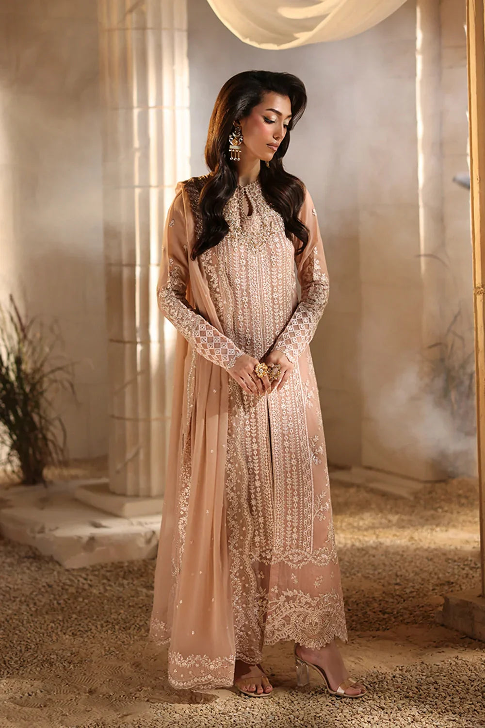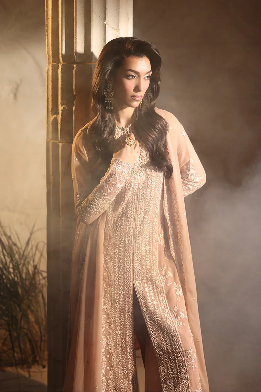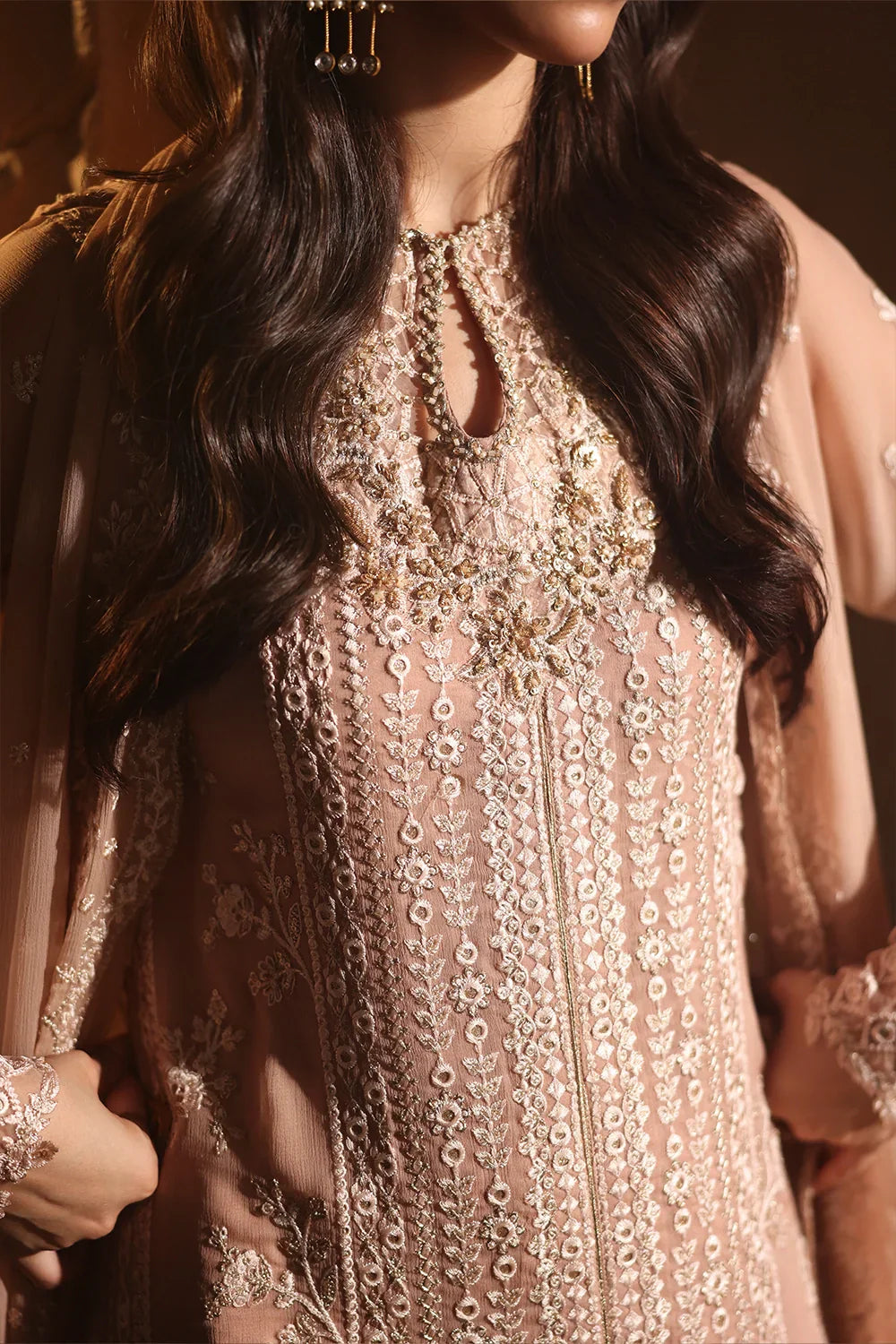 Summary: Embrace timeless elegance with this stunning Tea Pink Pakistani suit from Azure's 'Lueur' collection. Crafted from delicate chiffon, this formal wear piece is perfect for the Spring/Summer season. The kameez features intricate sequins embroidery across the front, back, and sleeves, creating a shimmering effect. Its highlight is the exquisitely hand-embellished organza neckline, adding a touch of luxury. This Pakistani dress offers a gracefully long silhouette, embodying sophisticated ethnic wear. Ideal for Eid festivities, wedding receptions, or any grand celebration, this outfit is a statement of poise and understated glamour.