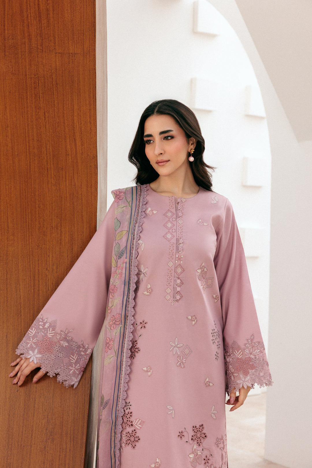 Summary: Embrace sophisticated summer style with this stunning Lavender Pakistani Suit from Florent. Crafted from premium, breathable Lawn fabric, this unstitched ethnic wear is perfect for the Spring/Summer season. The kameez features delicate embroidery on the front, with elegant motifs and a detailed hem border that adds a touch of grace. Paired with a digital printed Bamber Chiffon dupatta, this outfit blends traditional craftsmanship with contemporary aesthetics. This elegant Pakistani dress is an ideal choice for formal gatherings, Eid celebrations, or any daytime festive event, offering both comfort and class.