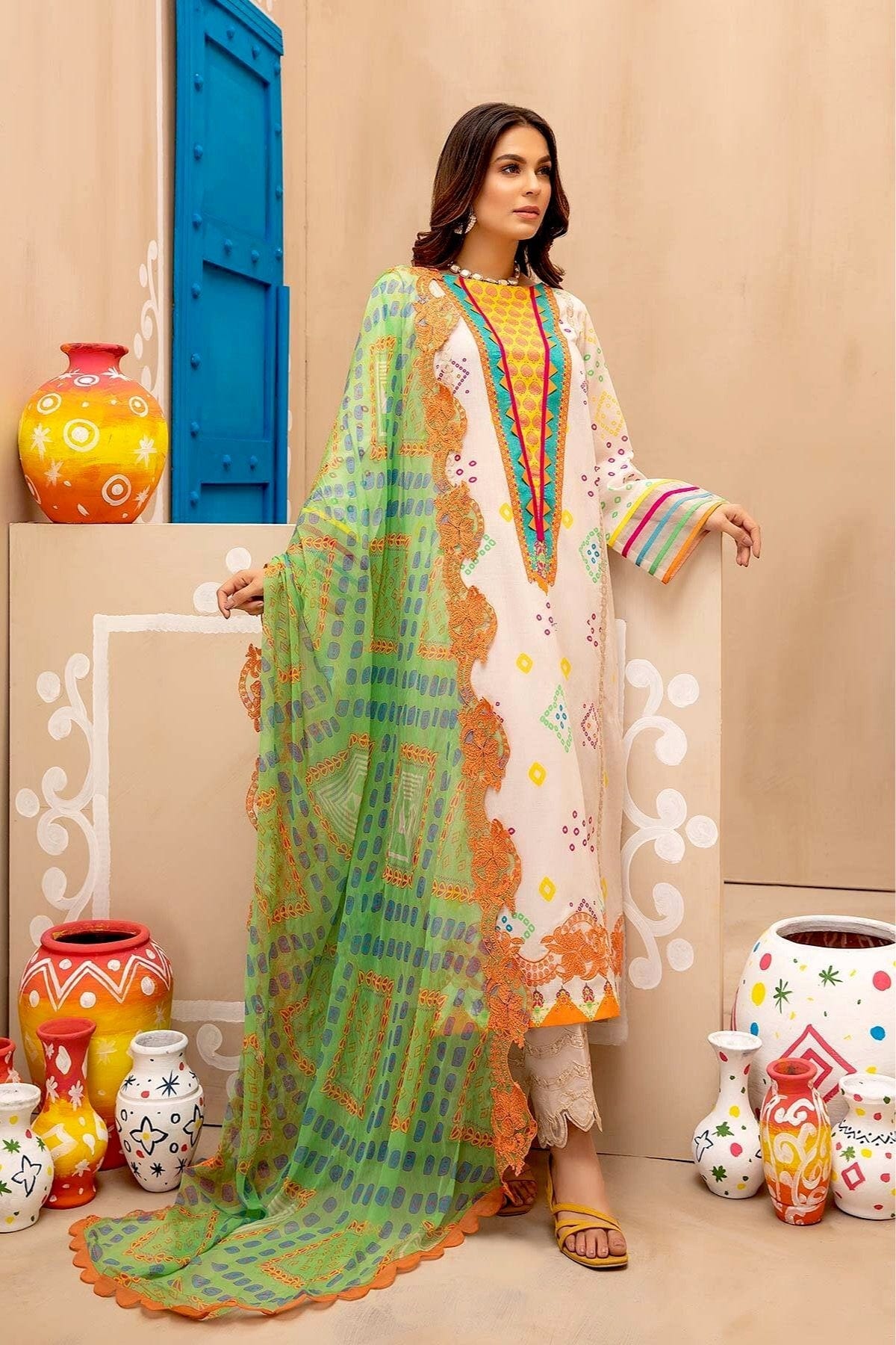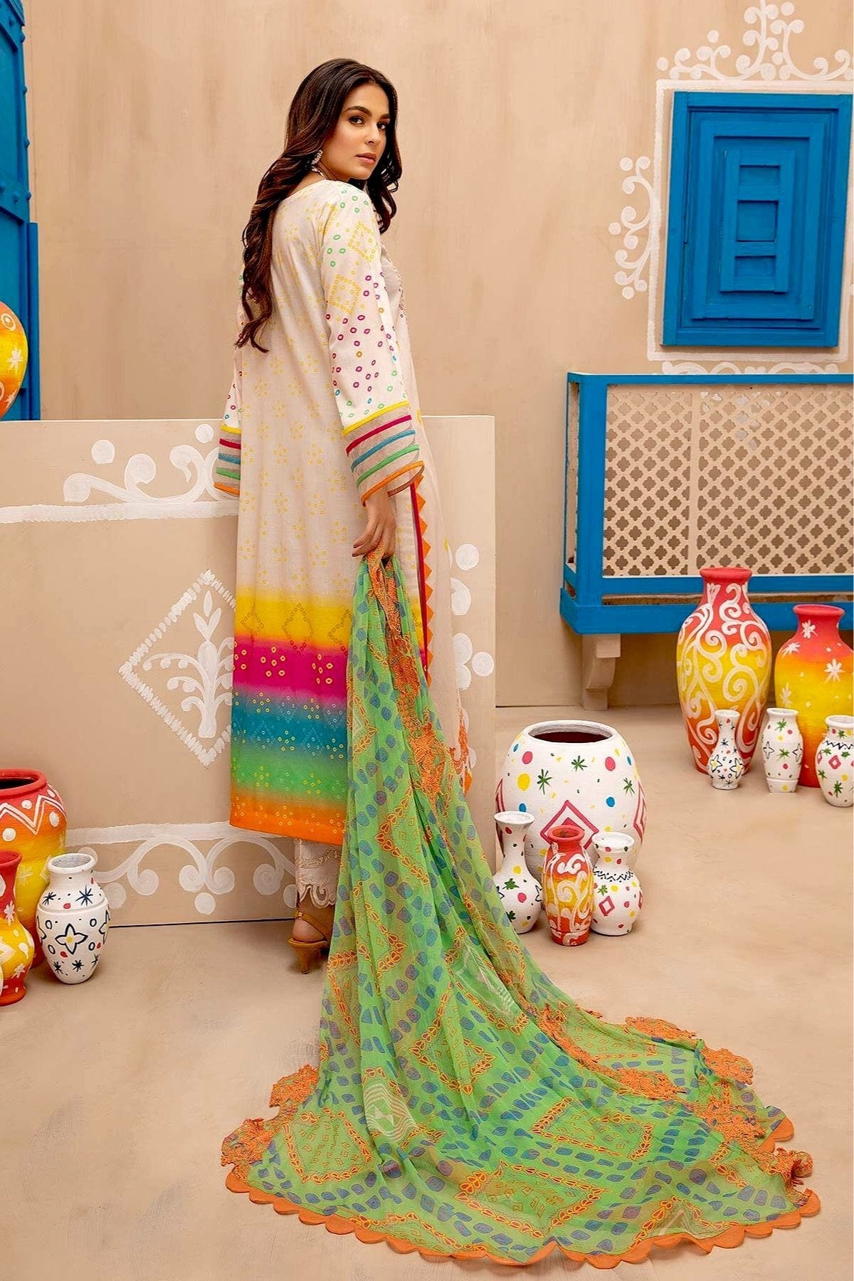 Fabric: Shirt Lawn Print Front+Back +Sleeves 3.4M Embroidered Front Daman Patti 1M Embroidered Front Panel Patti 2.5M Trouser Cotton Trouser 2.5 M Embroidered Trouser Patti 1.5M Dupatta Embroidered Printed Chiffon Dupatta 2.5 M |