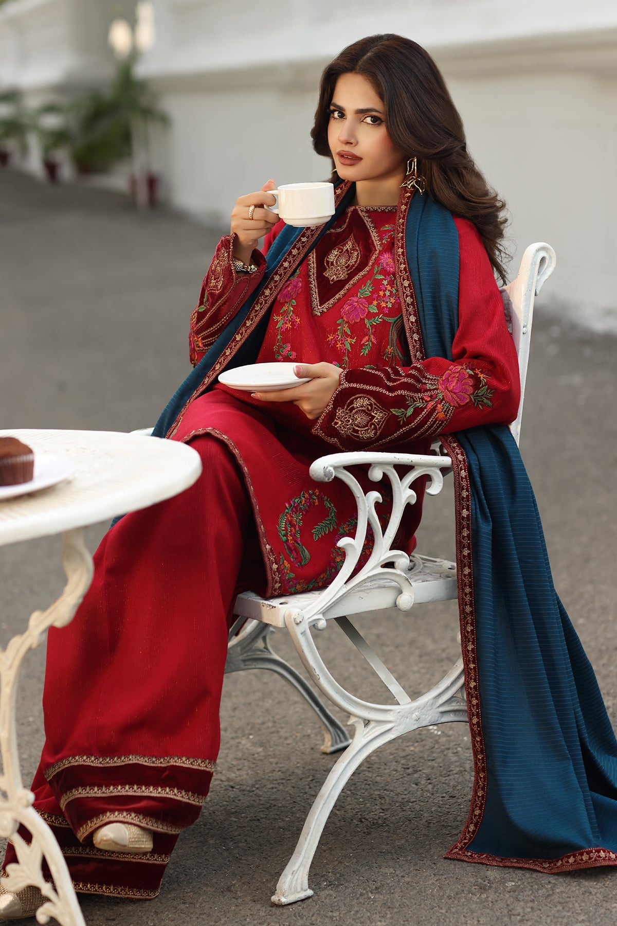 Summary: Embrace winter elegance with this stunning red Pakistani suit from the Charizma Signature collection. The kameez is crafted from a luxurious wool fabric, ideal for the Fall/Winter season, ensuring both warmth and style. It features exquisite floral embroidery on the neckline, front, and sleeves, accented with plush velvet motifs for a regal touch. This unstitched ethnic wear piece is the epitome of sophisticated Pakistani formal wear. The deep red color makes it a perfect choice for winter weddings and festive parties. Shop this beautiful winter outfit online to make a memorable statement.