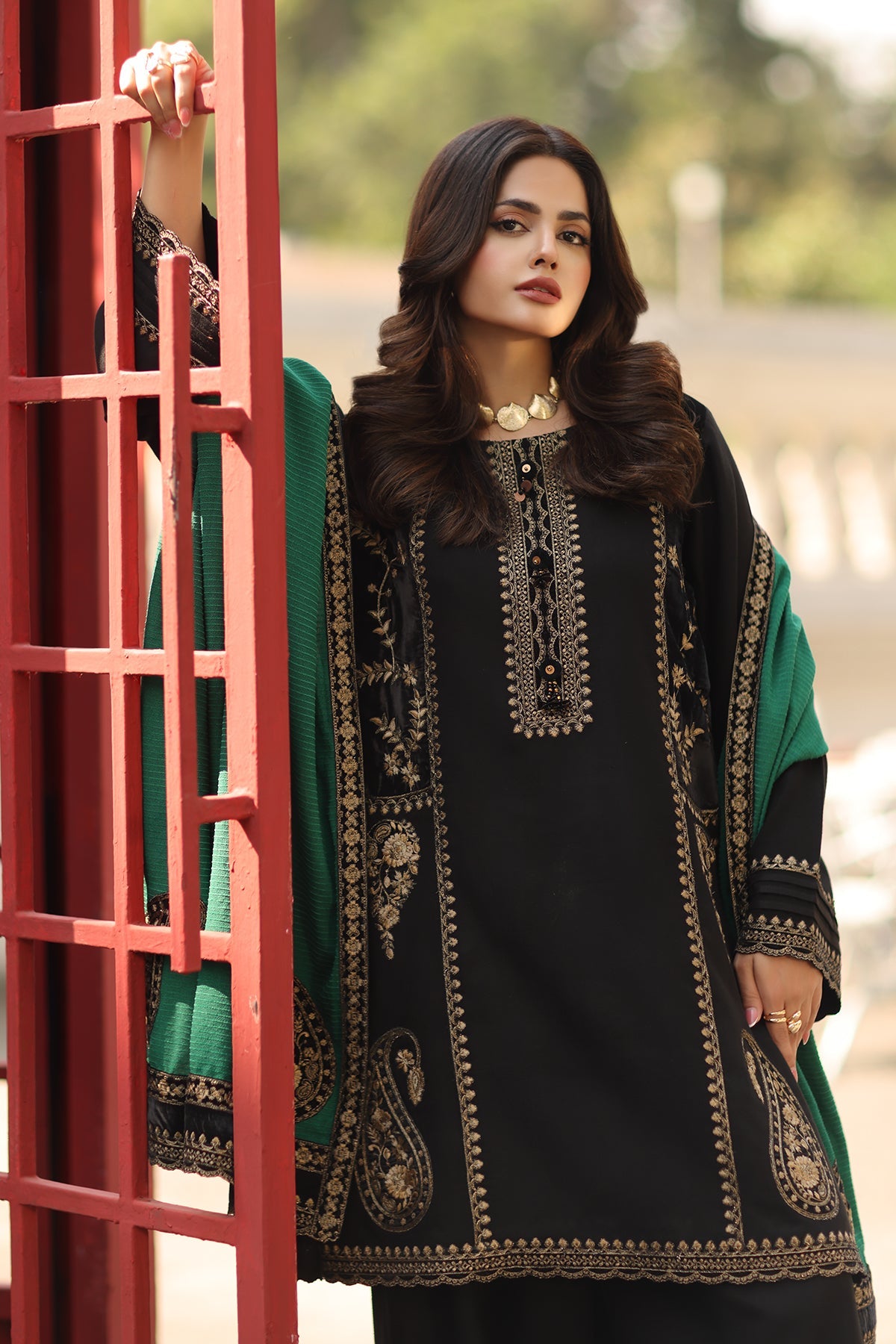 Summary: Embrace timeless elegance with this stunning black Pakistani suit from Charizma's Signature Winter collection. The kameez, crafted from a luxurious winter fabric, features exquisite golden-toned embroidery on the neckline, front panels, and hem, creating a look of sophisticated grace. The rich black canvas provides a perfect backdrop for the detailed motifs, making this ethnic wear a standout piece. As a quintessential piece of Fall/Winter formal wear, this dress is perfect for evening parties and festive celebrations. This formal Pakistani dress offers a blend of tradition and modern style, making it an ideal choice for your next special occasion.