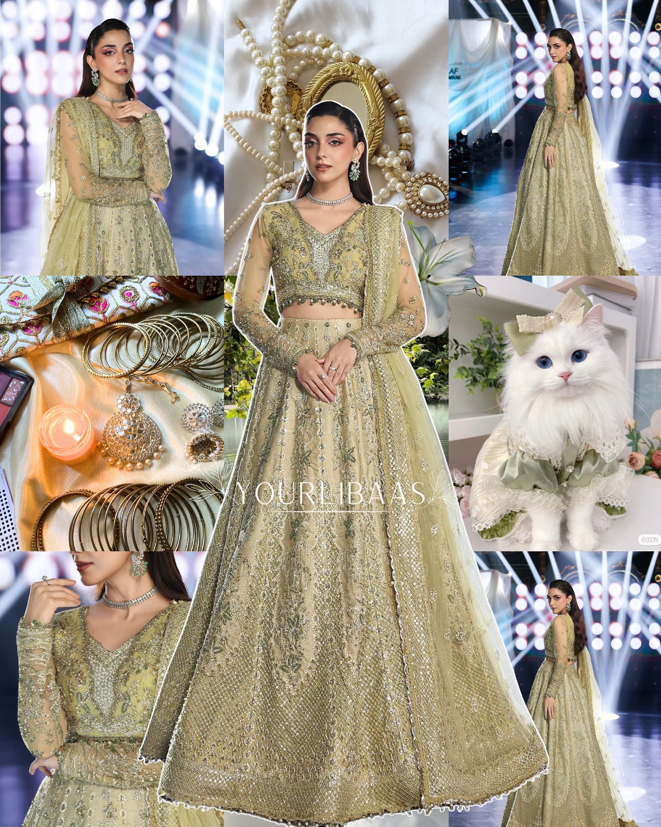 Summary: Embrace regal elegance with the Elaf Stardom 'Mint Majesty,' a breathtaking Pakistani suit in a delicate green hue. Crafted from lightweight and airy Poly Net, this unstitched ensemble is perfect for Spring/Summer festivities. The kameez features extensive, intricate hand embellishments and detailed embroidery across the yoke, sleeves, and multiple panels (kallis), creating a lavish silhouette. The light green shade makes this formal wear an exceptional choice for a Mehndi ceremony or as a sophisticated wedding guest outfit. This Pakistani dress blends traditional craftsmanship with contemporary style, making it an ideal statement piece for any grand celebration.