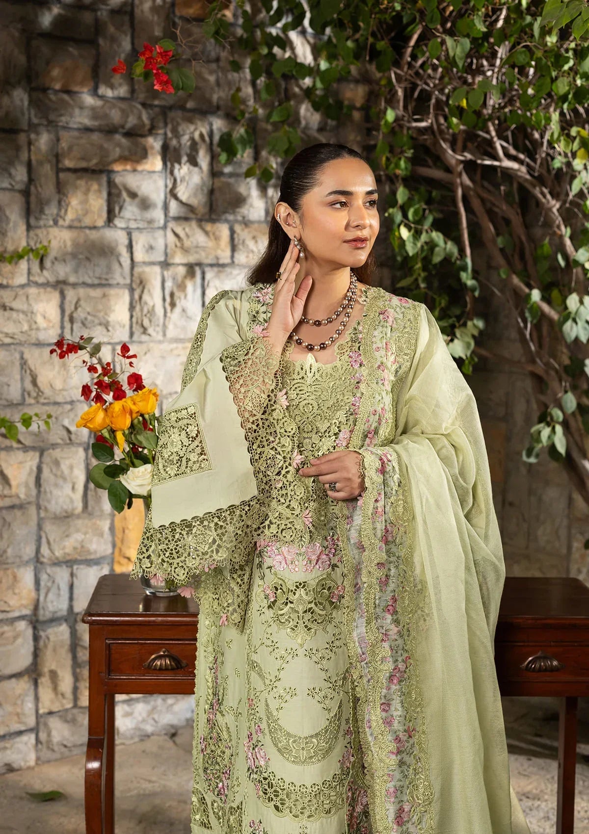 Summary: Embrace the refreshing allure of the Elaf Luxury Lawn collection with this stunning Green Pakistani suit, showcased by the graceful Yumna Zaidi. Crafted from premium Lawn fabric, the shirt features elaborate laser-work embroidery and delicate floral patterns that define high-end summer fashion. The ensemble is paired with a solid dyed cambric trouser and an ethereal, sheer dupatta adorned with intricate borders, making it a masterpiece of ethnic wear. Perfect for Eid celebrations, garden parties, or summer daytime events, this unstitched dress material offers breathable comfort without compromising on festive glamour. Shop this sophisticated look to make a chic statement this season.
