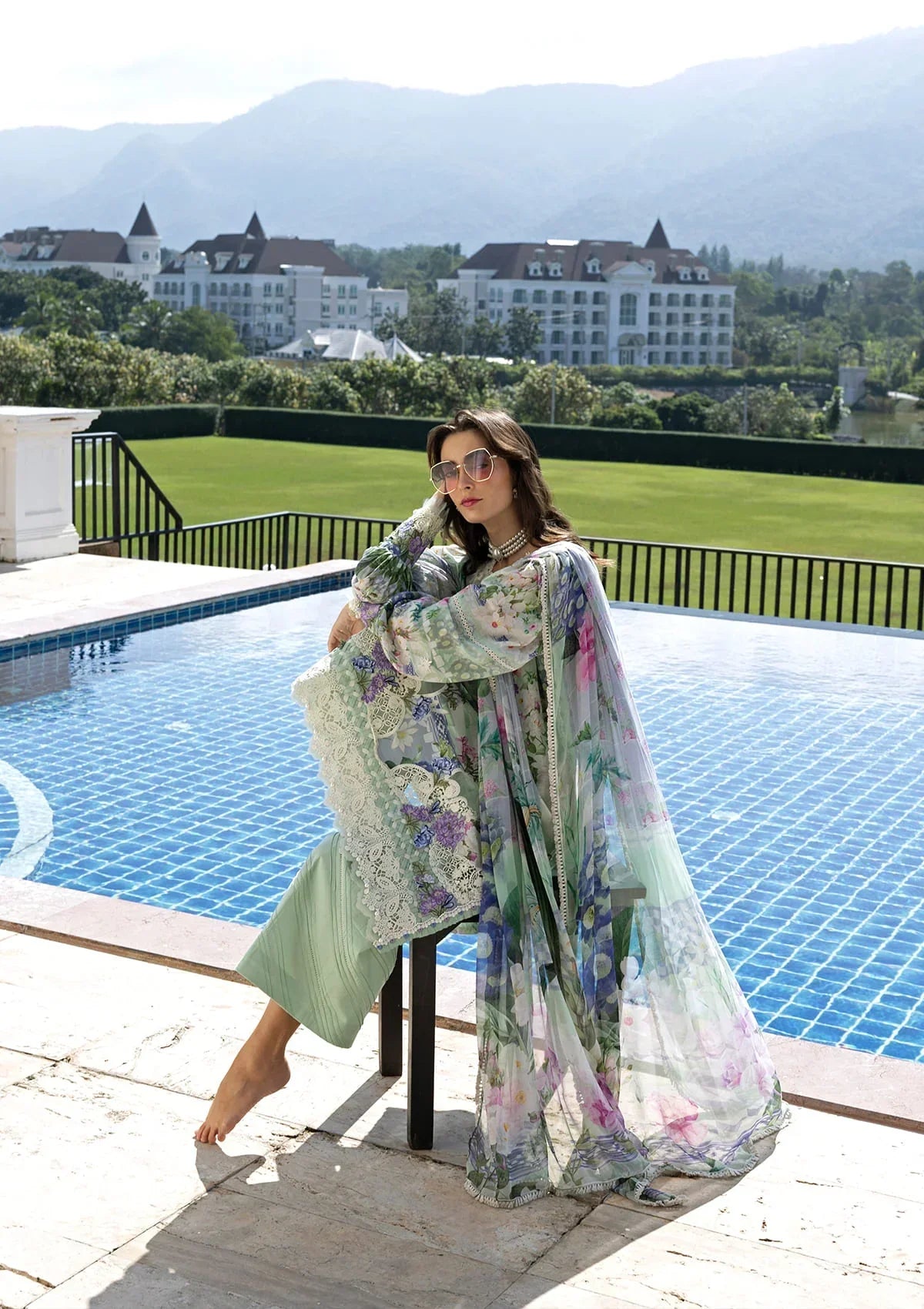Summary: Embrace summer elegance with the 'EVELINE WHISPER' Pakistani suit by Elaf. This stunning three-piece unstitched outfit features a serene Sea Green kameez crafted from breathable Lawn fabric, making it ideal for the warmer Spring/Summer season. The shirt is adorned with beautiful digital floral prints and enhanced with delicate embroidered organza on the neckline and daman. This Pakistani Lawn Dress offers a fresh and sophisticated look for daytime gatherings and festive events like Eid. It's a versatile piece of ethnic wear, blending comfort and style, making it an essential addition for your summer wardrobe.