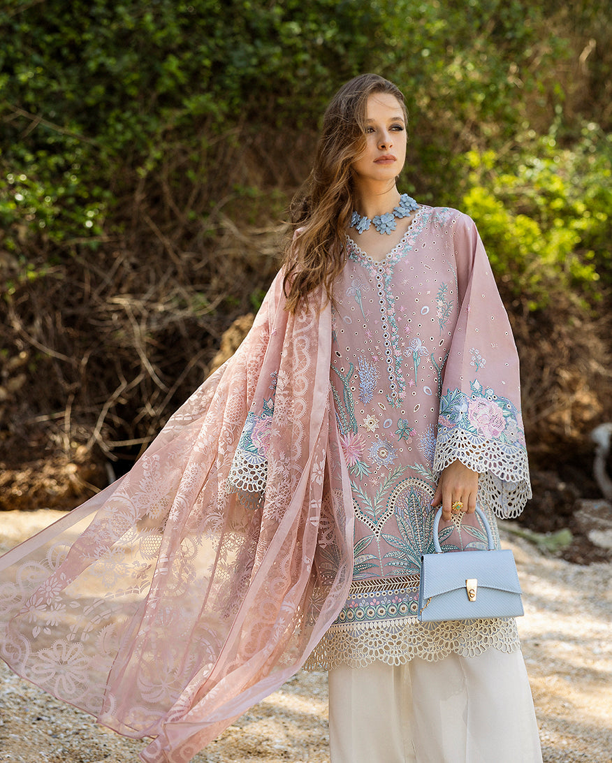 Summary: Introducing the Esmel Nouveau Chapitre Luxury Lawn – Verlaine, a stunning three-piece Pakistani suit perfect for your next summer event. This unstitched ensemble offers a beautiful pink lawn kameez/shirt adorned with exquisite Chikan embroidery. The front, back, and sleeves are all meticulously embroidered, creating a rich, textured look. Delicate crochet lace trims the front and back daman, adding a touch of feminine charm. The accompanying woven jacquard dupatta complements the kameez beautifully, while the dyed cotton trousers complete the look. This luxurious lawn suit provides both comfort and style, making it ideal for warm-weather occasions. Embrace effortless elegance with the Esmel Nouveau Chapitre Verlaine and make a statement at your next party. This Pakistani dress material allows for custom tailoring to ensure the perfect fit. Authentic and original, this suit embodies the essence of sophisticated summer style.