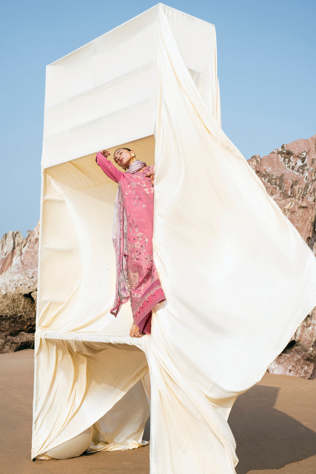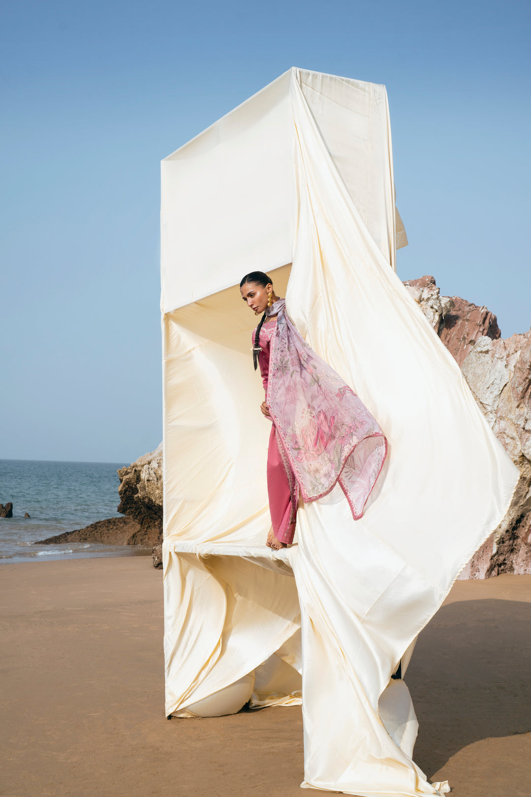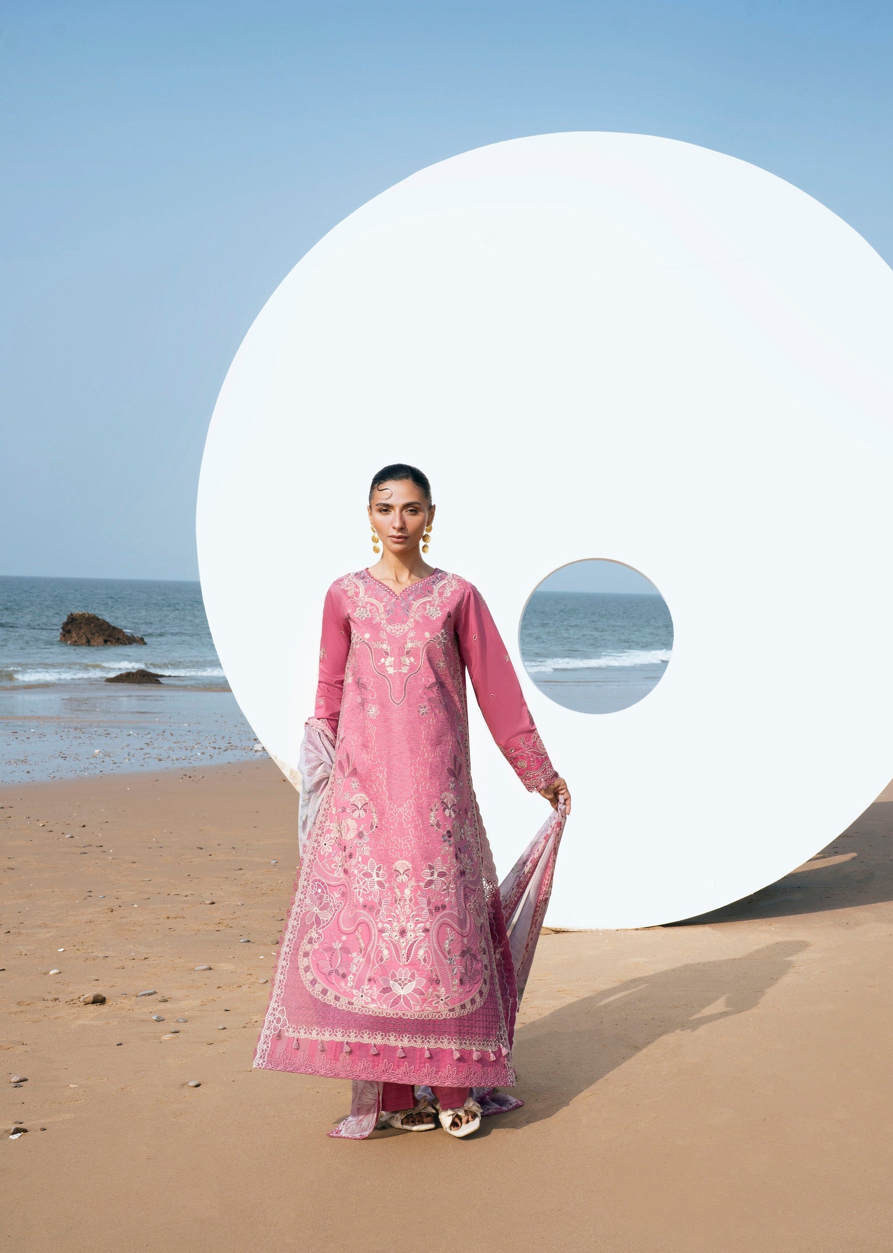 Summary: Embrace festive elegance with this stunning pink Pakistani suit from the Florent Festive Luxury Lawn collection. Crafted from premium quality lawn, this unstitched dress material is light, airy, and perfect for the Spring/Summer season. The kameez features intricate embroidery on the front, back, and sleeves, complemented by an exquisitely embroidered hem border and slits for a touch of sophistication. It is paired with a beautiful digital printed silk dupatta, adding a luxurious flow. This ethnic wear is a prime example of Pakistani festive clothing, ideal for Eid, weddings, or formal parties.