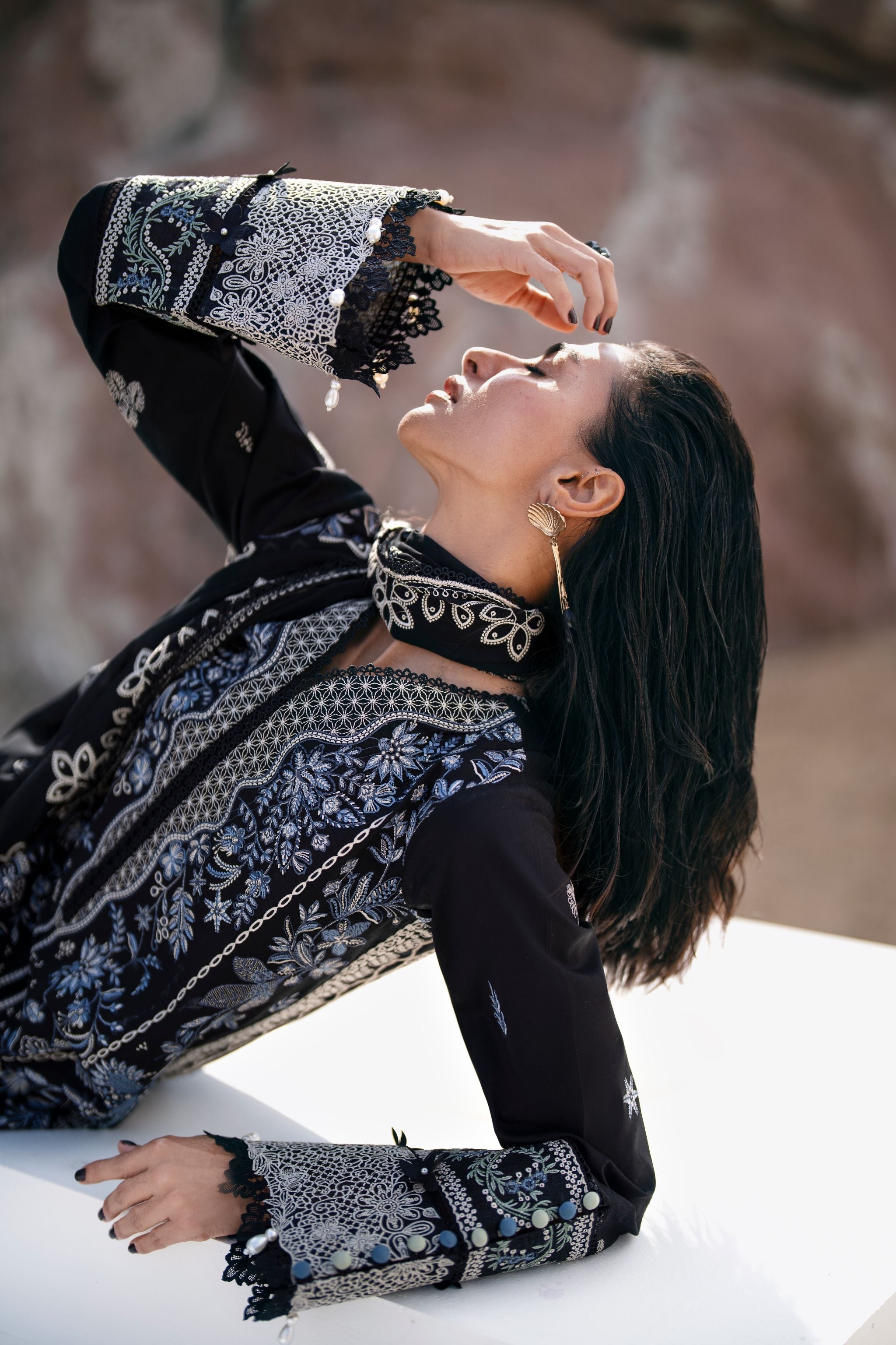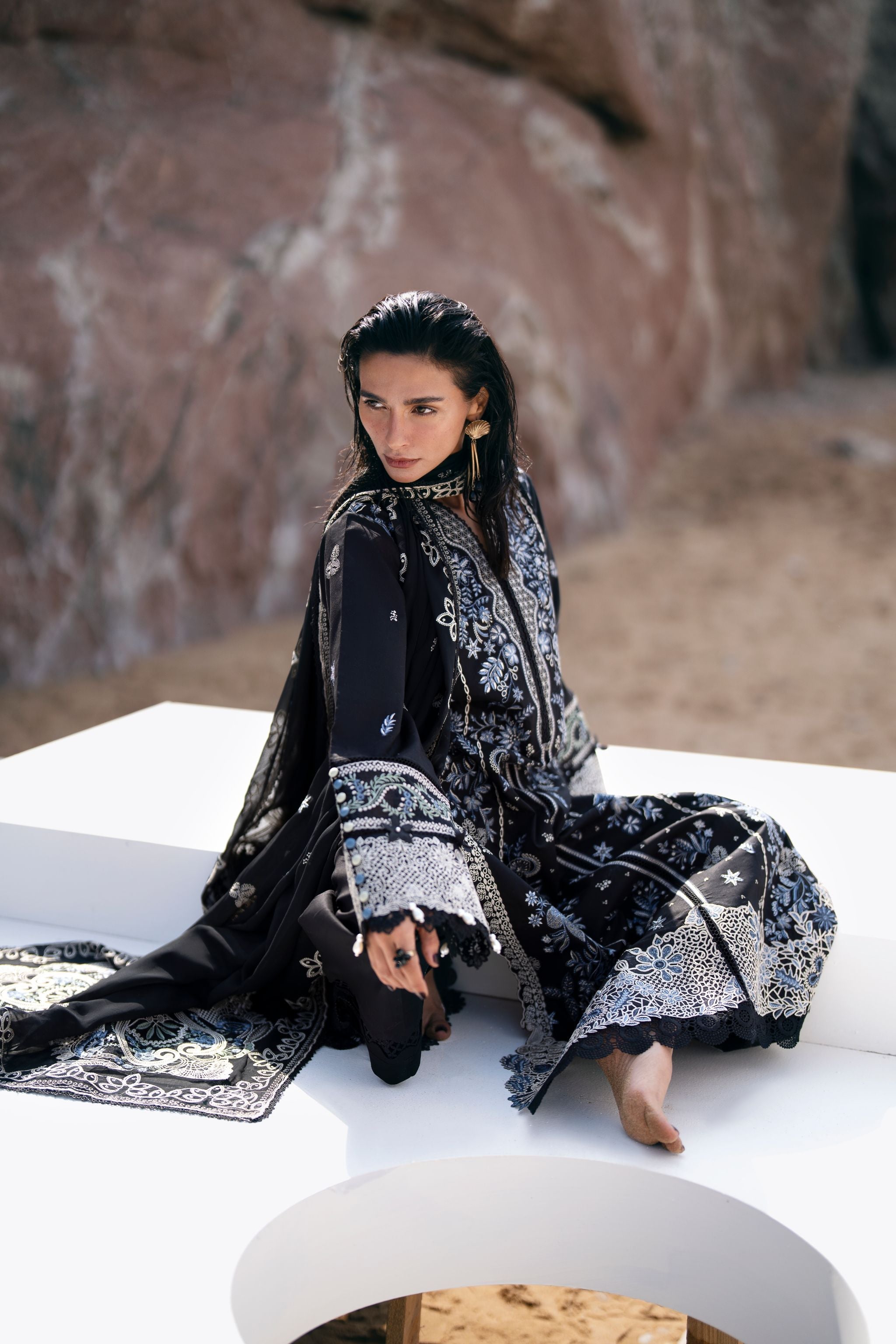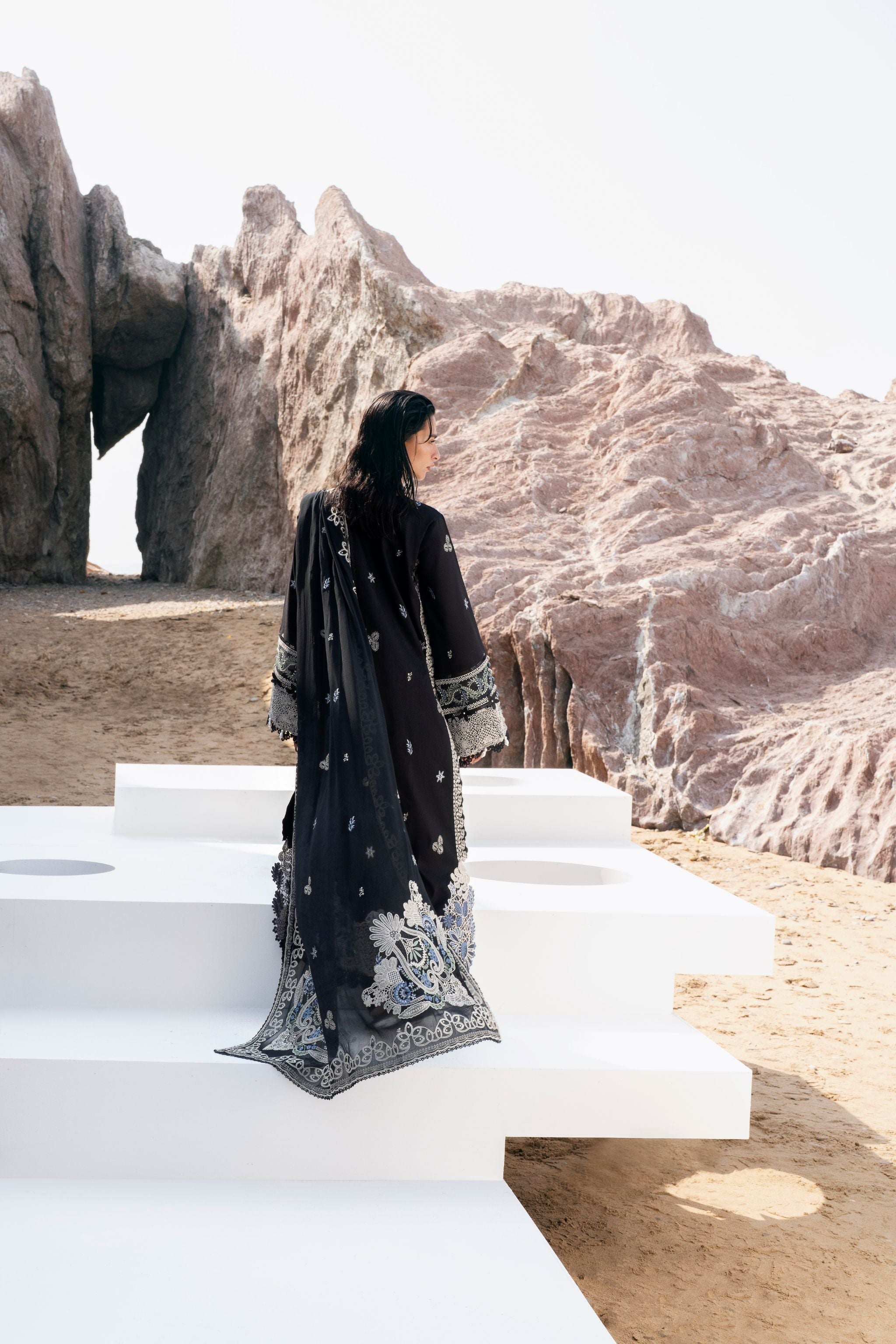 Summary: Embrace timeless elegance with the Florent Festive Luxury Lawn suit. This stunning Pakistani dress features a deep black kameez, crafted from premium, breathable lawn fabric perfect for summer festivities. The shirt is adorned with exquisite, dense embroidery in contrasting tones, creating a sophisticated and formal look. This unstitched ensemble includes a delicate embroidered chiffon dupatta, completing this ethnic wear package. As a versatile black outfit, it is ideal for evening gatherings, formal dinners, or festive celebrations, offering a blend of classic style and contemporary grace. A perfect choice for your next special event.