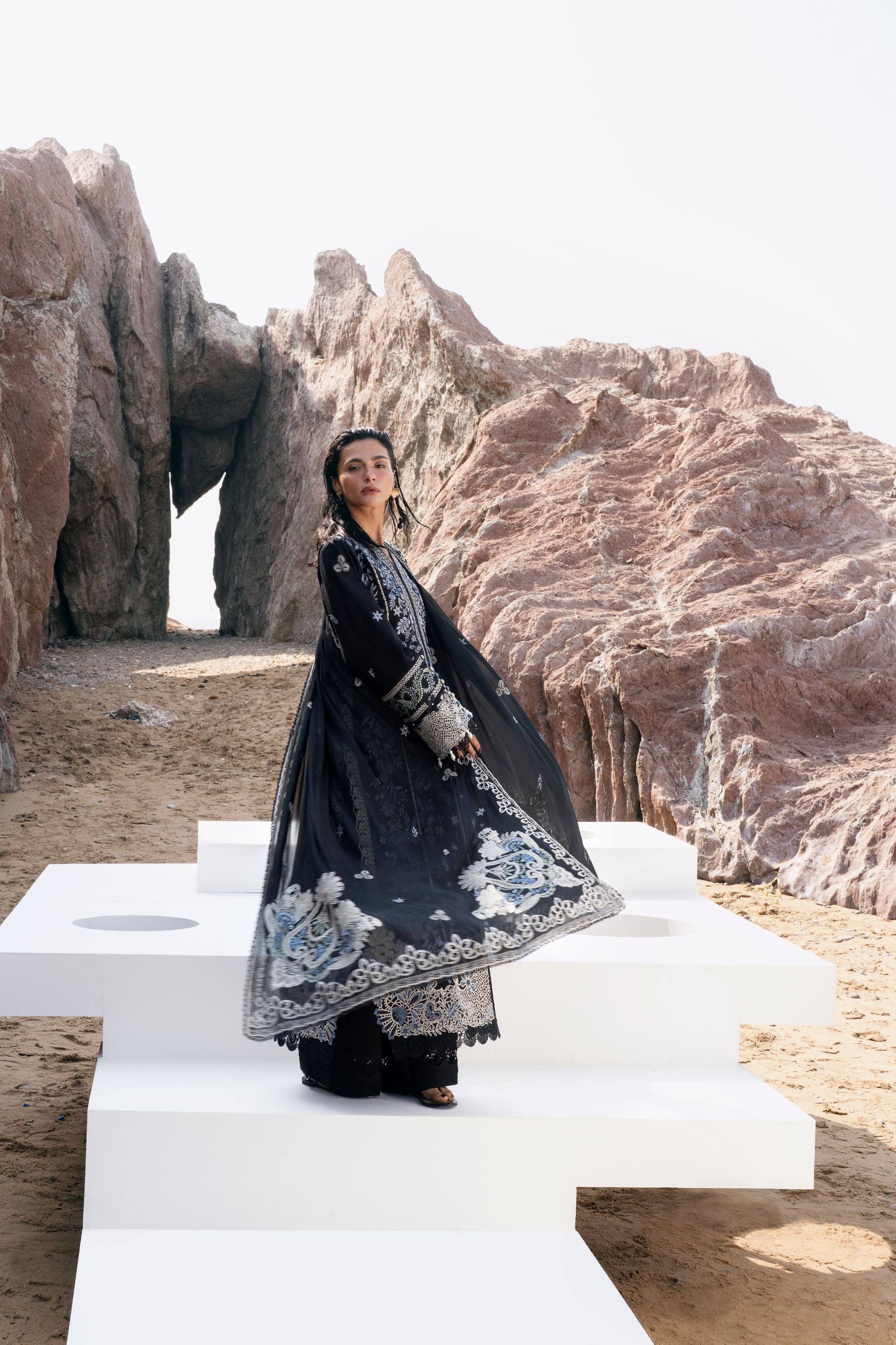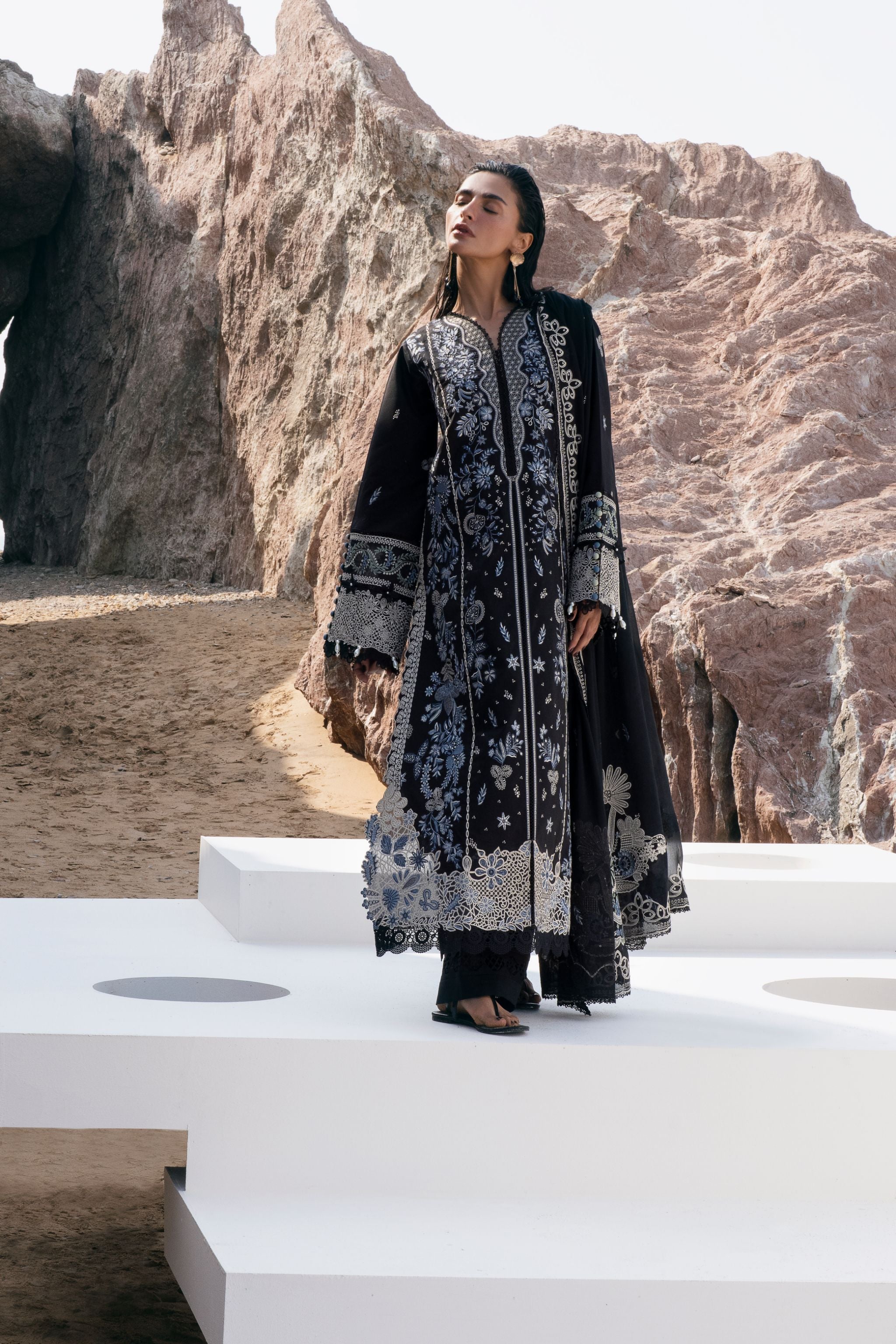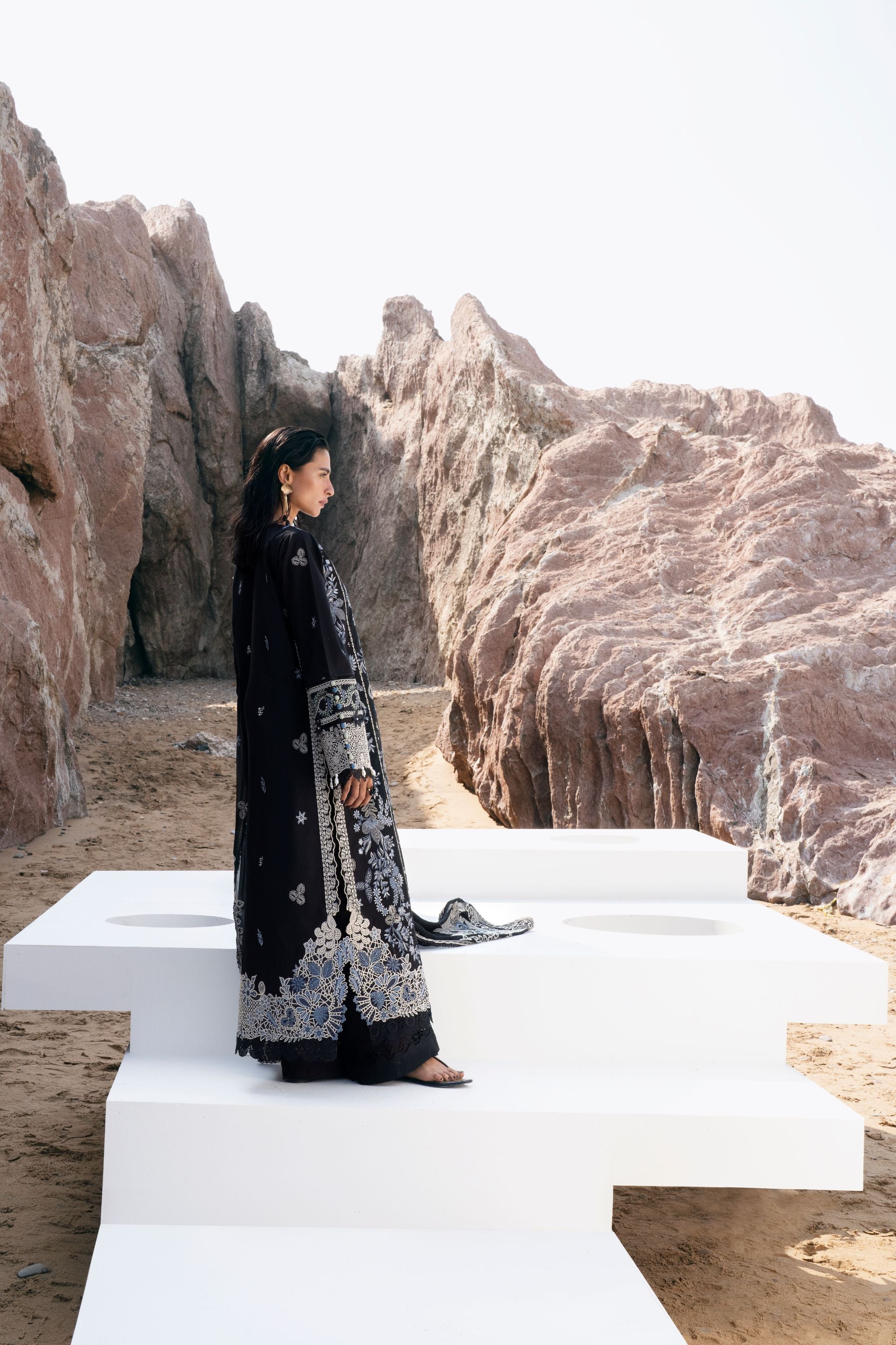 Summary: Embrace timeless elegance with the Florent Festive Luxury Lawn suit. This stunning Pakistani dress features a deep black kameez, crafted from premium, breathable lawn fabric perfect for summer festivities. The shirt is adorned with exquisite, dense embroidery in contrasting tones, creating a sophisticated and formal look. This unstitched ensemble includes a delicate embroidered chiffon dupatta, completing this ethnic wear package. As a versatile black outfit, it is ideal for evening gatherings, formal dinners, or festive celebrations, offering a blend of classic style and contemporary grace. A perfect choice for your next special event.