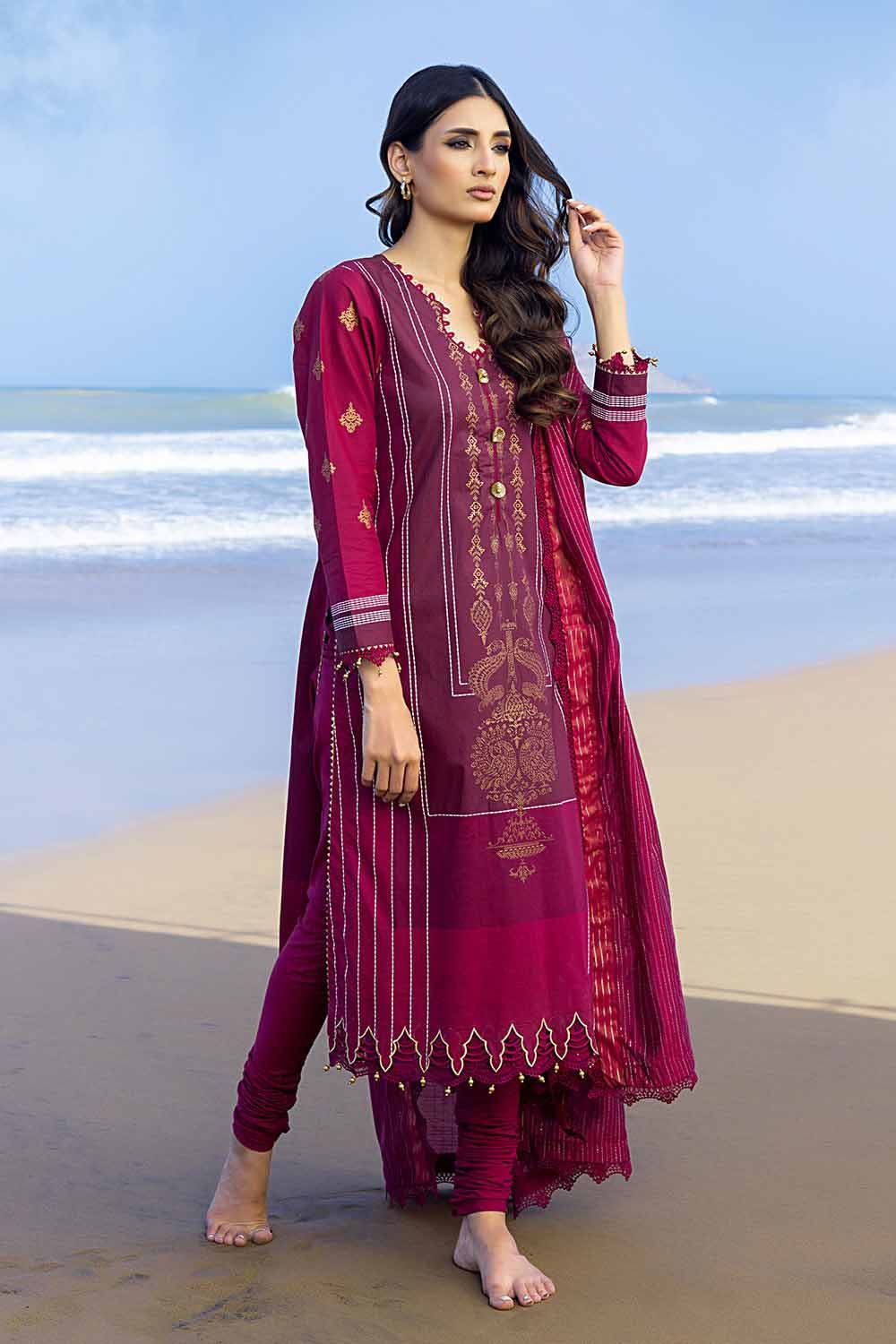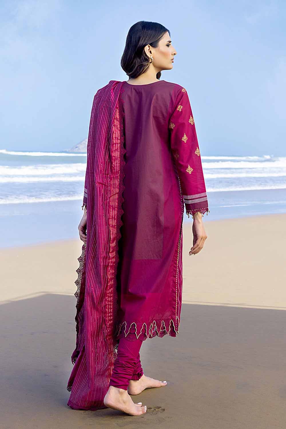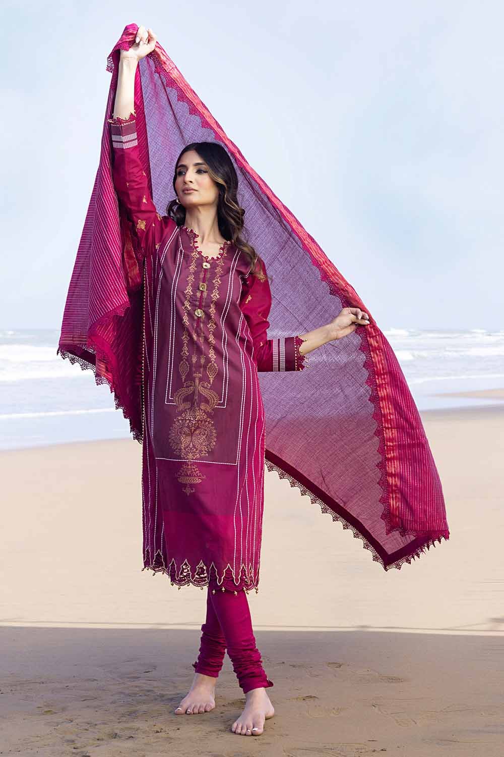 Fabric: Yarn Dyed Dupatta – 2.5 meters Gold & Lacquer Printed Cambric Shirt – 1.75 meters Dyed Trouser – 1.75 meters |