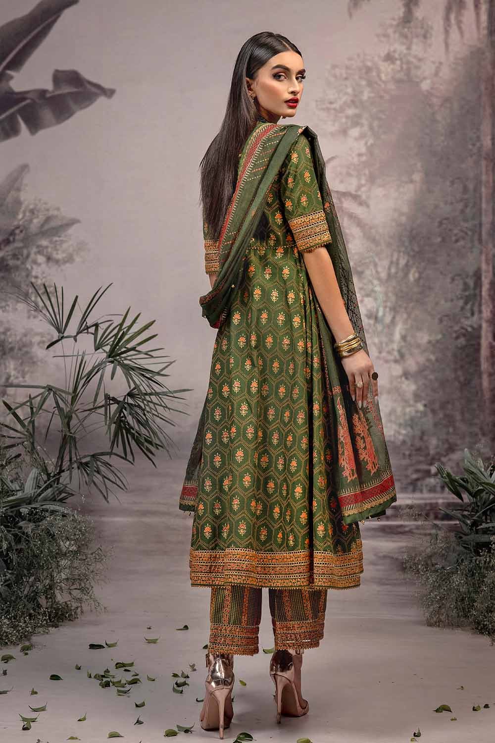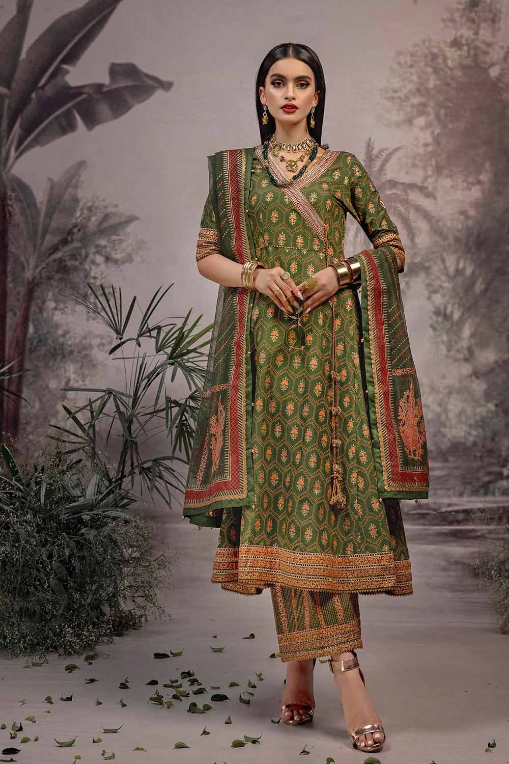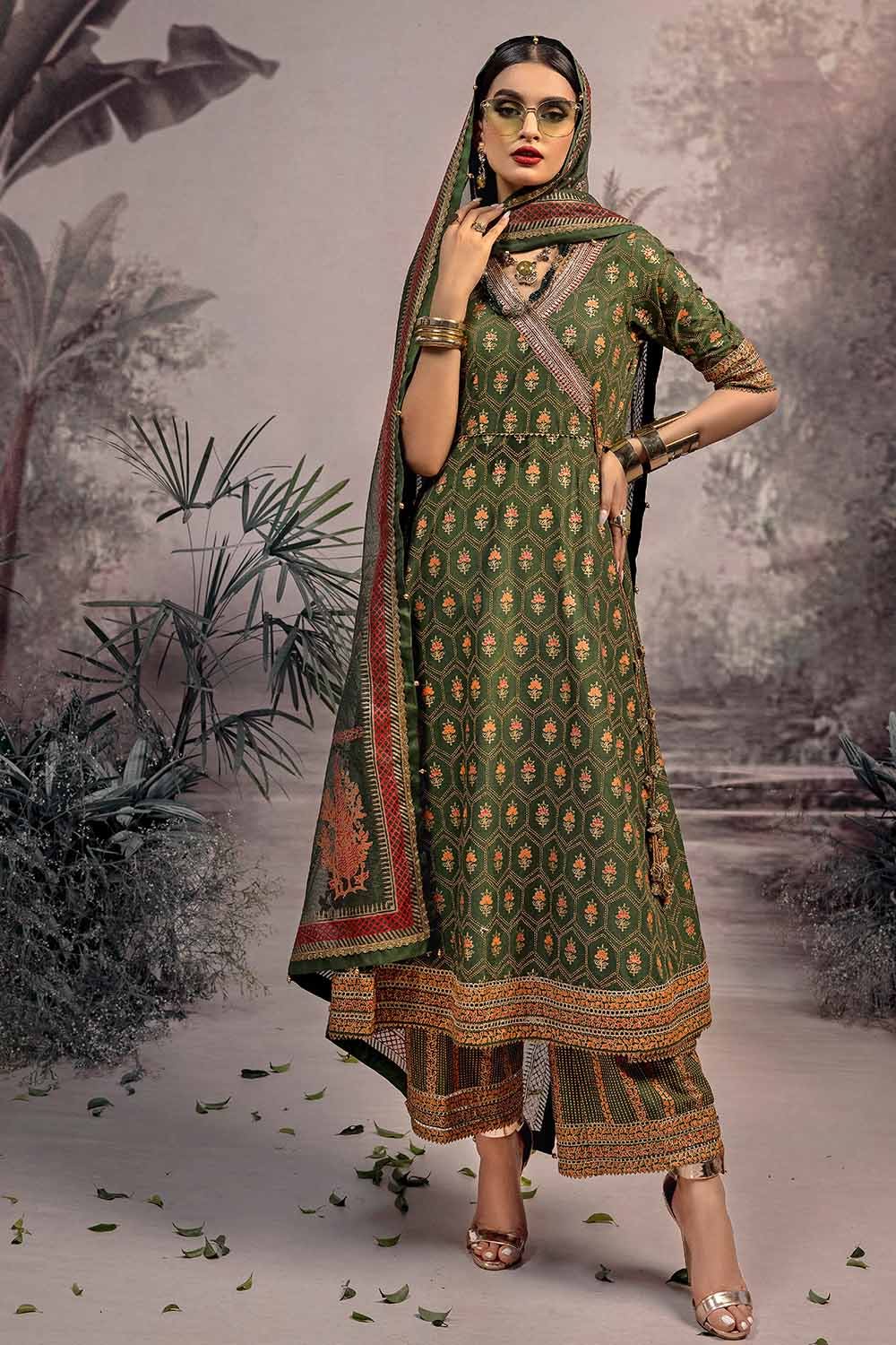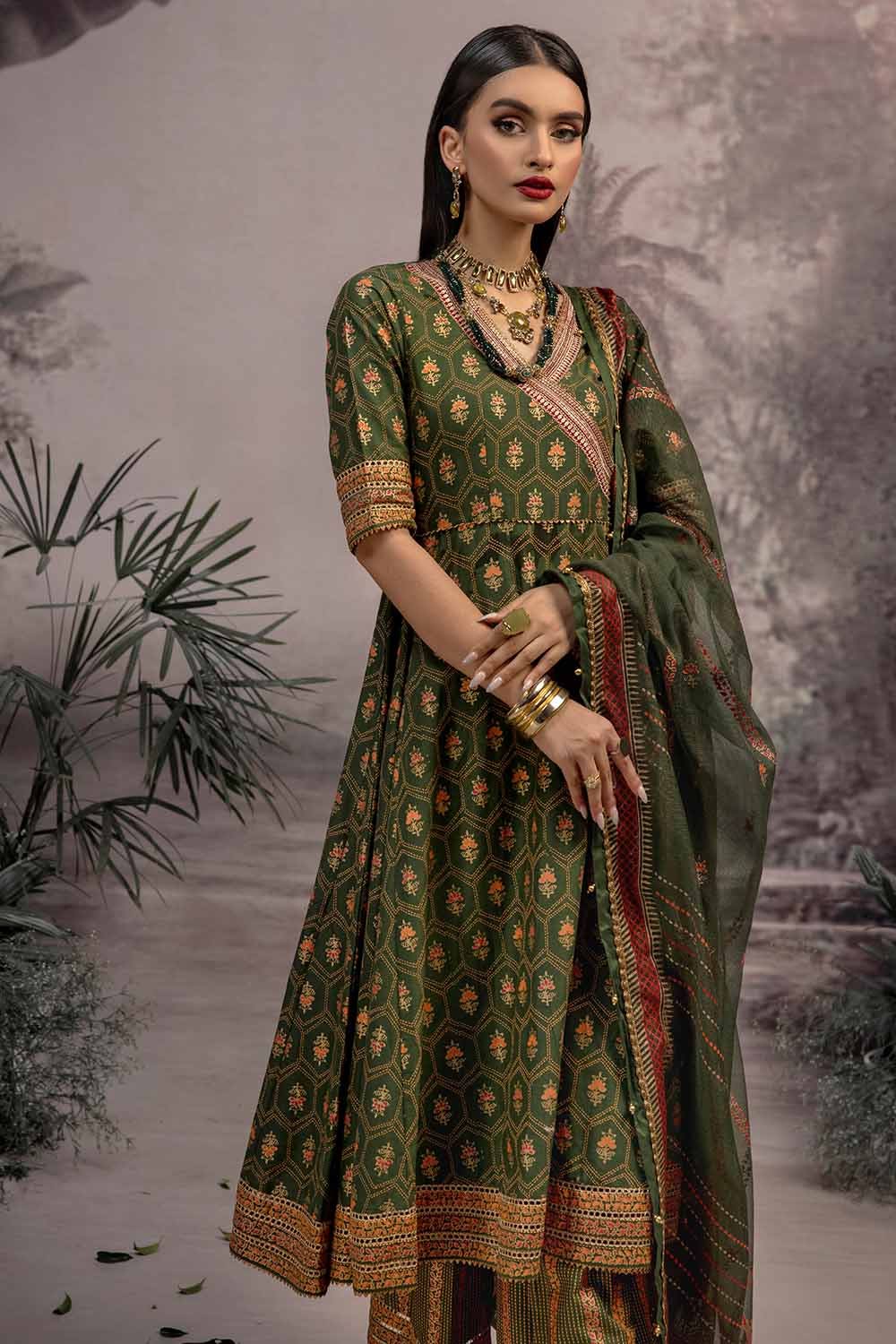 Gul Ahmed Maharani Muse – 3PC Embroidered Gold and Lacquer Printed Lawn Suit with Cotton Net Dupatta CN-32022