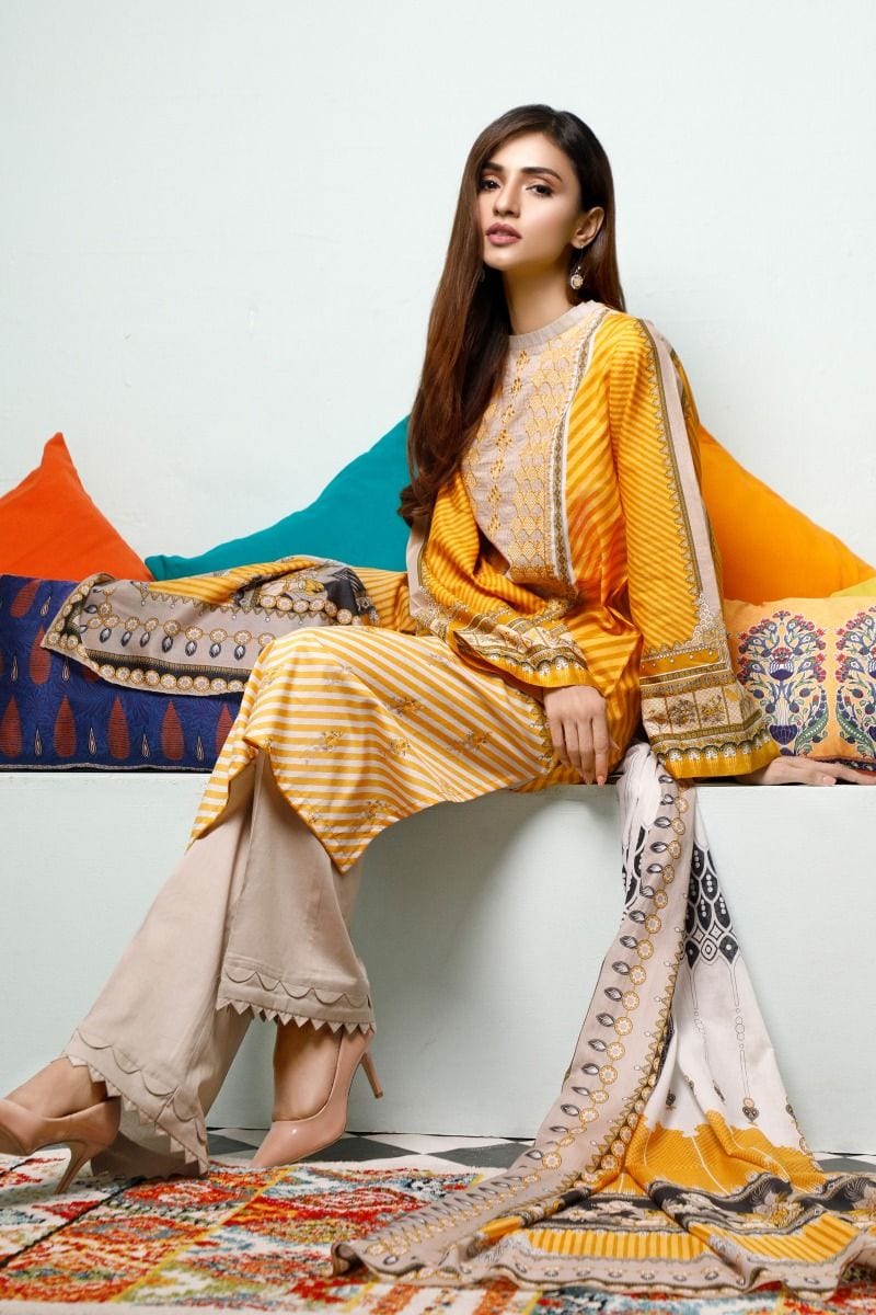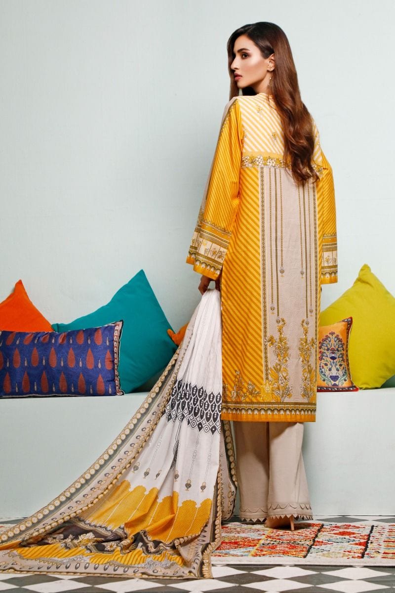 Fabric: Printed Lawn Dupatta – 2.5 meters Embroidered Printed Lawn Front, Printed Lawn Back & Sleeves – 1.75 meters Dyed Lawn Trouser – 1.75 meters |