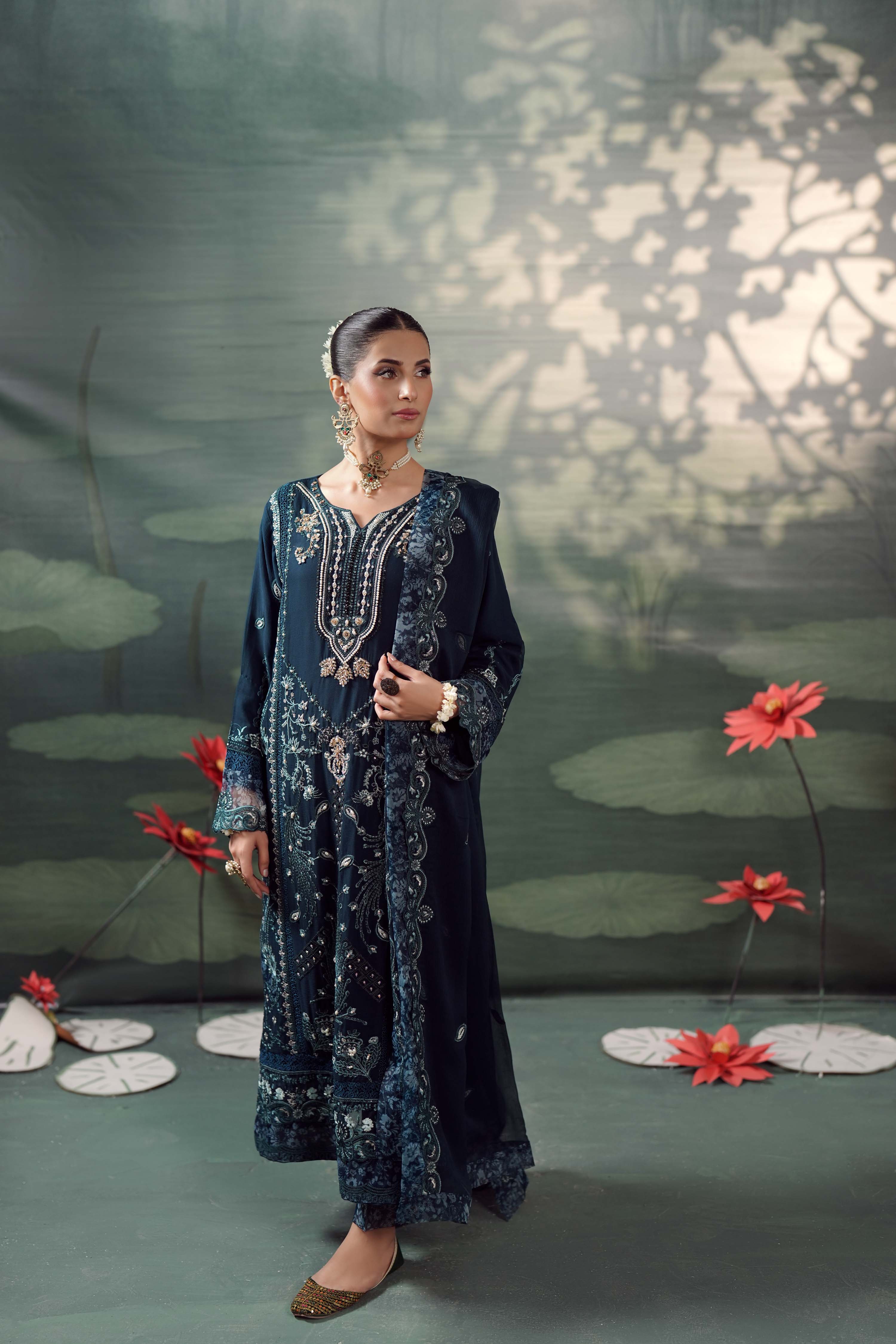 Summary: Radiate sophistication in this Navy Blue Pakistani Chiffon Suit, a masterpiece from the Silvaana collection. The ready-to-wear kameez is crafted from sheer luxury chiffon, meticulously adorned with silver-toned embroidery, pearl handwork, and intricate cutwork sleeves that define formal elegance. Perfectly suited for wedding guests and evening parties, this ensemble blends traditional artistry with modern style. The lightweight fabric makes it an ideal choice for Spring/Summer festivities. Whether for a reception or a formal dinner, this embroidered Pakistani dress promises a regal look. Shop this exquisite formal pret outfit online to capture the essence of celebration.