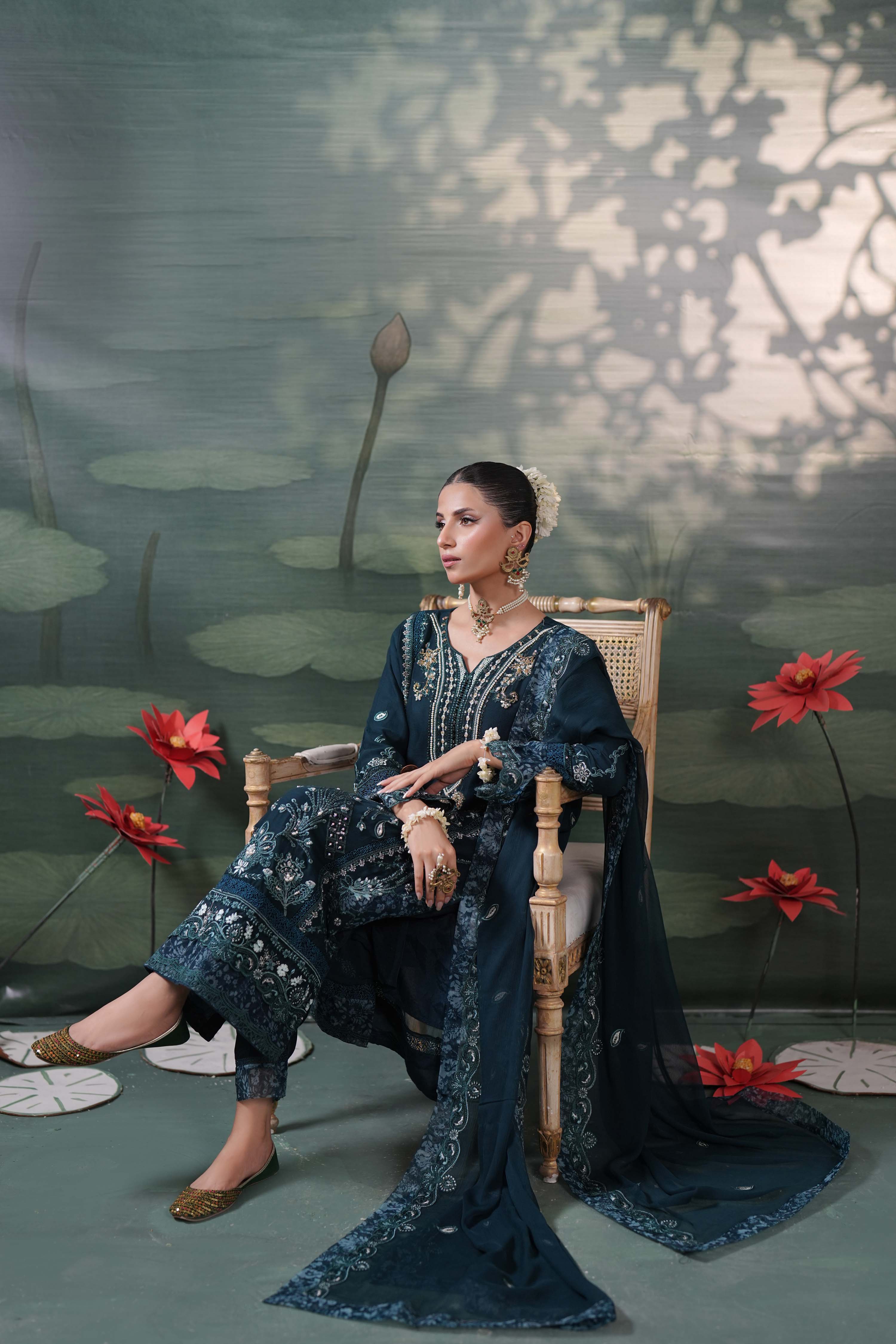Dupatta: The matching chiffon dupatta is gracefully finished with fine embroidery, cutwork, and a striking four-sided printed organza border, adding sophistication to every drape.