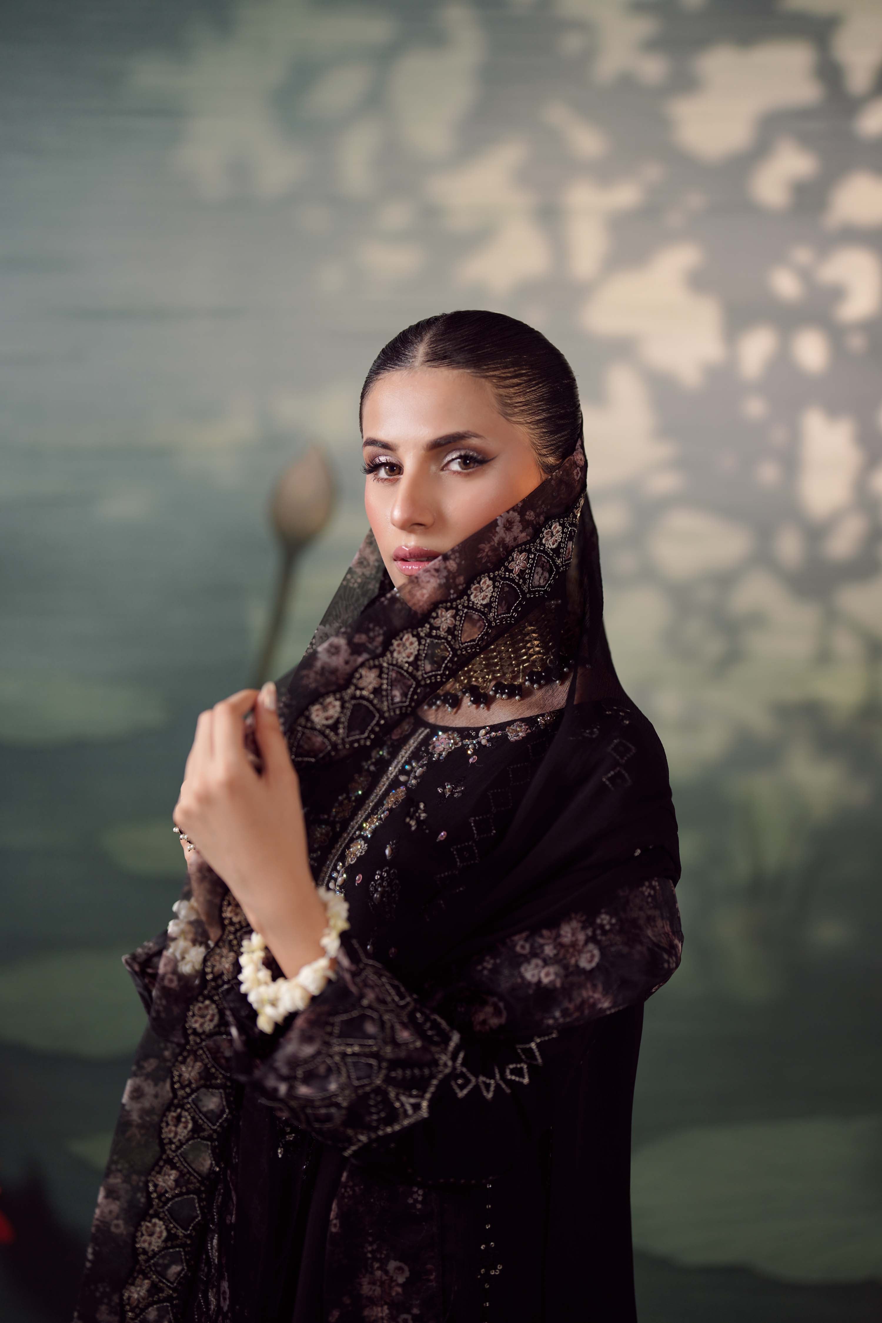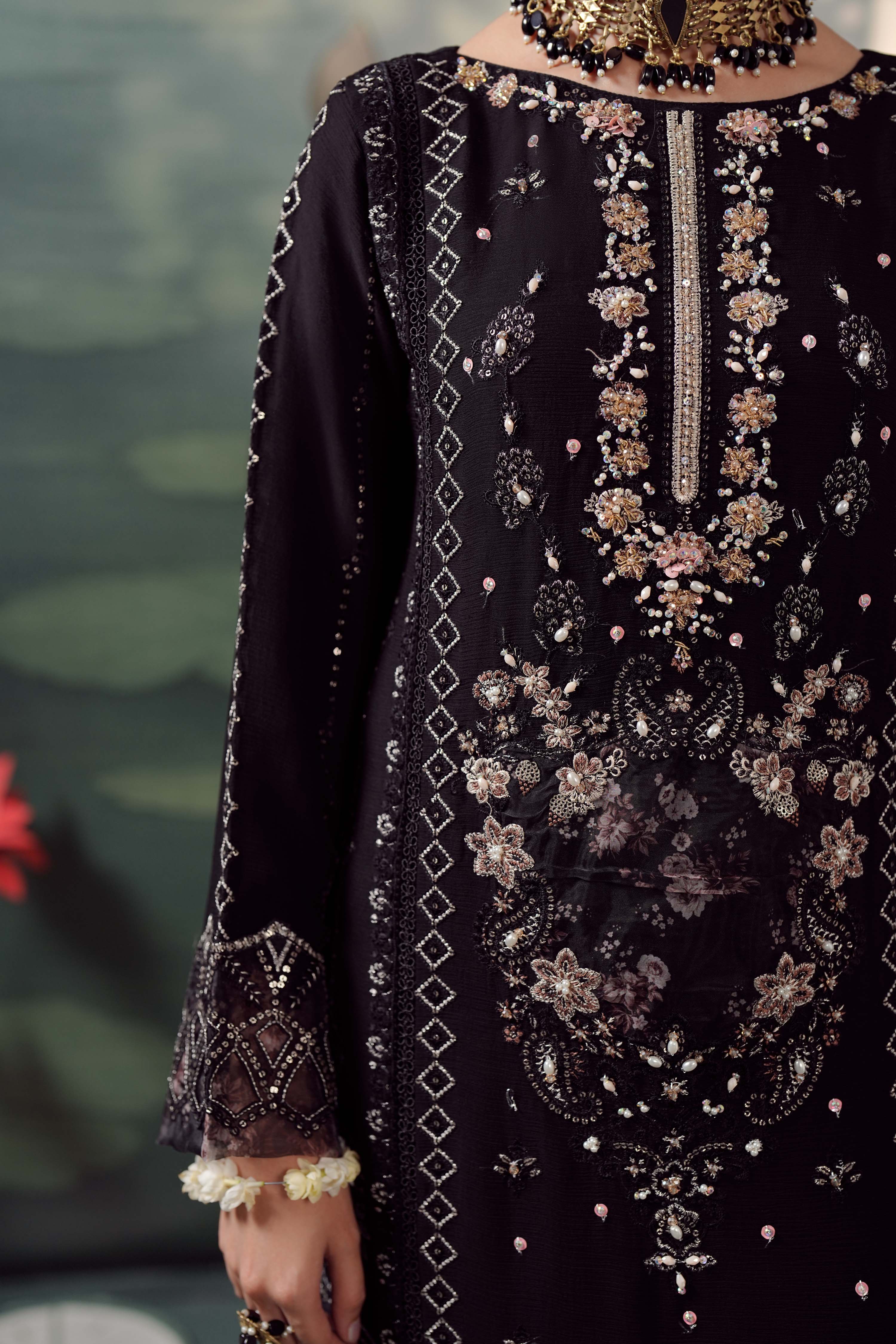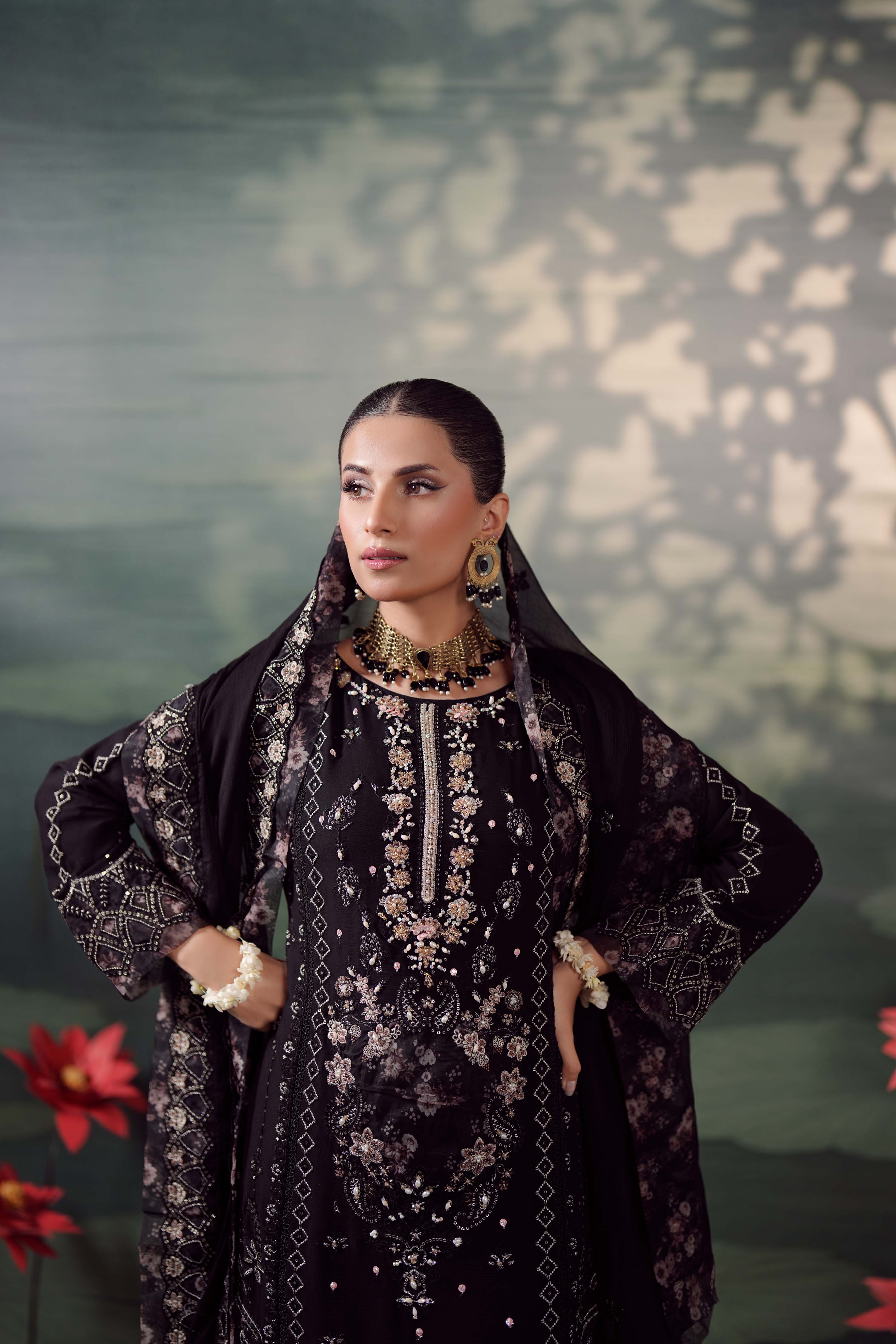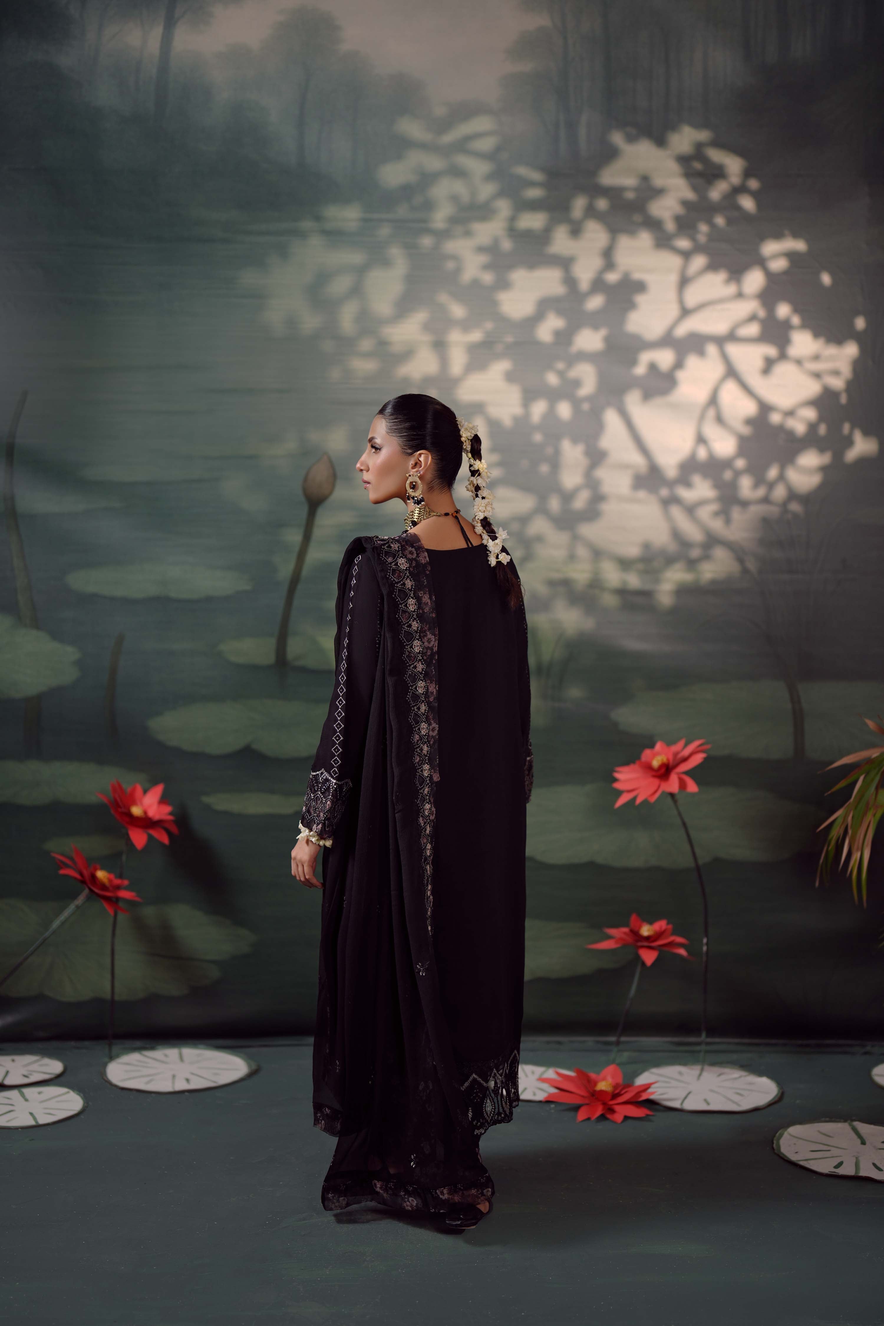 Summary: Elevate your evening style with the 'Reha' ensemble from Guzel. This stunning Black Pakistani Suit is crafted from luxury Chiffon, featuring rich embroidery, artistic cutwork, and delicate lacework on the kameez. The shirt includes a soft viscose inner, ensuring comfort for Spring/Summer festivities and formal gatherings. With sophisticated neck handwork and printed organza details, this outfit is an impeccable choice for wedding guests or upscale party wear. This 3-piece embroidered suit perfectly blends traditional grace with modern elegance. Shop this authentic designer dress online to make a lasting impression at your next special occasion.
