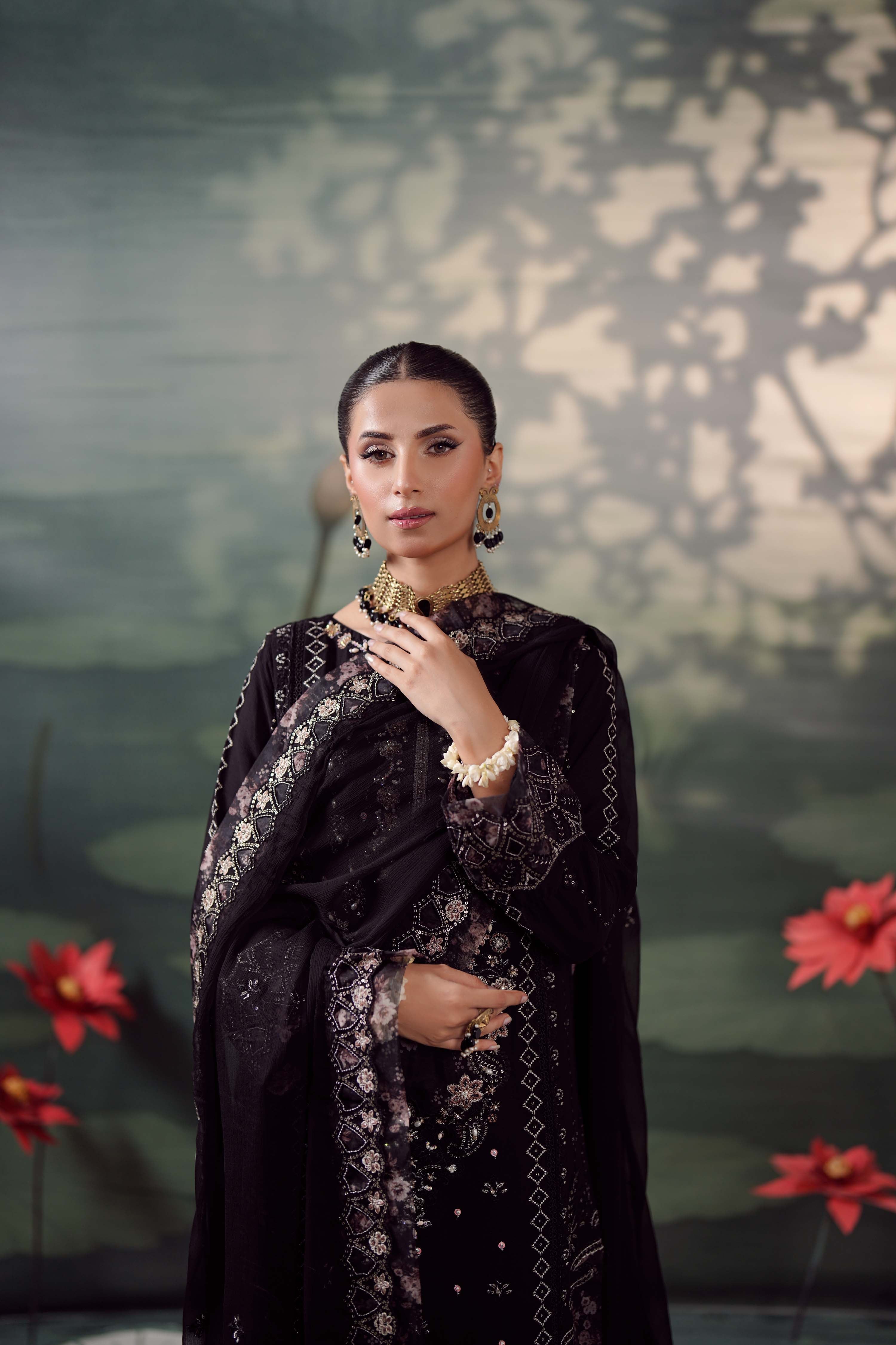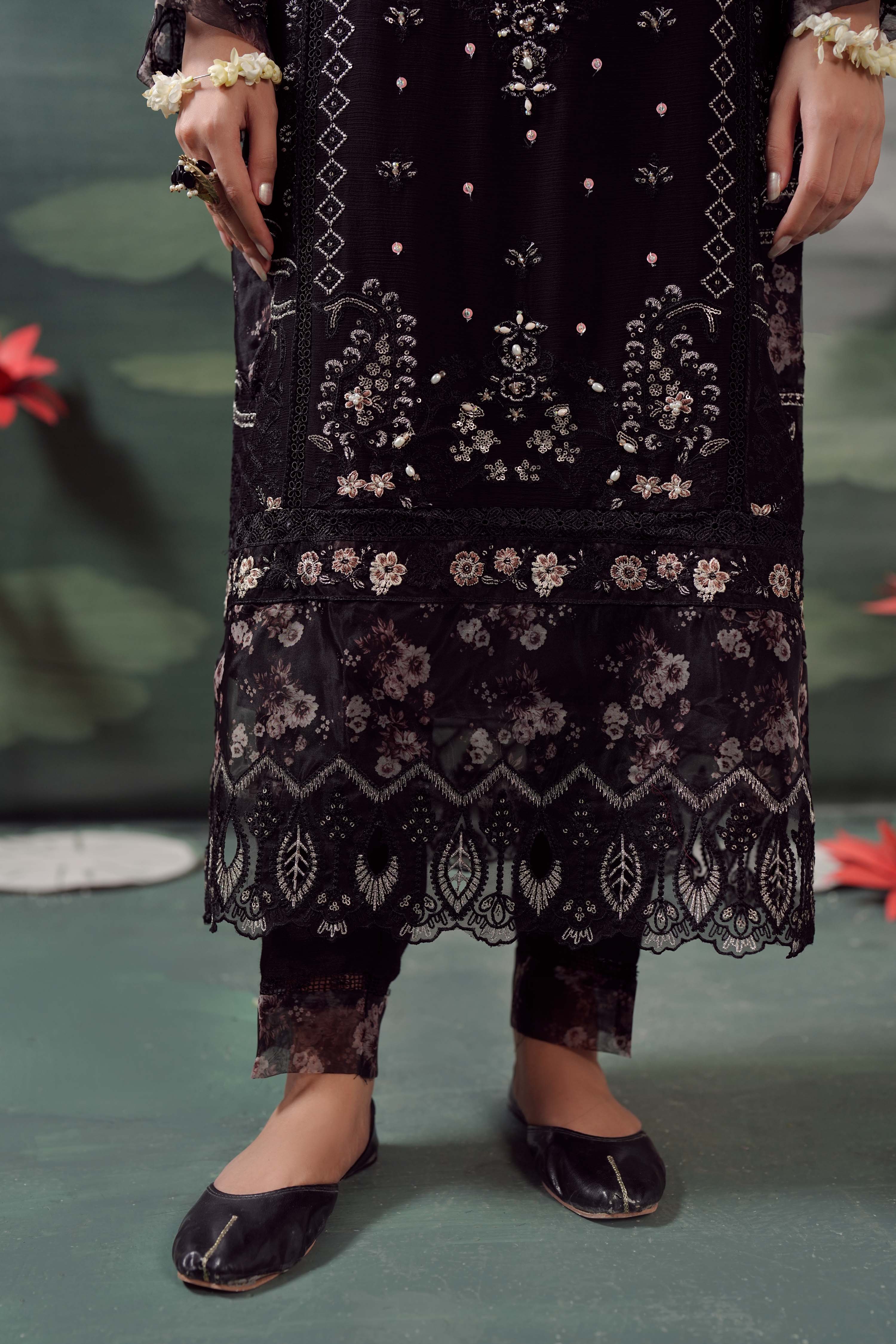 Dupatta: The matching chiffon dupatta is gracefully finished with fine embroidery, cutwork, and a striking four-sided printed organza border, adding sophistication to every drape.