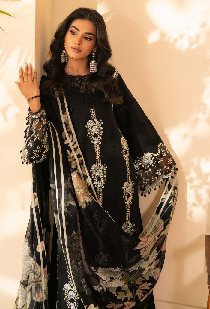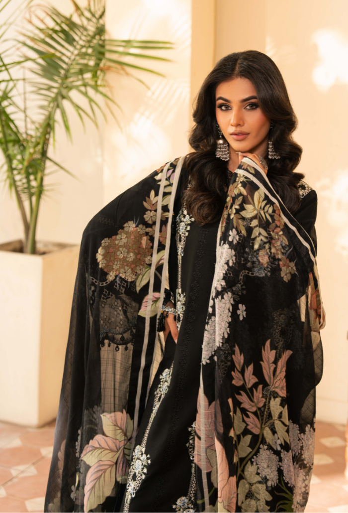 Summary: Step into elegance with this stunning Black Pakistani Lawn Suit, a masterpiece from the Humdum Mehrmaa collection. Designed for the sophisticated woman, this unstitched dress material features a premium embroidered lawn shirt highlighted by delicate vertical floral motifs and intricate organza borders on the sleeves and neckline. The look is completed with a printed slub chiffon dupatta that adds a soft, breezy touch, making it the perfect choice for Summer Fashion. Whether for a formal dinner or a festive gathering, this outfit defines class. Shop this ethnic wear online and embrace the timeless appeal of black for your next Party Wear occasion.