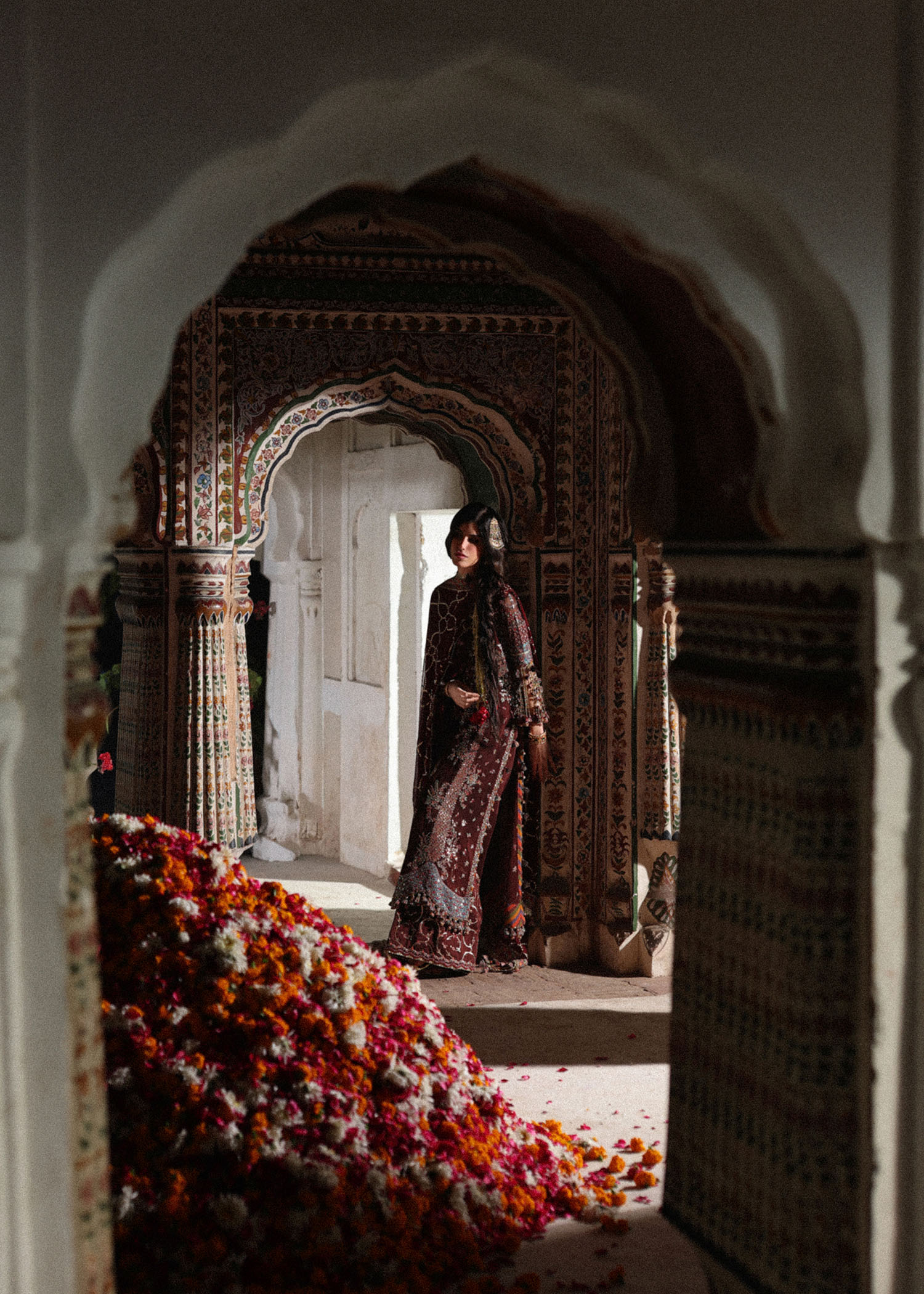 Elegantly crafted, this dark brown chiffon shirt is designed to exude timeless sophistication. The chiffon shirt features intricate embroidery and multicolor chatapatti trims that add refined texture and graceful detail. The outfit is completed with an embroidered Korean raw silk trouser, offering a structured yet comfortable silhouette that balances elegance with modern style. Completing the look is a matching chiffon foil-printed dupatta adorned with a subtle print, lending a soft shimmer and luxurious appeal.