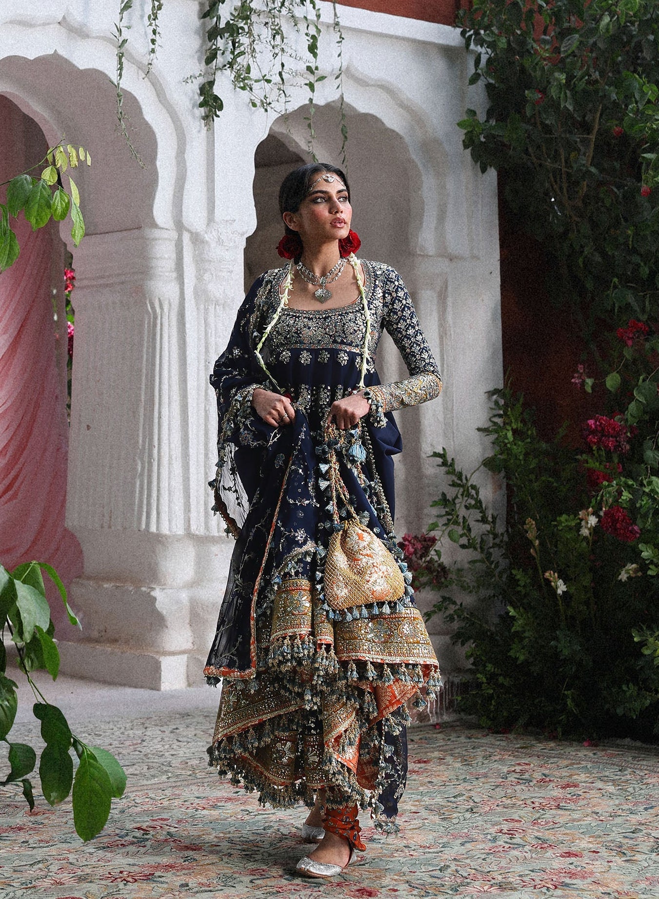 Summary: Embrace regal elegance with the 'Nain Tara' by Hussain Rehar, a stunning navy blue Pakistani suit. This festive wear is crafted from luxurious Korean raw silk, featuring a flowing pishwas silhouette. The entire dress is richly adorned with intricate embroidery, creating a sophisticated look. The silk fabric offers a graceful drape, making it suitable for Spring/Summer celebrations. The deep, formal navy blue hue makes this ethnic wear an exceptional choice for evening functions and weddings, embodying traditional Pakistani craftsmanship. This outfit is an ideal statement piece for any grand celebration or formal event.