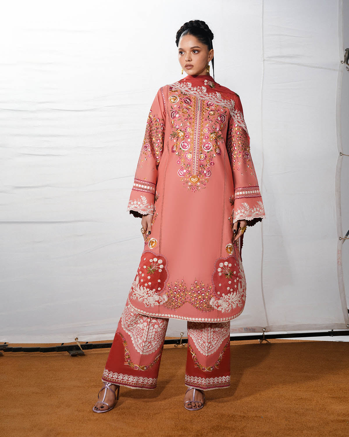 A long pink shirt adorned with multicolor floral ghara embroidery is elegantly enhanced with organza patches on the daaman, while the bell sleeves feature matching embroidered borders, creating a refined and graceful silhouette. The ensemble is paired with matching embroidered trousers accented with organza borders, and a monochrome embroidered chiffon dupatta completes the look with a delicate, sophisticated finish.