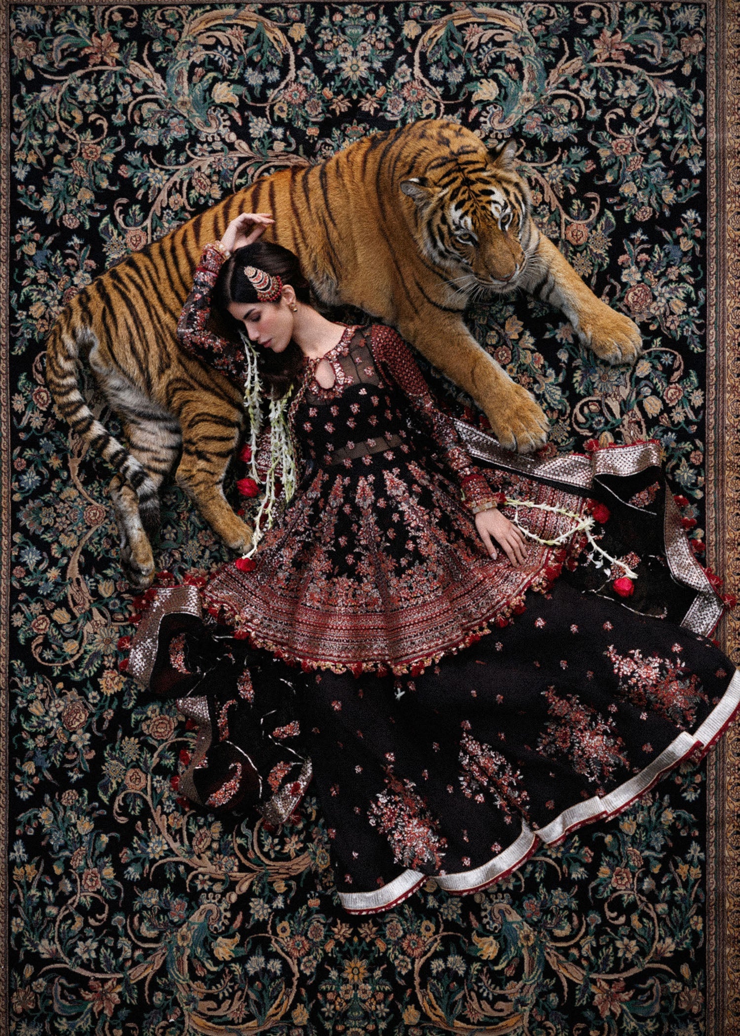 This striking black ensemble is a statement of timeless sophistication and refined elegance. The embroidered peplum is beautifully detailed with intricate panels, creating a bold yet graceful look. It is paired with a gracefully flared embroidered sharara, adding volume and fluid movement to the silhouette. Completing the ensemble is a matching embroidered dupatta, adorned with delicate detailing and finished with four-sided borders for a rich, luxurious appeal. Perfect for festive celebrations and formal occasions, this outfit beautifully blends classic charm with contemporary style.