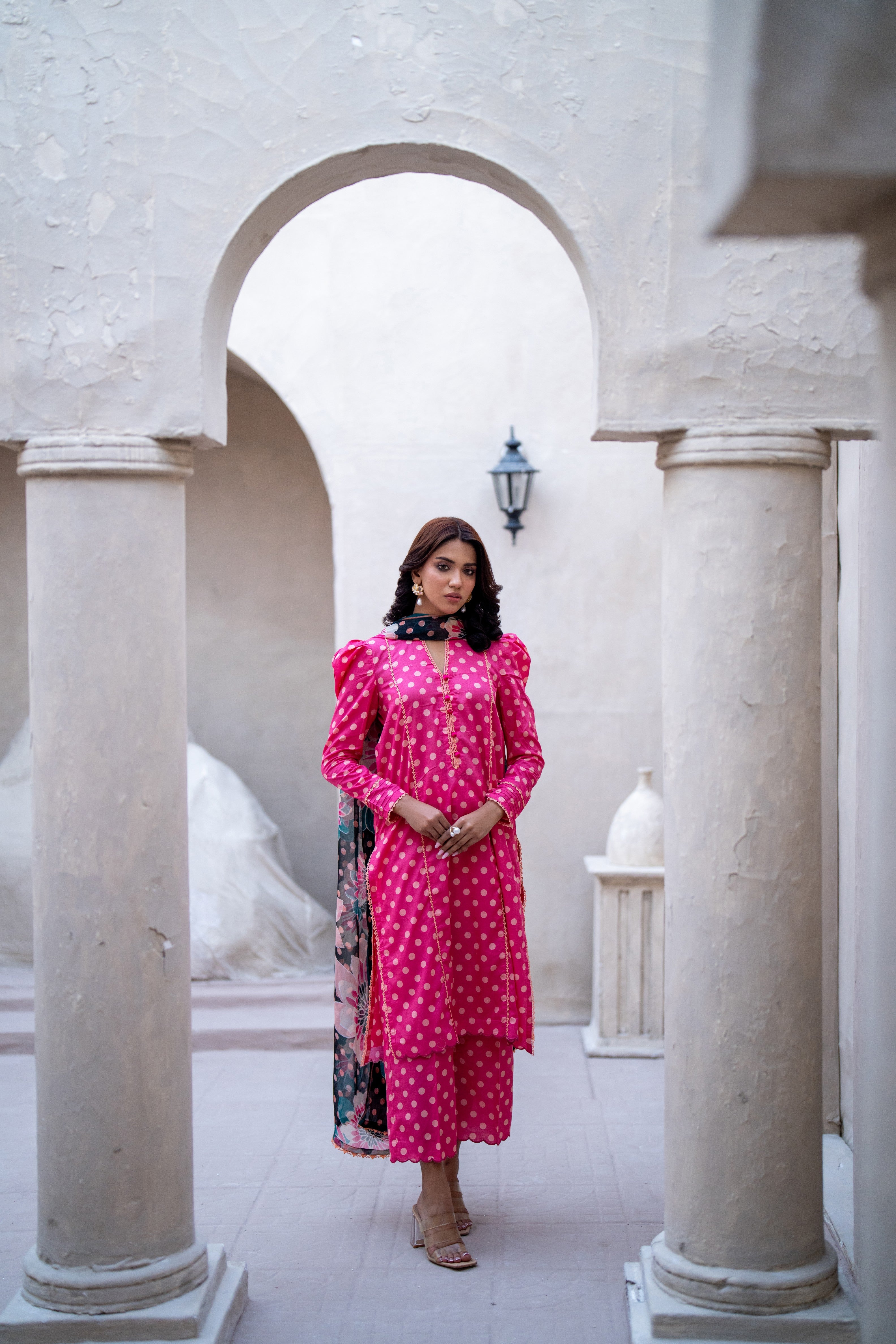 Summary: Introducing the Identic Separates Lawn with Chiffon Dupatta – IDSBDV1-5 by Regalia Textiles. This vibrant three-piece Pakistani suit showcases a playful pink printed lawn cotton kameez, perfect for adding a pop of color to your wardrobe. The shirt is adorned with a delicate print, adding a touch of charm to the overall design. It comes unstitched, allowing you to tailor it to your exact measurements and preferred style. Paired with dyed cotton trousers for a comfortable and breathable feel, this ensemble is ideal for warm weather. The accompanying chiffon dupatta, adorned with a striking print, adds a touch of elegance and completes the look. This versatile suit is perfect for casual everyday wear, offering both comfort and style. Crafted from high-quality lawn cotton, it's breathable and lightweight, making it a must-have for the spring/summer season. Whether it's a casual lunch, a day out with friends, or a family gathering, this suit offers the perfect blend of style and comfort. This authentic Pakistani suit promises a vibrant and fashionable look for any occasion. Add a touch of elegance to your wardrobe with this beautiful and versatile suit today!